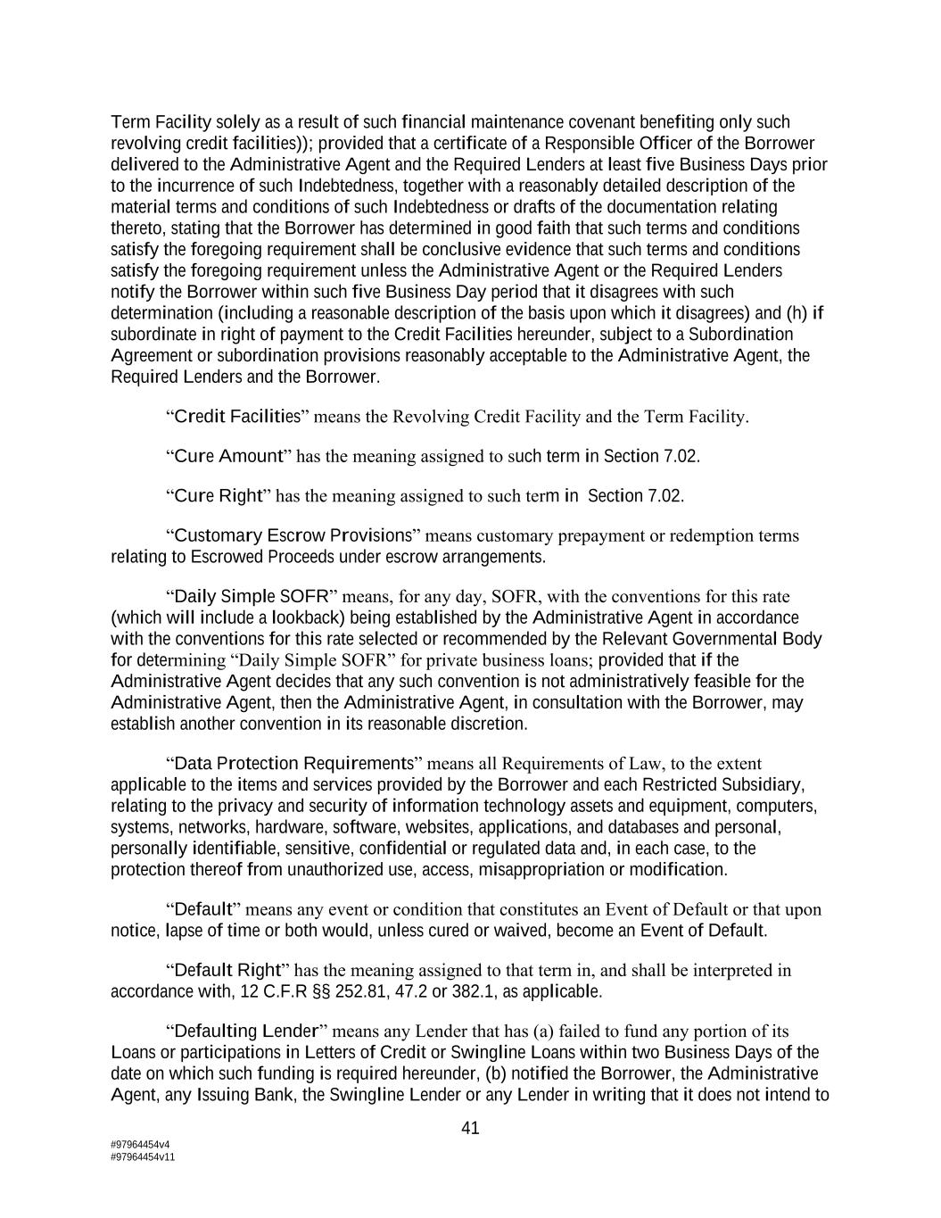 41 #97964454v4 #97964454v11 Term Facility solely as a result of such financial maintenance covenant benefiting only such revolving credit facilities)); provided that a certificate of a Responsible Officer of the Borrower delivered to the Administrative Agent and the Required Lenders at least five Business Days prior to the incurrence of such Indebtedness, together with a reasonably detailed description of the material terms and conditions of such Indebtedness or drafts of the documentation relating thereto, stating that the Borrower has determined in good faith that such terms and conditions satisfy the foregoing requirement shall be conclusive evidence that such terms and conditions satisfy the foregoing requirement unless the Administrative Agent or the Required Lenders notify the Borrower within such five Business Day period that it disagrees with such determination (including a reasonable description of the basis upon which it disagrees) and (h) if subordinate in right of payment to the Credit Facilities hereunder, subject to a Subordination Agreement or subordination provisions reasonably acceptable to the Administrative Agent, the Required Lenders and the Borrower. “Credit Facilities” means the Revolving Credit Facility and the Term Facility. “Cure Amount” has the meaning assigned to such term in Section 7.02. “Cure Right” has the meaning assigned to such term in Section 7.02. “Customary Escrow Provisions” means customary prepayment or redemption terms relating to Escrowed Proceeds under escrow arrangements. “Daily Simple SOFR” means, for any day, SOFR, with the conventions for this rate (which will include a lookback) being established by the Administrative Agent in accordance with the conventions for this rate selected or recommended by the Relevant Governmental Body for determining “Daily Simple SOFR” for private business loans; provided that if the Administrative Agent decides that any such convention is not administratively feasible for the Administrative Agent, then the Administrative Agent, in consultation with the Borrower, may establish another convention in its reasonable discretion. “Data Protection Requirements” means all Requirements of Law, to the extent applicable to the items and services provided by the Borrower and each Restricted Subsidiary, relating to the privacy and security of information technology assets and equipment, computers, systems, networks, hardware, software, websites, applications, and databases and personal, personally identifiable, sensitive, confidential or regulated data and, in each case, to the protection thereof from unauthorized use, access, misappropriation or modification. “Default” means any event or condition that constitutes an Event of Default or that upon notice, lapse of time or both would, unless cured or waived, become an Event of Default. “Default Right” has the meaning assigned to that term in, and shall be interpreted in accordance with, 12 C.F.R §§ 252.81, 47.2 or 382.1, as applicable. “Defaulting Lender” means any Lender that has (a) failed to fund any portion of its Loans or participations in Letters of Credit or Swingline Loans within two Business Days of the date on which such funding is required hereunder, (b) notified the Borrower, the Administrative Agent, any Issuing Bank, the Swingline Lender or any Lender in writing that it does not intend to