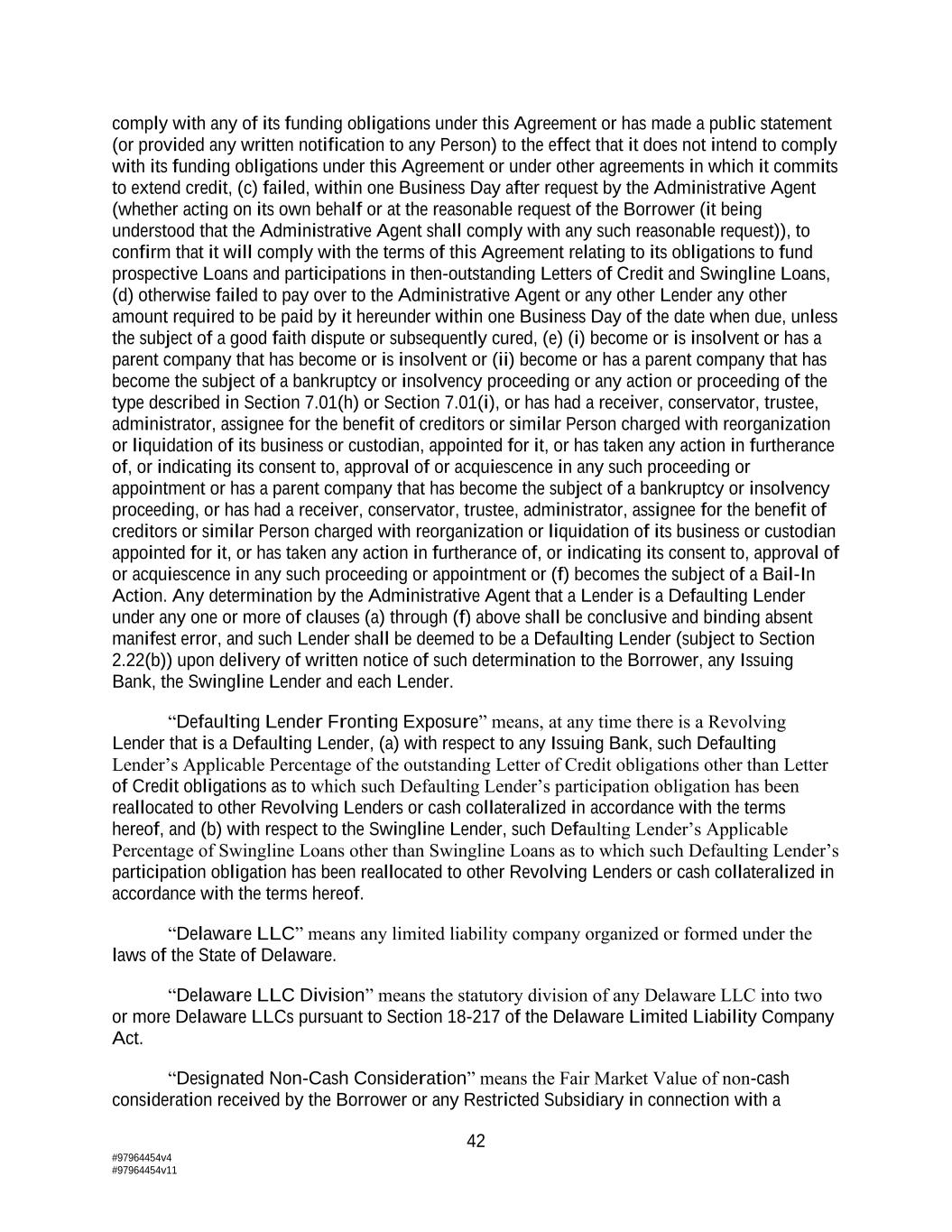 42 #97964454v4 #97964454v11 comply with any of its funding obligations under this Agreement or has made a public statement (or provided any written notification to any Person) to the effect that it does not intend to comply with its funding obligations under this Agreement or under other agreements in which it commits to extend credit, (c) failed, within one Business Day after request by the Administrative Agent (whether acting on its own behalf or at the reasonable request of the Borrower (it being understood that the Administrative Agent shall comply with any such reasonable request)), to confirm that it will comply with the terms of this Agreement relating to its obligations to fund prospective Loans and participations in then-outstanding Letters of Credit and Swingline Loans, (d) otherwise failed to pay over to the Administrative Agent or any other Lender any other amount required to be paid by it hereunder within one Business Day of the date when due, unless the subject of a good faith dispute or subsequently cured, (e) (i) become or is insolvent or has a parent company that has become or is insolvent or (ii) become or has a parent company that has become the subject of a bankruptcy or insolvency proceeding or any action or proceeding of the type described in Section 7.01(h) or Section 7.01(i), or has had a receiver, conservator, trustee, administrator, assignee for the benefit of creditors or similar Person charged with reorganization or liquidation of its business or custodian, appointed for it, or has taken any action in furtherance of, or indicating its consent to, approval of or acquiescence in any such proceeding or appointment or has a parent company that has become the subject of a bankruptcy or insolvency proceeding, or has had a receiver, conservator, trustee, administrator, assignee for the benefit of creditors or similar Person charged with reorganization or liquidation of its business or custodian appointed for it, or has taken any action in furtherance of, or indicating its consent to, approval of or acquiescence in any such proceeding or appointment or (f) becomes the subject of a Bail-In Action. Any determination by the Administrative Agent that a Lender is a Defaulting Lender under any one or more of clauses (a) through (f) above shall be conclusive and binding absent manifest error, and such Lender shall be deemed to be a Defaulting Lender (subject to Section 2.22(b)) upon delivery of written notice of such determination to the Borrower, any Issuing Bank, the Swingline Lender and each Lender. “Defaulting Lender Fronting Exposure” means, at any time there is a Revolving Lender that is a Defaulting Lender, (a) with respect to any Issuing Bank, such Defaulting Lender’s Applicable Percentage of the outstanding Letter of Credit obligations other than Letter of Credit obligations as to which such Defaulting Lender’s participation obligation has been reallocated to other Revolving Lenders or cash collateralized in accordance with the terms hereof, and (b) with respect to the Swingline Lender, such Defaulting Lender’s Applicable Percentage of Swingline Loans other than Swingline Loans as to which such Defaulting Lender’s participation obligation has been reallocated to other Revolving Lenders or cash collateralized in accordance with the terms hereof. “Delaware LLC” means any limited liability company organized or formed under the laws of the State of Delaware. “Delaware LLC Division” means the statutory division of any Delaware LLC into two or more Delaware LLCs pursuant to Section 18-217 of the Delaware Limited Liability Company Act. “Designated Non-Cash Consideration” means the Fair Market Value of non-cash consideration received by the Borrower or any Restricted Subsidiary in connection with a