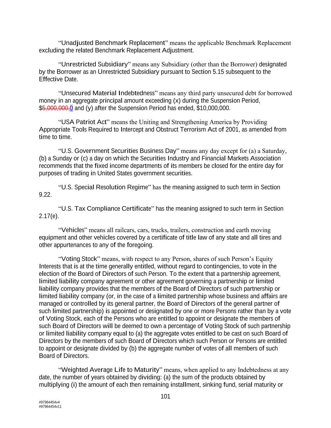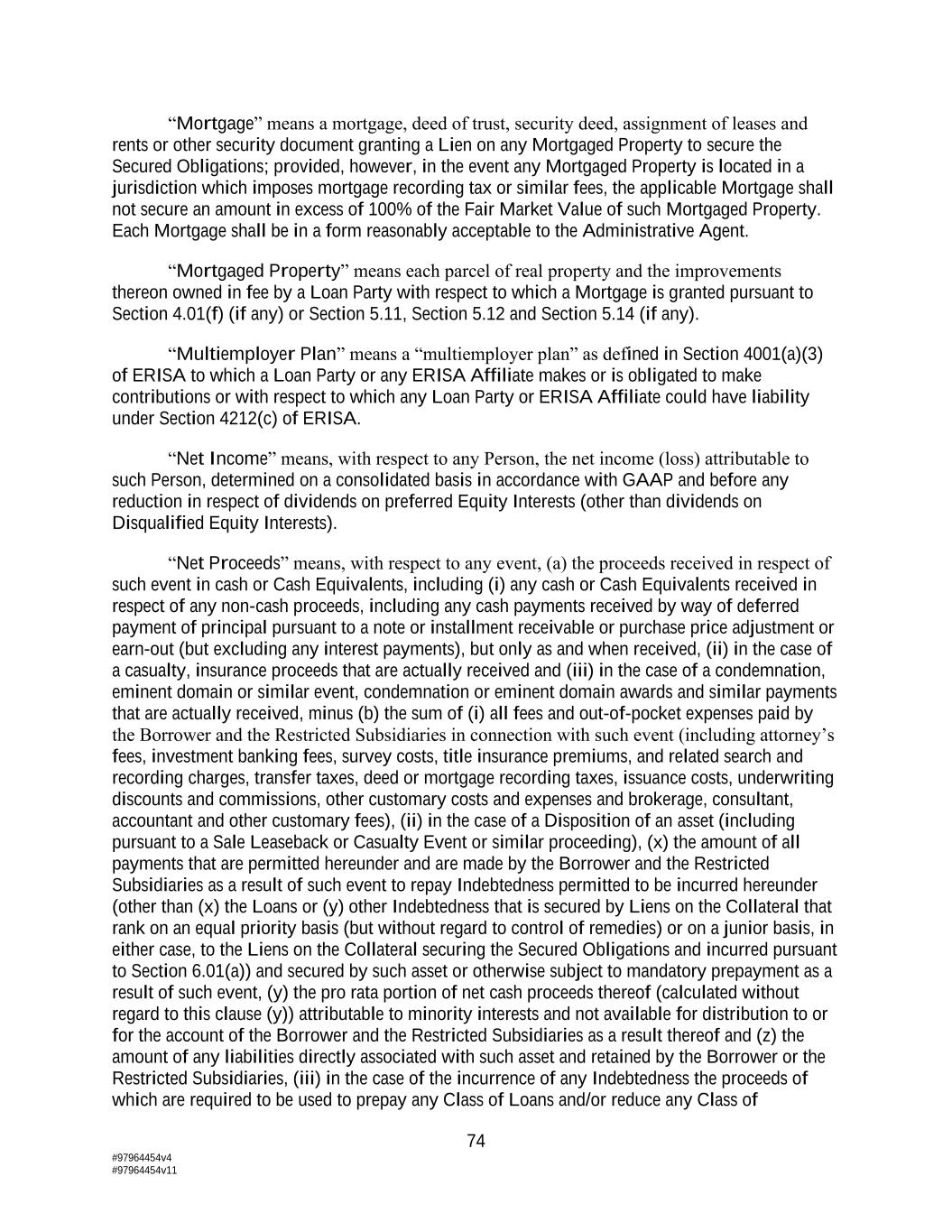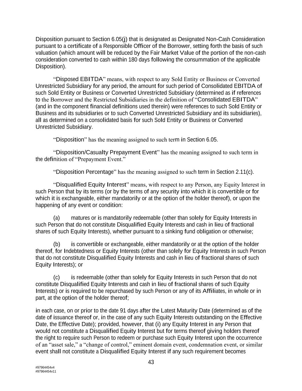 43 #97964454v4 #97964454v11 Disposition pursuant to Section 6.05(j) that is designated as Designated Non-Cash Consideration pursuant to a certificate of a Responsible Officer of the Borrower, setting forth the basis of such valuation (which amount will be reduced by the Fair Market Value of the portion of the non-cash consideration converted to cash within 180 days following the consummation of the applicable Disposition). “Disposed EBITDA” means, with respect to any Sold Entity or Business or Converted Unrestricted Subsidiary for any period, the amount for such period of Consolidated EBITDA of such Sold Entity or Business or Converted Unrestricted Subsidiary (determined as if references to the Borrower and the Restricted Subsidiaries in the definition of “Consolidated EBITDA” (and in the component financial definitions used therein) were references to such Sold Entity or Business and its subsidiaries or to such Converted Unrestricted Subsidiary and its subsidiaries), all as determined on a consolidated basis for such Sold Entity or Business or Converted Unrestricted Subsidiary. “Disposition” has the meaning assigned to such term in Section 6.05. “Disposition/Casualty Prepayment Event” has the meaning assigned to such term in the definition of “Prepayment Event.” “Disposition Percentage” has the meaning assigned to such term in Section 2.11(c). “Disqualified Equity Interest” means, with respect to any Person, any Equity Interest in such Person that by its terms (or by the terms of any security into which it is convertible or for which it is exchangeable, either mandatorily or at the option of the holder thereof), or upon the happening of any event or condition: (a) matures or is mandatorily redeemable (other than solely for Equity Interests in such Person that do not constitute Disqualified Equity Interests and cash in lieu of fractional shares of such Equity Interests), whether pursuant to a sinking fund obligation or otherwise; (b) is convertible or exchangeable, either mandatorily or at the option of the holder thereof, for Indebtedness or Equity Interests (other than solely for Equity Interests in such Person that do not constitute Disqualified Equity Interests and cash in lieu of fractional shares of such Equity Interests); or (c) is redeemable (other than solely for Equity Interests in such Person that do not constitute Disqualified Equity Interests and cash in lieu of fractional shares of such Equity Interests) or is required to be repurchased by such Person or any of its Affiliates, in whole or in part, at the option of the holder thereof; in each case, on or prior to the date 91 days after the Latest Maturity Date (determined as of the date of issuance thereof or, in the case of any such Equity Interests outstanding on the Effective Date, the Effective Date); provided, however, that (i) any Equity Interest in any Person that would not constitute a Disqualified Equity Interest but for terms thereof giving holders thereof the right to require such Person to redeem or purchase such Equity Interest upon the occurrence of an “asset sale,” a “change of control,” eminent domain event, condemnation event, or similar event shall not constitute a Disqualified Equity Interest if any such requirement becomes