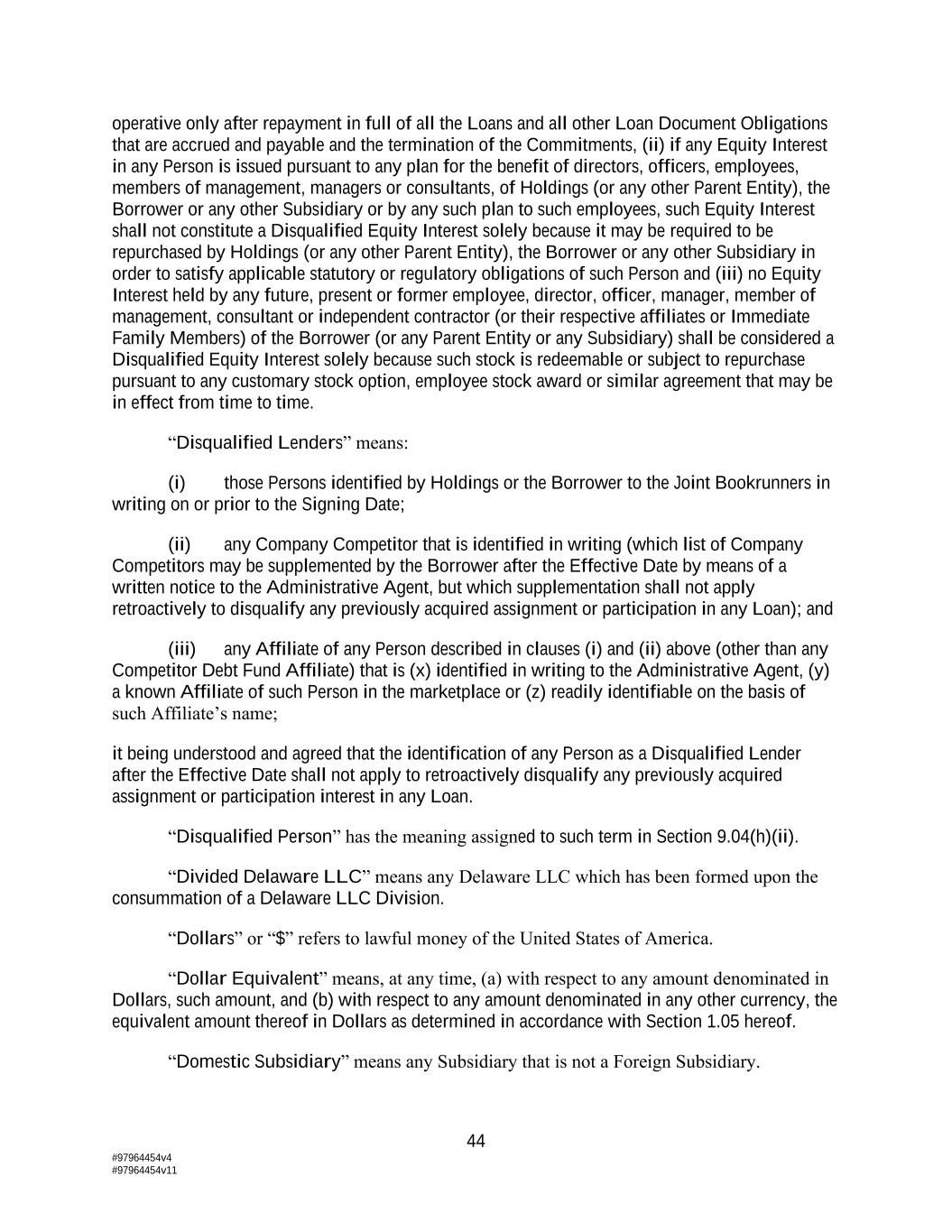 44 #97964454v4 #97964454v11 operative only after repayment in full of all the Loans and all other Loan Document Obligations that are accrued and payable and the termination of the Commitments, (ii) if any Equity Interest in any Person is issued pursuant to any plan for the benefit of directors, officers, employees, members of management, managers or consultants, of Holdings (or any other Parent Entity), the Borrower or any other Subsidiary or by any such plan to such employees, such Equity Interest shall not constitute a Disqualified Equity Interest solely because it may be required to be repurchased by Holdings (or any other Parent Entity), the Borrower or any other Subsidiary in order to satisfy applicable statutory or regulatory obligations of such Person and (iii) no Equity Interest held by any future, present or former employee, director, officer, manager, member of management, consultant or independent contractor (or their respective affiliates or Immediate Family Members) of the Borrower (or any Parent Entity or any Subsidiary) shall be considered a Disqualified Equity Interest solely because such stock is redeemable or subject to repurchase pursuant to any customary stock option, employee stock award or similar agreement that may be in effect from time to time. “Disqualified Lenders” means: (i) those Persons identified by Holdings or the Borrower to the Joint Bookrunners in writing on or prior to the Signing Date; (ii) any Company Competitor that is identified in writing (which list of Company Competitors may be supplemented by the Borrower after the Effective Date by means of a written notice to the Administrative Agent, but which supplementation shall not apply retroactively to disqualify any previously acquired assignment or participation in any Loan); and (iii) any Affiliate of any Person described in clauses (i) and (ii) above (other than any Competitor Debt Fund Affiliate) that is (x) identified in writing to the Administrative Agent, (y) a known Affiliate of such Person in the marketplace or (z) readily identifiable on the basis of such Affiliate’s name; it being understood and agreed that the identification of any Person as a Disqualified Lender after the Effective Date shall not apply to retroactively disqualify any previously acquired assignment or participation interest in any Loan. “Disqualified Person” has the meaning assigned to such term in Section 9.04(h)(ii). “Divided Delaware LLC” means any Delaware LLC which has been formed upon the consummation of a Delaware LLC Division. “Dollars” or “$” refers to lawful money of the United States of America. “Dollar Equivalent” means, at any time, (a) with respect to any amount denominated in Dollars, such amount, and (b) with respect to any amount denominated in any other currency, the equivalent amount thereof in Dollars as determined in accordance with Section 1.05 hereof. “Domestic Subsidiary” means any Subsidiary that is not a Foreign Subsidiary.