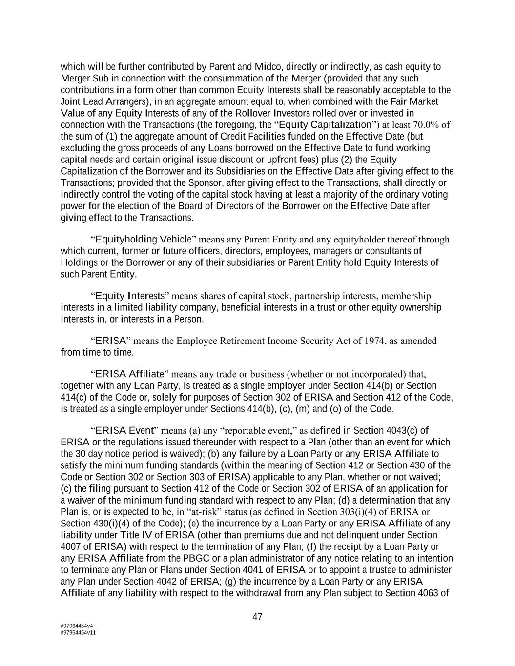 47 #97964454v4 #97964454v11 which will be further contributed by Parent and Midco, directly or indirectly, as cash equity to Merger Sub in connection with the consummation of the Merger (provided that any such contributions in a form other than common Equity Interests shall be reasonably acceptable to the Joint Lead Arrangers), in an aggregate amount equal to, when combined with the Fair Market Value of any Equity Interests of any of the Rollover Investors rolled over or invested in connection with the Transactions (the foregoing, the “Equity Capitalization”) at least 70.0% of the sum of (1) the aggregate amount of Credit Facilities funded on the Effective Date (but excluding the gross proceeds of any Loans borrowed on the Effective Date to fund working capital needs and certain original issue discount or upfront fees) plus (2) the Equity Capitalization of the Borrower and its Subsidiaries on the Effective Date after giving effect to the Transactions; provided that the Sponsor, after giving effect to the Transactions, shall directly or indirectly control the voting of the capital stock having at least a majority of the ordinary voting power for the election of the Board of Directors of the Borrower on the Effective Date after giving effect to the Transactions. “Equityholding Vehicle” means any Parent Entity and any equityholder thereof through which current, former or future officers, directors, employees, managers or consultants of Holdings or the Borrower or any of their subsidiaries or Parent Entity hold Equity Interests of such Parent Entity. “Equity Interests” means shares of capital stock, partnership interests, membership interests in a limited liability company, beneficial interests in a trust or other equity ownership interests in, or interests in a Person. “ERISA” means the Employee Retirement Income Security Act of 1974, as amended from time to time. “ERISA Affiliate” means any trade or business (whether or not incorporated) that, together with any Loan Party, is treated as a single employer under Section 414(b) or Section 414(c) of the Code or, solely for purposes of Section 302 of ERISA and Section 412 of the Code, is treated as a single employer under Sections 414(b), (c), (m) and (o) of the Code. “ERISA Event” means (a) any “reportable event,” as defined in Section 4043(c) of ERISA or the regulations issued thereunder with respect to a Plan (other than an event for which the 30 day notice period is waived); (b) any failure by a Loan Party or any ERISA Affiliate to satisfy the minimum funding standards (within the meaning of Section 412 or Section 430 of the Code or Section 302 or Section 303 of ERISA) applicable to any Plan, whether or not waived; (c) the filing pursuant to Section 412 of the Code or Section 302 of ERISA of an application for a waiver of the minimum funding standard with respect to any Plan; (d) a determination that any Plan is, or is expected to be, in “at-risk” status (as defined in Section 303(i)(4) of ERISA or Section 430(i)(4) of the Code); (e) the incurrence by a Loan Party or any ERISA Affiliate of any liability under Title IV of ERISA (other than premiums due and not delinquent under Section 4007 of ERISA) with respect to the termination of any Plan; (f) the receipt by a Loan Party or any ERISA Affiliate from the PBGC or a plan administrator of any notice relating to an intention to terminate any Plan or Plans under Section 4041 of ERISA or to appoint a trustee to administer any Plan under Section 4042 of ERISA; (g) the incurrence by a Loan Party or any ERISA Affiliate of any liability with respect to the withdrawal from any Plan subject to Section 4063 of