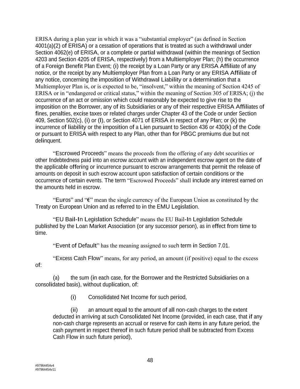 48 #97964454v4 #97964454v11 ERISA during a plan year in which it was a “substantial employer” (as defined in Section 4001(a)(2) of ERISA) or a cessation of operations that is treated as such a withdrawal under Section 4062(e) of ERISA, or a complete or partial withdrawal (within the meanings of Section 4203 and Section 4205 of ERISA, respectively) from a Multiemployer Plan; (h) the occurrence of a Foreign Benefit Plan Event; (i) the receipt by a Loan Party or any ERISA Affiliate of any notice, or the receipt by any Multiemployer Plan from a Loan Party or any ERISA Affiliate of any notice, concerning the imposition of Withdrawal Liability or a determination that a Multiemployer Plan is, or is expected to be, “insolvent,” within the meaning of Section 4245 of ERISA or in “endangered or critical status,” within the meaning of Section 305 of ERISA; (j) the occurrence of an act or omission which could reasonably be expected to give rise to the imposition on the Borrower, any of its Subsidiaries or any of their respective ERISA Affiliates of fines, penalties, excise taxes or related charges under Chapter 43 of the Code or under Section 409, Section 502(c), (i) or (l), or Section 4071 of ERISA in respect of any Plan; or (k) the incurrence of liability or the imposition of a Lien pursuant to Section 436 or 430(k) of the Code or pursuant to ERISA with respect to any Plan, other than for PBGC premiums due but not delinquent. “Escrowed Proceeds” means the proceeds from the offering of any debt securities or other Indebtedness paid into an escrow account with an independent escrow agent on the date of the applicable offering or incurrence pursuant to escrow arrangements that permit the release of amounts on deposit in such escrow account upon satisfaction of certain conditions or the occurrence of certain events. The term “Escrowed Proceeds” shall include any interest earned on the amounts held in escrow. “Euros” and “€” mean the single currency of the European Union as constituted by the Treaty on European Union and as referred to in the EMU Legislation. “EU Bail-In Legislation Schedule” means the EU Bail-In Legislation Schedule published by the Loan Market Association (or any successor person), as in effect from time to time. “Event of Default” has the meaning assigned to such term in Section 7.01. “Excess Cash Flow” means, for any period, an amount (if positive) equal to the excess of: (a) the sum (in each case, for the Borrower and the Restricted Subsidiaries on a consolidated basis), without duplication, of: (i) Consolidated Net Income for such period, (ii) an amount equal to the amount of all non-cash charges to the extent deducted in arriving at such Consolidated Net Income (provided, in each case, that if any non-cash charge represents an accrual or reserve for cash items in any future period, the cash payment in respect thereof in such future period shall be subtracted from Excess Cash Flow in such future period),