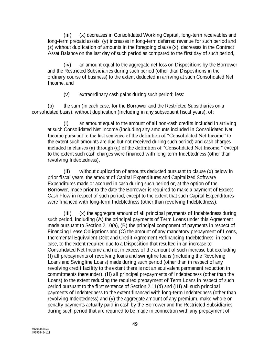 49 #97964454v4 #97964454v11 (iii) (x) decreases in Consolidated Working Capital, long-term receivables and long-term prepaid assets, (y) increases in long-term deferred revenue for such period and (z) without duplication of amounts in the foregoing clause (x), decreases in the Contract Asset Balance on the last day of such period as compared to the first day of such period, (iv) an amount equal to the aggregate net loss on Dispositions by the Borrower and the Restricted Subsidiaries during such period (other than Dispositions in the ordinary course of business) to the extent deducted in arriving at such Consolidated Net Income, and (v) extraordinary cash gains during such period; less: (b) the sum (in each case, for the Borrower and the Restricted Subsidiaries on a consolidated basis), without duplication (including in any subsequent fiscal years), of: (i) an amount equal to the amount of all non-cash credits included in arriving at such Consolidated Net Income (including any amounts included in Consolidated Net Income pursuant to the last sentence of the definition of “Consolidated Net Income” to the extent such amounts are due but not received during such period) and cash charges included in clauses (a) through (q) of the definition of “Consolidated Net Income,” except to the extent such cash charges were financed with long-term Indebtedness (other than revolving Indebtedness), (ii) without duplication of amounts deducted pursuant to clause (x) below in prior fiscal years, the amount of Capital Expenditures and Capitalized Software Expenditures made or accrued in cash during such period or, at the option of the Borrower, made prior to the date the Borrower is required to make a payment of Excess Cash Flow in respect of such period, except to the extent that such Capital Expenditures were financed with long-term Indebtedness (other than revolving Indebtedness), (iii) (x) the aggregate amount of all principal payments of Indebtedness during such period, including (A) the principal payments of Term Loans under this Agreement made pursuant to Section 2.10(a), (B) the principal component of payments in respect of Financing Lease Obligations and (C) the amount of any mandatory prepayment of Loans, Incremental Equivalent Debt and Credit Agreement Refinancing Indebtedness, in each case, to the extent required due to a Disposition that resulted in an increase to Consolidated Net Income and not in excess of the amount of such increase but excluding (I) all prepayments of revolving loans and swingline loans (including the Revolving Loans and Swingline Loans) made during such period (other than in respect of any revolving credit facility to the extent there is not an equivalent permanent reduction in commitments thereunder), (II) all principal prepayments of Indebtedness (other than the Loans) to the extent reducing the required prepayment of Term Loans in respect of such period pursuant to the first sentence of Section 2.11(d) and (III) all such principal payments of Indebtedness to the extent financed with long-term Indebtedness (other than revolving Indebtedness) and (y) the aggregate amount of any premium, make-whole or penalty payments actually paid in cash by the Borrower and the Restricted Subsidiaries during such period that are required to be made in connection with any prepayment of