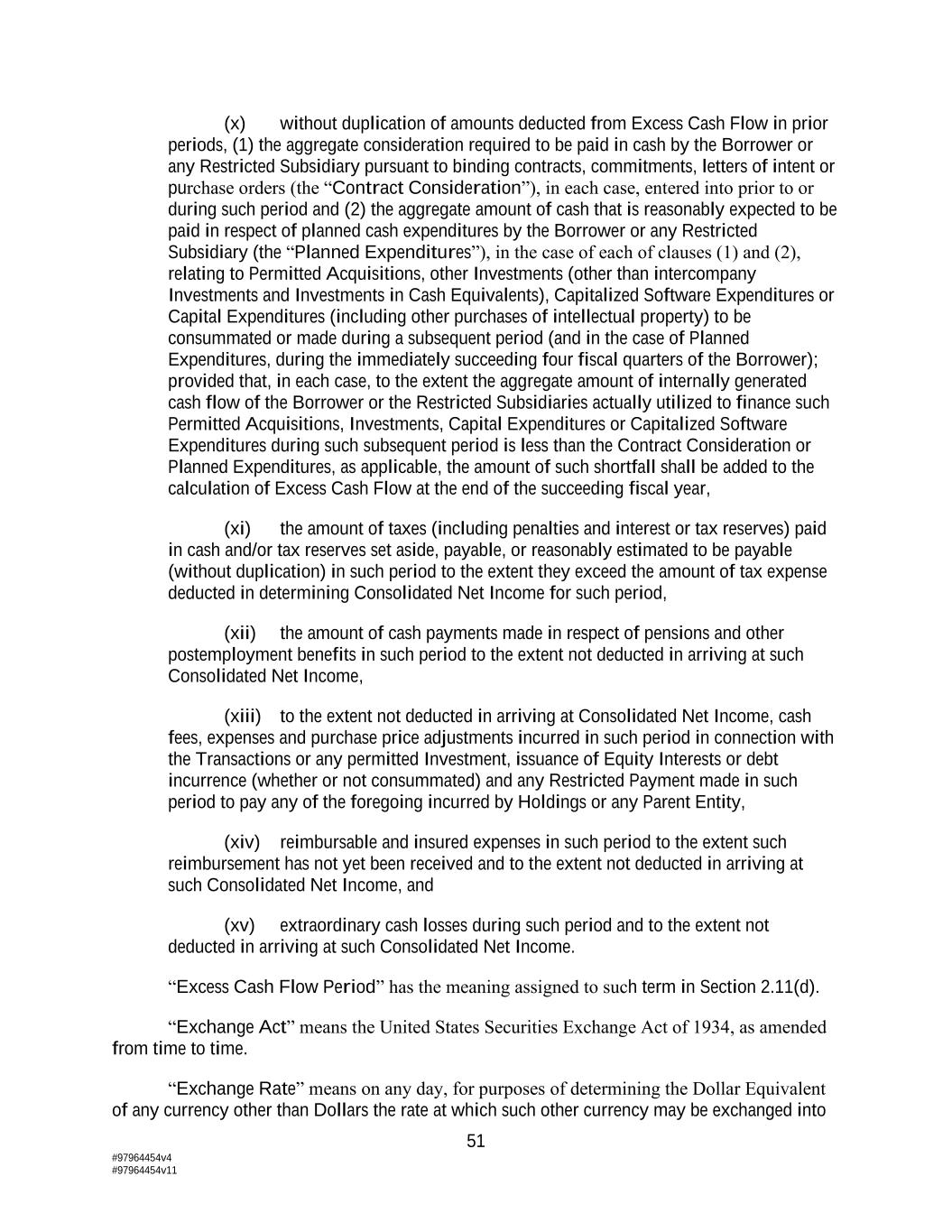 51 #97964454v4 #97964454v11 (x) without duplication of amounts deducted from Excess Cash Flow in prior periods, (1) the aggregate consideration required to be paid in cash by the Borrower or any Restricted Subsidiary pursuant to binding contracts, commitments, letters of intent or purchase orders (the “Contract Consideration”), in each case, entered into prior to or during such period and (2) the aggregate amount of cash that is reasonably expected to be paid in respect of planned cash expenditures by the Borrower or any Restricted Subsidiary (the “Planned Expenditures”), in the case of each of clauses (1) and (2), relating to Permitted Acquisitions, other Investments (other than intercompany Investments and Investments in Cash Equivalents), Capitalized Software Expenditures or Capital Expenditures (including other purchases of intellectual property) to be consummated or made during a subsequent period (and in the case of Planned Expenditures, during the immediately succeeding four fiscal quarters of the Borrower); provided that, in each case, to the extent the aggregate amount of internally generated cash flow of the Borrower or the Restricted Subsidiaries actually utilized to finance such Permitted Acquisitions, Investments, Capital Expenditures or Capitalized Software Expenditures during such subsequent period is less than the Contract Consideration or Planned Expenditures, as applicable, the amount of such shortfall shall be added to the calculation of Excess Cash Flow at the end of the succeeding fiscal year, (xi) the amount of taxes (including penalties and interest or tax reserves) paid in cash and/or tax reserves set aside, payable, or reasonably estimated to be payable (without duplication) in such period to the extent they exceed the amount of tax expense deducted in determining Consolidated Net Income for such period, (xii) the amount of cash payments made in respect of pensions and other postemployment benefits in such period to the extent not deducted in arriving at such Consolidated Net Income, (xiii) to the extent not deducted in arriving at Consolidated Net Income, cash fees, expenses and purchase price adjustments incurred in such period in connection with the Transactions or any permitted Investment, issuance of Equity Interests or debt incurrence (whether or not consummated) and any Restricted Payment made in such period to pay any of the foregoing incurred by Holdings or any Parent Entity, (xiv) reimbursable and insured expenses in such period to the extent such reimbursement has not yet been received and to the extent not deducted in arriving at such Consolidated Net Income, and (xv) extraordinary cash losses during such period and to the extent not deducted in arriving at such Consolidated Net Income. “Excess Cash Flow Period” has the meaning assigned to such term in Section 2.11(d). “Exchange Act” means the United States Securities Exchange Act of 1934, as amended from time to time. “Exchange Rate” means on any day, for purposes of determining the Dollar Equivalent of any currency other than Dollars the rate at which such other currency may be exchanged into