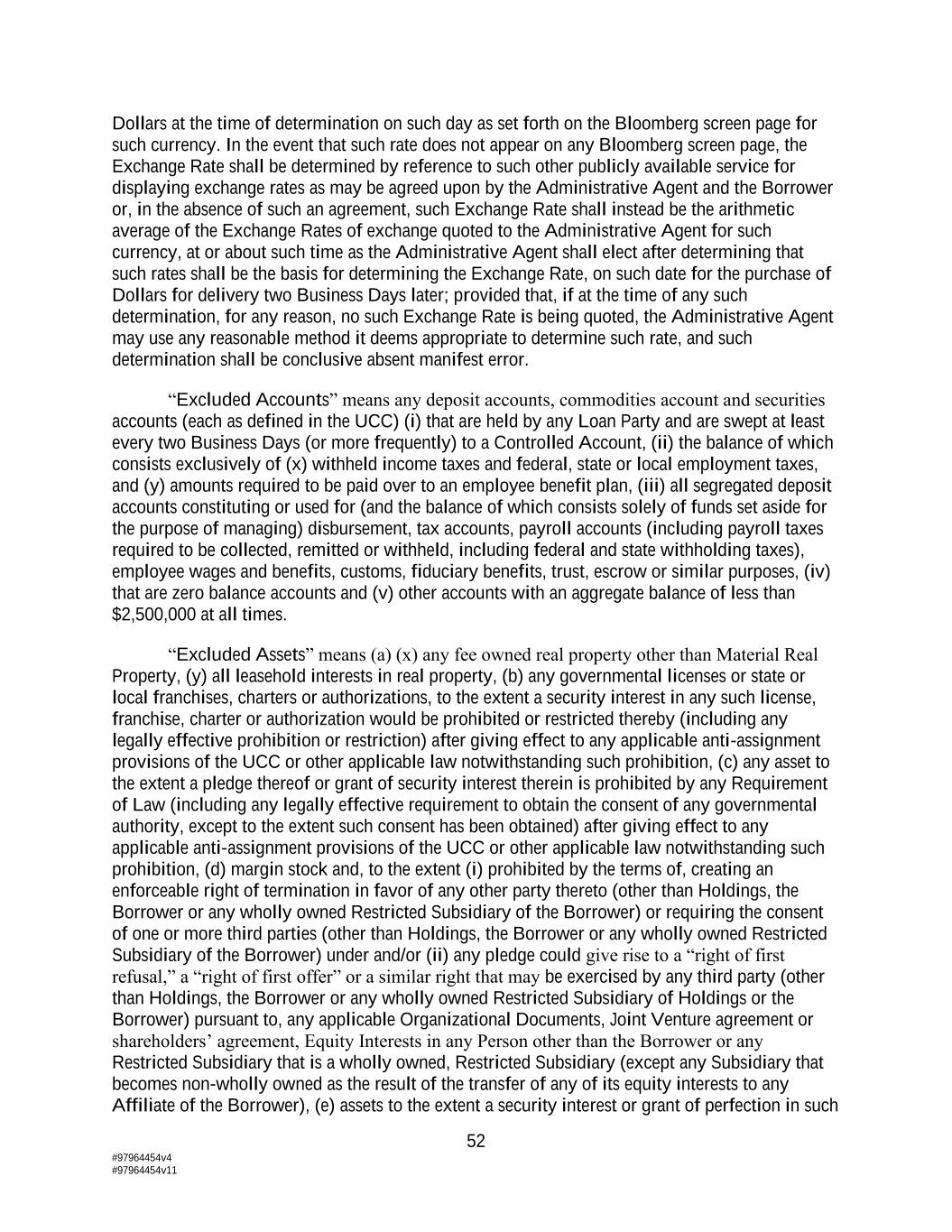 52 #97964454v4 #97964454v11 Dollars at the time of determination on such day as set forth on the Bloomberg screen page for such currency. In the event that such rate does not appear on any Bloomberg screen page, the Exchange Rate shall be determined by reference to such other publicly available service for displaying exchange rates as may be agreed upon by the Administrative Agent and the Borrower or, in the absence of such an agreement, such Exchange Rate shall instead be the arithmetic average of the Exchange Rates of exchange quoted to the Administrative Agent for such currency, at or about such time as the Administrative Agent shall elect after determining that such rates shall be the basis for determining the Exchange Rate, on such date for the purchase of Dollars for delivery two Business Days later; provided that, if at the time of any such determination, for any reason, no such Exchange Rate is being quoted, the Administrative Agent may use any reasonable method it deems appropriate to determine such rate, and such determination shall be conclusive absent manifest error. “Excluded Accounts” means any deposit accounts, commodities account and securities accounts (each as defined in the UCC) (i) that are held by any Loan Party and are swept at least every two Business Days (or more frequently) to a Controlled Account, (ii) the balance of which consists exclusively of (x) withheld income taxes and federal, state or local employment taxes, and (y) amounts required to be paid over to an employee benefit plan, (iii) all segregated deposit accounts constituting or used for (and the balance of which consists solely of funds set aside for the purpose of managing) disbursement, tax accounts, payroll accounts (including payroll taxes required to be collected, remitted or withheld, including federal and state withholding taxes), employee wages and benefits, customs, fiduciary benefits, trust, escrow or similar purposes, (iv) that are zero balance accounts and (v) other accounts with an aggregate balance of less than $2,500,000 at all times. “Excluded Assets” means (a) (x) any fee owned real property other than Material Real Property, (y) all leasehold interests in real property, (b) any governmental licenses or state or local franchises, charters or authorizations, to the extent a security interest in any such license, franchise, charter or authorization would be prohibited or restricted thereby (including any legally effective prohibition or restriction) after giving effect to any applicable anti-assignment provisions of the UCC or other applicable law notwithstanding such prohibition, (c) any asset to the extent a pledge thereof or grant of security interest therein is prohibited by any Requirement of Law (including any legally effective requirement to obtain the consent of any governmental authority, except to the extent such consent has been obtained) after giving effect to any applicable anti-assignment provisions of the UCC or other applicable law notwithstanding such prohibition, (d) margin stock and, to the extent (i) prohibited by the terms of, creating an enforceable right of termination in favor of any other party thereto (other than Holdings, the Borrower or any wholly owned Restricted Subsidiary of the Borrower) or requiring the consent of one or more third parties (other than Holdings, the Borrower or any wholly owned Restricted Subsidiary of the Borrower) under and/or (ii) any pledge could give rise to a “right of first refusal,” a “right of first offer” or a similar right that may be exercised by any third party (other than Holdings, the Borrower or any wholly owned Restricted Subsidiary of Holdings or the Borrower) pursuant to, any applicable Organizational Documents, Joint Venture agreement or shareholders’ agreement, Equity Interests in any Person other than the Borrower or any Restricted Subsidiary that is a wholly owned, Restricted Subsidiary (except any Subsidiary that becomes non-wholly owned as the result of the transfer of any of its equity interests to any Affiliate of the Borrower), (e) assets to the extent a security interest or grant of perfection in such