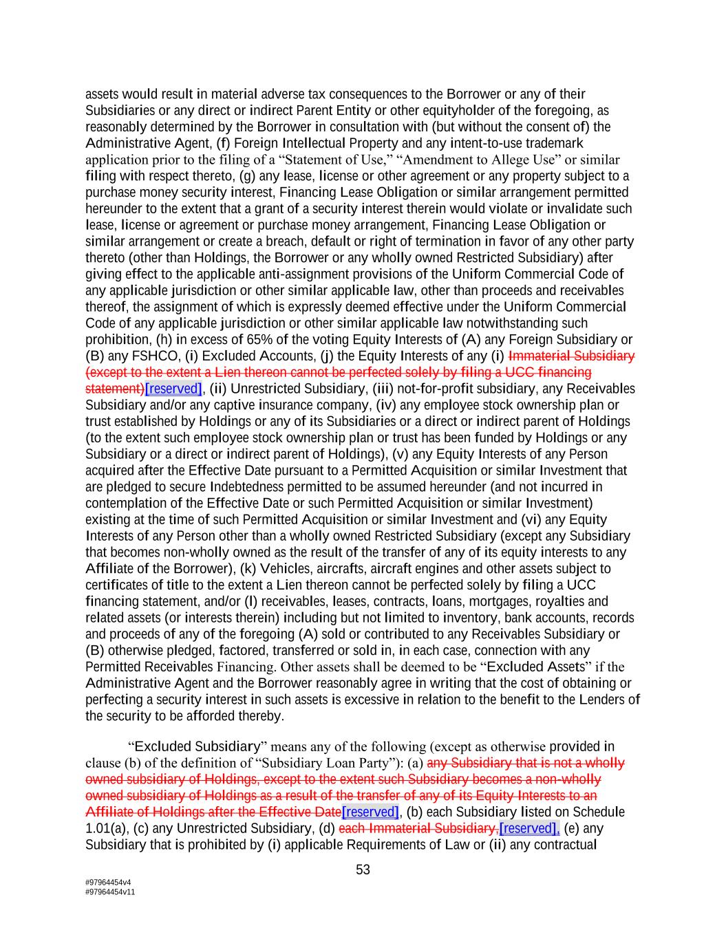 53 #97964454v4 #97964454v11 assets would result in material adverse tax consequences to the Borrower or any of their Subsidiaries or any direct or indirect Parent Entity or other equityholder of the foregoing, as reasonably determined by the Borrower in consultation with (but without the consent of) the Administrative Agent, (f) Foreign Intellectual Property and any intent-to-use trademark application prior to the filing of a “Statement of Use,” “Amendment to Allege Use” or similar filing with respect thereto, (g) any lease, license or other agreement or any property subject to a purchase money security interest, Financing Lease Obligation or similar arrangement permitted hereunder to the extent that a grant of a security interest therein would violate or invalidate such lease, license or agreement or purchase money arrangement, Financing Lease Obligation or similar arrangement or create a breach, default or right of termination in favor of any other party thereto (other than Holdings, the Borrower or any wholly owned Restricted Subsidiary) after giving effect to the applicable anti-assignment provisions of the Uniform Commercial Code of any applicable jurisdiction or other similar applicable law, other than proceeds and receivables thereof, the assignment of which is expressly deemed effective under the Uniform Commercial Code of any applicable jurisdiction or other similar applicable law notwithstanding such prohibition, (h) in excess of 65% of the voting Equity Interests of (A) any Foreign Subsidiary or (B) any FSHCO, (i) Excluded Accounts, (j) the Equity Interests of any (i) Immaterial Subsidiary (except to the extent a Lien thereon cannot be perfected solely by filing a UCC financing statement)[reserved], (ii) Unrestricted Subsidiary, (iii) not-for-profit subsidiary, any Receivables Subsidiary and/or any captive insurance company, (iv) any employee stock ownership plan or trust established by Holdings or any of its Subsidiaries or a direct or indirect parent of Holdings (to the extent such employee stock ownership plan or trust has been funded by Holdings or any Subsidiary or a direct or indirect parent of Holdings), (v) any Equity Interests of any Person acquired after the Effective Date pursuant to a Permitted Acquisition or similar Investment that are pledged to secure Indebtedness permitted to be assumed hereunder (and not incurred in contemplation of the Effective Date or such Permitted Acquisition or similar Investment) existing at the time of such Permitted Acquisition or similar Investment and (vi) any Equity Interests of any Person other than a wholly owned Restricted Subsidiary (except any Subsidiary that becomes non-wholly owned as the result of the transfer of any of its equity interests to any Affiliate of the Borrower), (k) Vehicles, aircrafts, aircraft engines and other assets subject to certificates of title to the extent a Lien thereon cannot be perfected solely by filing a UCC financing statement, and/or (l) receivables, leases, contracts, loans, mortgages, royalties and related assets (or interests therein) including but not limited to inventory, bank accounts, records and proceeds of any of the foregoing (A) sold or contributed to any Receivables Subsidiary or (B) otherwise pledged, factored, transferred or sold in, in each case, connection with any Permitted Receivables Financing. Other assets shall be deemed to be “Excluded Assets” if the Administrative Agent and the Borrower reasonably agree in writing that the cost of obtaining or perfecting a security interest in such assets is excessive in relation to the benefit to the Lenders of the security to be afforded thereby. “Excluded Subsidiary” means any of the following (except as otherwise provided in clause (b) of the definition of “Subsidiary Loan Party”): (a) any Subsidiary that is not a wholly owned subsidiary of Holdings, except to the extent such Subsidiary becomes a non-wholly owned subsidiary of Holdings as a result of the transfer of any of its Equity Interests to an Affiliate of Holdings after the Effective Date[reserved], (b) each Subsidiary listed on Schedule 1.01(a), (c) any Unrestricted Subsidiary, (d) each Immaterial Subsidiary,[reserved], (e) any Subsidiary that is prohibited by (i) applicable Requirements of Law or (ii) any contractual