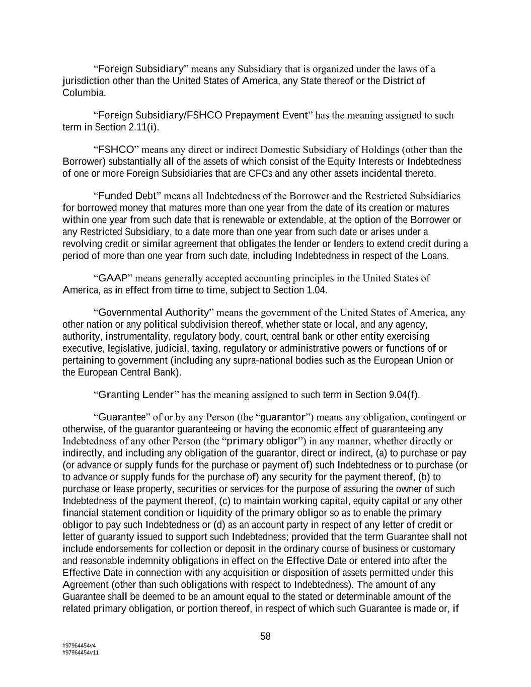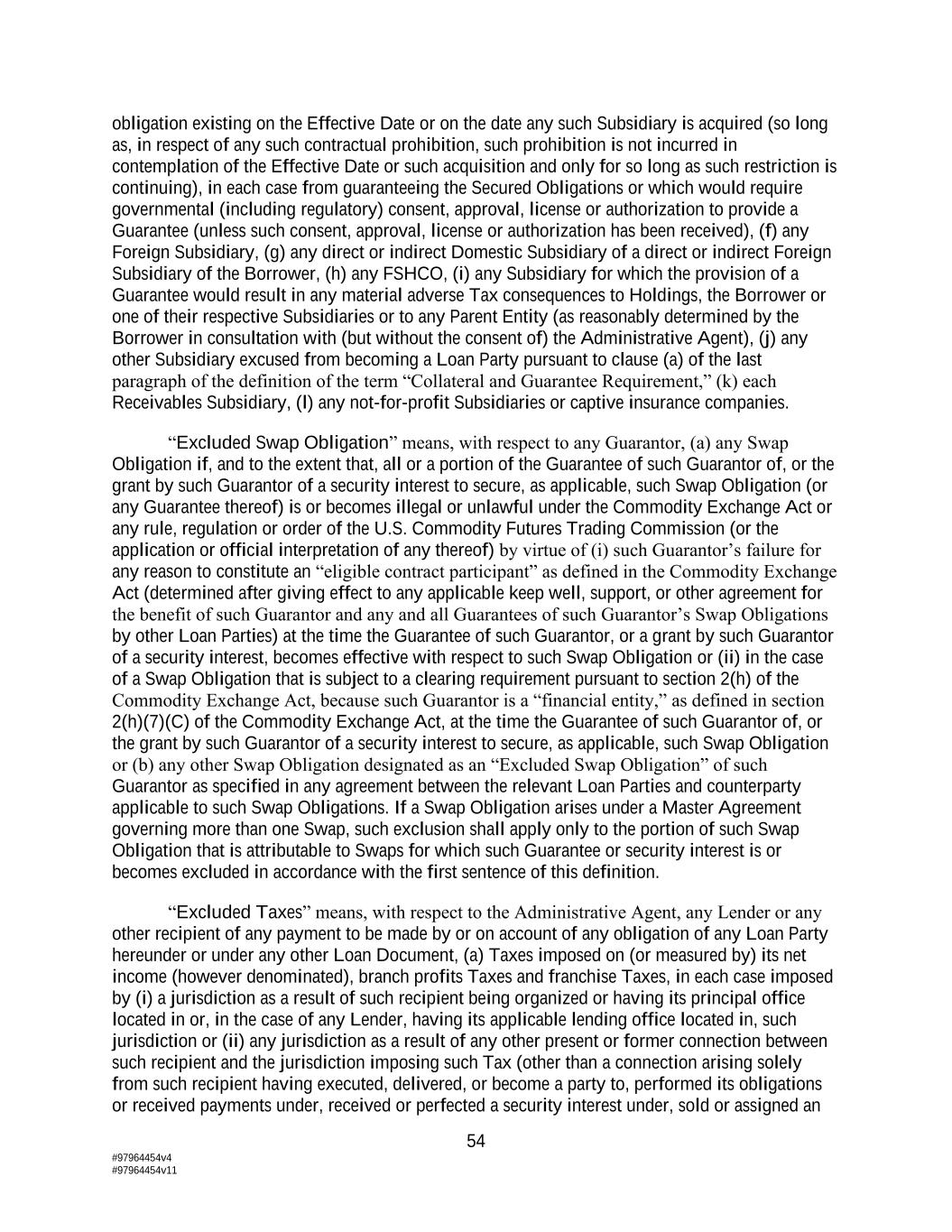 54 #97964454v4 #97964454v11 obligation existing on the Effective Date or on the date any such Subsidiary is acquired (so long as, in respect of any such contractual prohibition, such prohibition is not incurred in contemplation of the Effective Date or such acquisition and only for so long as such restriction is continuing), in each case from guaranteeing the Secured Obligations or which would require governmental (including regulatory) consent, approval, license or authorization to provide a Guarantee (unless such consent, approval, license or authorization has been received), (f) any Foreign Subsidiary, (g) any direct or indirect Domestic Subsidiary of a direct or indirect Foreign Subsidiary of the Borrower, (h) any FSHCO, (i) any Subsidiary for which the provision of a Guarantee would result in any material adverse Tax consequences to Holdings, the Borrower or one of their respective Subsidiaries or to any Parent Entity (as reasonably determined by the Borrower in consultation with (but without the consent of) the Administrative Agent), (j) any other Subsidiary excused from becoming a Loan Party pursuant to clause (a) of the last paragraph of the definition of the term “Collateral and Guarantee Requirement,” (k) each Receivables Subsidiary, (l) any not-for-profit Subsidiaries or captive insurance companies. “Excluded Swap Obligation” means, with respect to any Guarantor, (a) any Swap Obligation if, and to the extent that, all or a portion of the Guarantee of such Guarantor of, or the grant by such Guarantor of a security interest to secure, as applicable, such Swap Obligation (or any Guarantee thereof) is or becomes illegal or unlawful under the Commodity Exchange Act or any rule, regulation or order of the U.S. Commodity Futures Trading Commission (or the application or official interpretation of any thereof) by virtue of (i) such Guarantor’s failure for any reason to constitute an “eligible contract participant” as defined in the Commodity Exchange Act (determined after giving effect to any applicable keep well, support, or other agreement for the benefit of such Guarantor and any and all Guarantees of such Guarantor’s Swap Obligations by other Loan Parties) at the time the Guarantee of such Guarantor, or a grant by such Guarantor of a security interest, becomes effective with respect to such Swap Obligation or (ii) in the case of a Swap Obligation that is subject to a clearing requirement pursuant to section 2(h) of the Commodity Exchange Act, because such Guarantor is a “financial entity,” as defined in section 2(h)(7)(C) of the Commodity Exchange Act, at the time the Guarantee of such Guarantor of, or the grant by such Guarantor of a security interest to secure, as applicable, such Swap Obligation or (b) any other Swap Obligation designated as an “Excluded Swap Obligation” of such Guarantor as specified in any agreement between the relevant Loan Parties and counterparty applicable to such Swap Obligations. If a Swap Obligation arises under a Master Agreement governing more than one Swap, such exclusion shall apply only to the portion of such Swap Obligation that is attributable to Swaps for which such Guarantee or security interest is or becomes excluded in accordance with the first sentence of this definition. “Excluded Taxes” means, with respect to the Administrative Agent, any Lender or any other recipient of any payment to be made by or on account of any obligation of any Loan Party hereunder or under any other Loan Document, (a) Taxes imposed on (or measured by) its net income (however denominated), branch profits Taxes and franchise Taxes, in each case imposed by (i) a jurisdiction as a result of such recipient being organized or having its principal office located in or, in the case of any Lender, having its applicable lending office located in, such jurisdiction or (ii) any jurisdiction as a result of any other present or former connection between such recipient and the jurisdiction imposing such Tax (other than a connection arising solely from such recipient having executed, delivered, or become a party to, performed its obligations or received payments under, received or perfected a security interest under, sold or assigned an