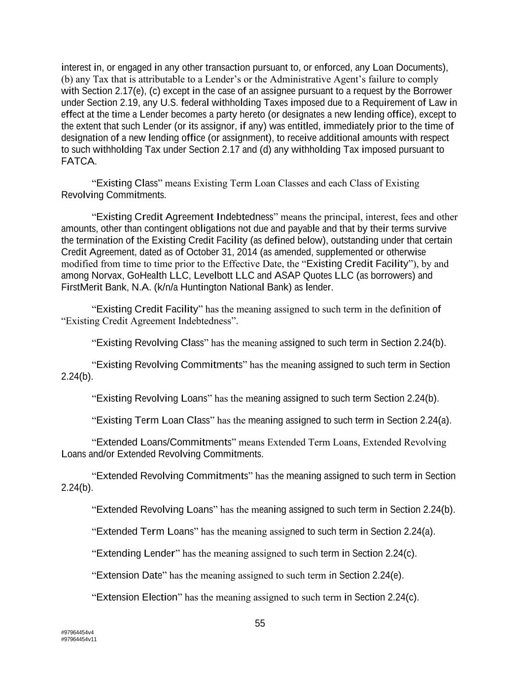235 #97964454v4 #97964454v11 person therein and irrespective of whether the indemnified losses, claims, damages, liabilities and/or related expenses arise out of, in connection with or as a result of matters arising prior to, on or after the effective date of any Loan Document. To the extent required by any applicable Requirements of Law, the Administrative Agent may withhold from any payment to any Lender an amount equivalent to any applicable withholding Tax. Without limiting or expanding the provisions of Section 2.17, each Lender shall indemnify the Administrative Agent against, and shall make payable in respect thereof within 30 days after demand therefor, any and all Taxes and any and all related losses, claims, liabilities and expenses (including fees, charges and disbursements of any counsel for the Administrative Agent) incurred by or asserted against the Administrative Agent by the IRS or any other Governmental Authority as a result of the failure of the Administrative Agent to properly withhold tax from amounts paid to or for the account of any Lender for any reason (including, without limitation, because the appropriate form was not delivered or not properly executed, or because such Lender failed to notify the Administrative Agent of a change in circumstance that rendered the exemption from, or reduction of withholding tax ineffective, or because such Lender’s failure to comply with the provisions of Section 9.04 relating to the maintenance of a Participant Register), but in each case only to the extent that any Loan Party has not already indemnified the Administrative Agent for such amounts and without limiting the obligation of the Loan Parties to do so. A certificate as to the amount of such payment or liability delivered to any Lender by the Administrative Agent shall be conclusive absent manifest error. Each Lender hereby authorizes the Administrative Agent to set off and apply any and all amounts at any time owing to such Lender under this Agreement or any other Loan Document against any amount due the Administrative Agent under this paragraph. The agreements in this paragraph shall survive the resignation and/or replacement of the Administrative Agent, any assignment of rights by, or the replacement of, a Lender and the repayment, satisfaction or discharge of all other obligations under any Loan Document. Each Lender and other Secured Party hereby appoints the Administrative Agent and Collateral Agent to act as its agent under and in connection with the relevant Security Documents and the Intercreditor Agreements. All provisions of this Article 8 applicable to the Administrative Agent shall apply to the Collateral Agent and the Collateral Agent shall be entitled to all the benefits and indemnities applicable to the Administrative Agent under this Agreement. ARTICLE 9 MISCELLANEOUS Section 9.01. Notices. Except in the case of notices and other communications expressly permitted to be given by telephone, all notices and other communications provided for herein shall be in writing and shall be delivered by hand or overnight courier service, mailed by certified or registered mail or sent by fax, e-mail or other electronic transmission, as follows: (a) If to Holdings or the Borrower, to, Norvax, LLC, 214 West Huron Street, Chicago, IL 60654, Attention: General Counsel, Email: BBurd@gohealth.com, with copies to, which such copies shall not constitute notice, (i) Centerbridge Partners, L.P., 375 Park Avenue, 12th Floor,