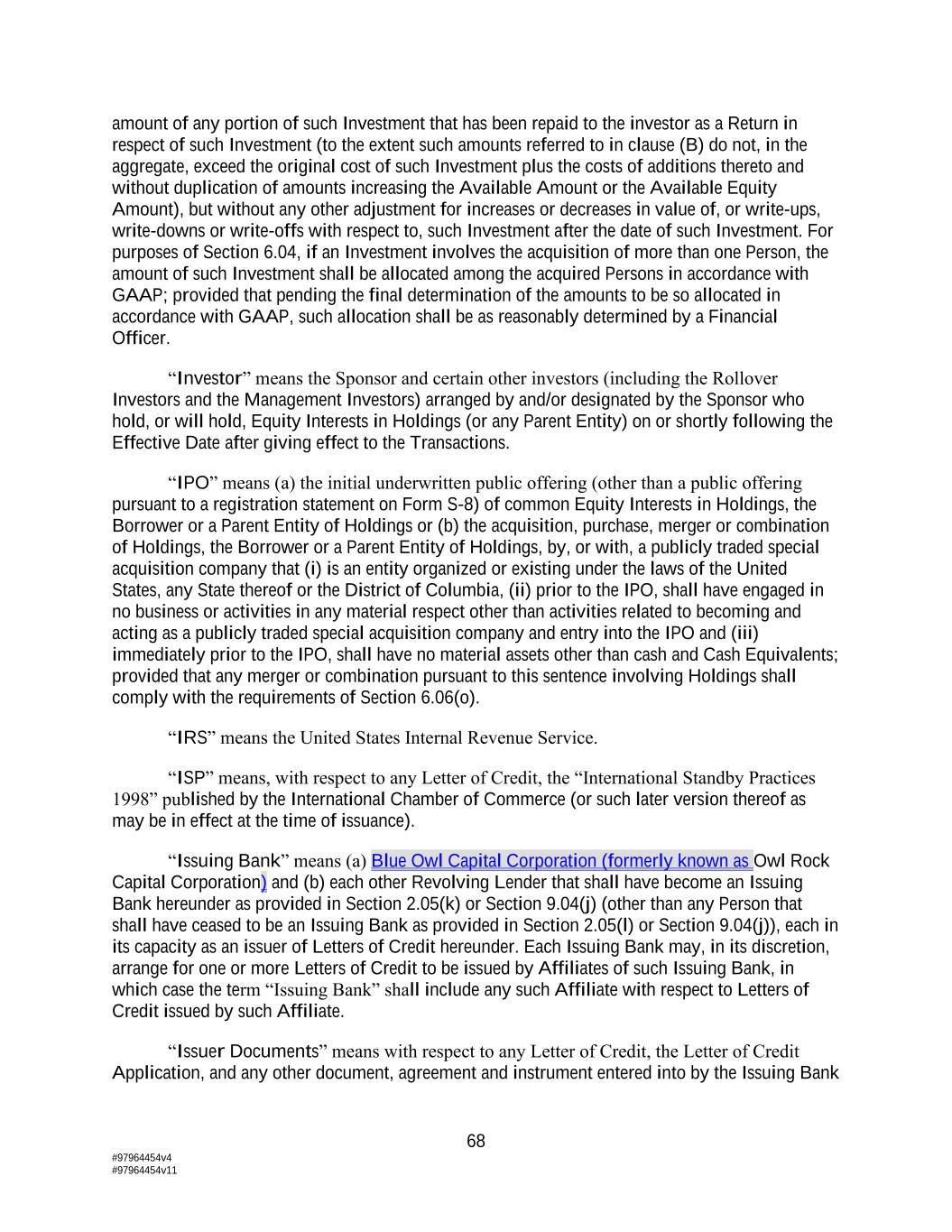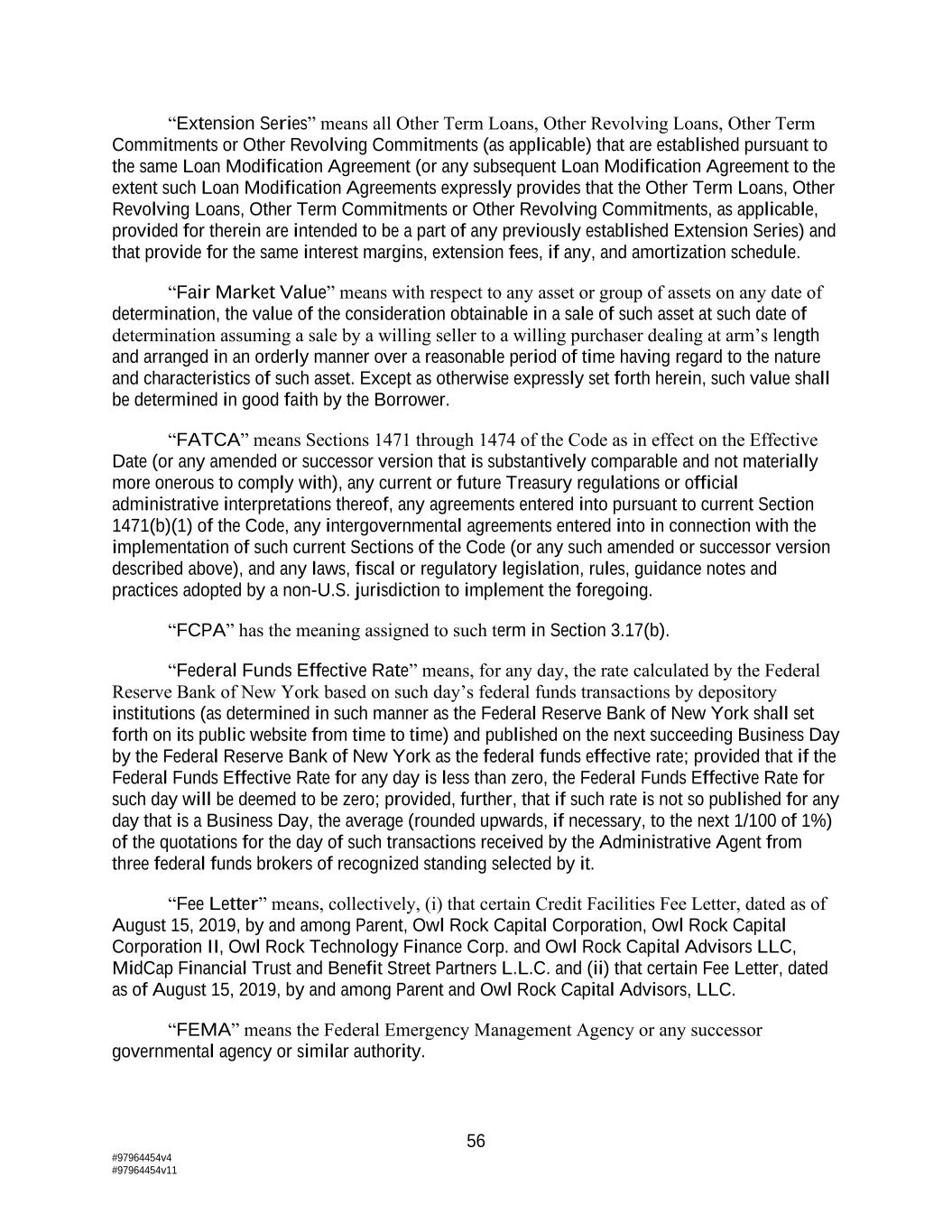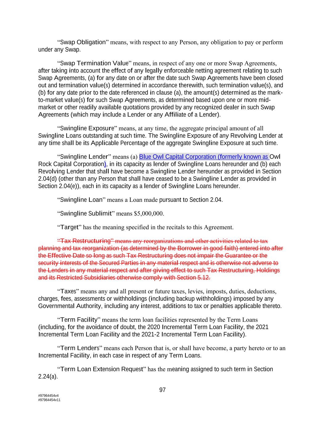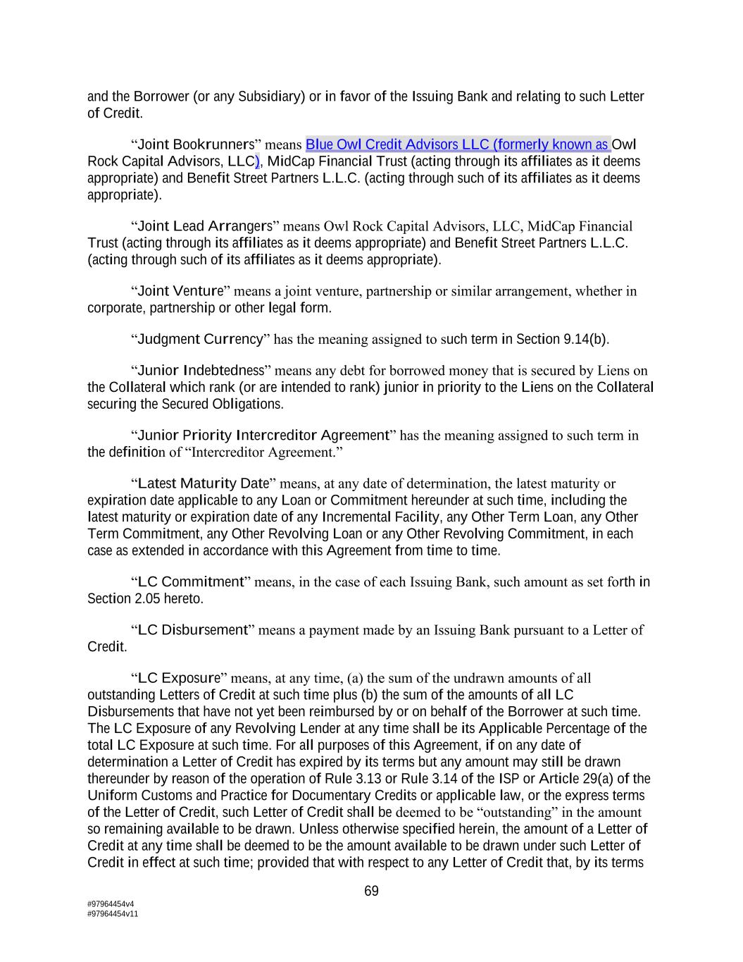 5 #97964454v4 #97964454v11 the Borrower’s or any Restricted Subsidiary’s respective equity ownership in any Joint Venture to an amount in excess of the majority of the outstanding Equity Interests of such Joint Venture). “Additional Lender” means, at any time, any bank, other financial institution or institutional lender or investor (including any such bank, financial institution or institutional lender or investor that is a Lender at such time) that agrees to provide any portion of any (a) Incremental Facility pursuant to an Incremental Facility Amendment in accordance with Section 2.20 or (b) Credit Agreement Refinancing Indebtedness; provided that each Additional Lender shall be subject to the approval of (i) the Administrative Agent, each Issuing Bank and the Swingline Lender (such approval in each case not to be unreasonably withheld or delayed) and (ii) the Borrower, in each of the foregoing clauses (i) and (ii), to the extent such approval would be required pursuant to Section 9.04 if an assignment of the applicable Loans or Commitments were being made to such Additional Lender. “Adjusted Term SOFR” means, for purposes of any calculation and subject to the provisions of Section 2.14(b)(i), the rate per annum equal to (a) Term SOFR for such calculation plus (b) the Term SOFR Adjustment; provided that if Adjusted Term SOFR as so determined shall ever be less than the Floor, then Adjusted Term SOFR shall be deemed to be the Floor. “Administrative Agent” means Blue Owl Rock Capital Corporation (or an affiliate, designee or sub-agent designated by it), in its capacity as administrative agent hereunder and under the other Loan Documents, and its successors in such capacity as provided in Article 8. “Administrative Questionnaire” means an administrative questionnaire in a form supplied by the Administrative Agent. “Affiliate” means, with respect to a specified Person, another Person that directly or indirectly Controls or is Controlled by or is under common Control with the Person specified. “After Year End Payment” has the meaning assigned to such term in Section 2.11(d). “Agent” means the Administrative Agent and the Collateral Agent and any successors and permitted assigns in such capacity, and “Agents” means two or more of them. For the avoidance of doubt, the use of the defined term “Agent” or the term “agent” with reference to any Agent herein and in the other Loan Documents is not intended to connote any fiduciary or other implied (or express) obligations arising under agency doctrine of any applicable law. “Agreement” has the meaning assigned to such term in the preamble hereto. “Agreement Currency” has the meaning assigned to such term in Section 9.14(b). “AHYDO Catch-Up Payment” means any payment with respect to any obligations of Holdings, the Borrower or any Restricted Subsidiary to avoid the application of Section 163(e)(5) of the Code thereto. “Alternate Base Rate” means, for any day, a rate per annum equal to the greatest of (a) the Prime Rate in effect on such day, (b) the Federal Funds Effective Rate in effect on such day plus 1/2 of 1% per annum and (c) Adjusted Term SOFR on such day (or if such day is not a
