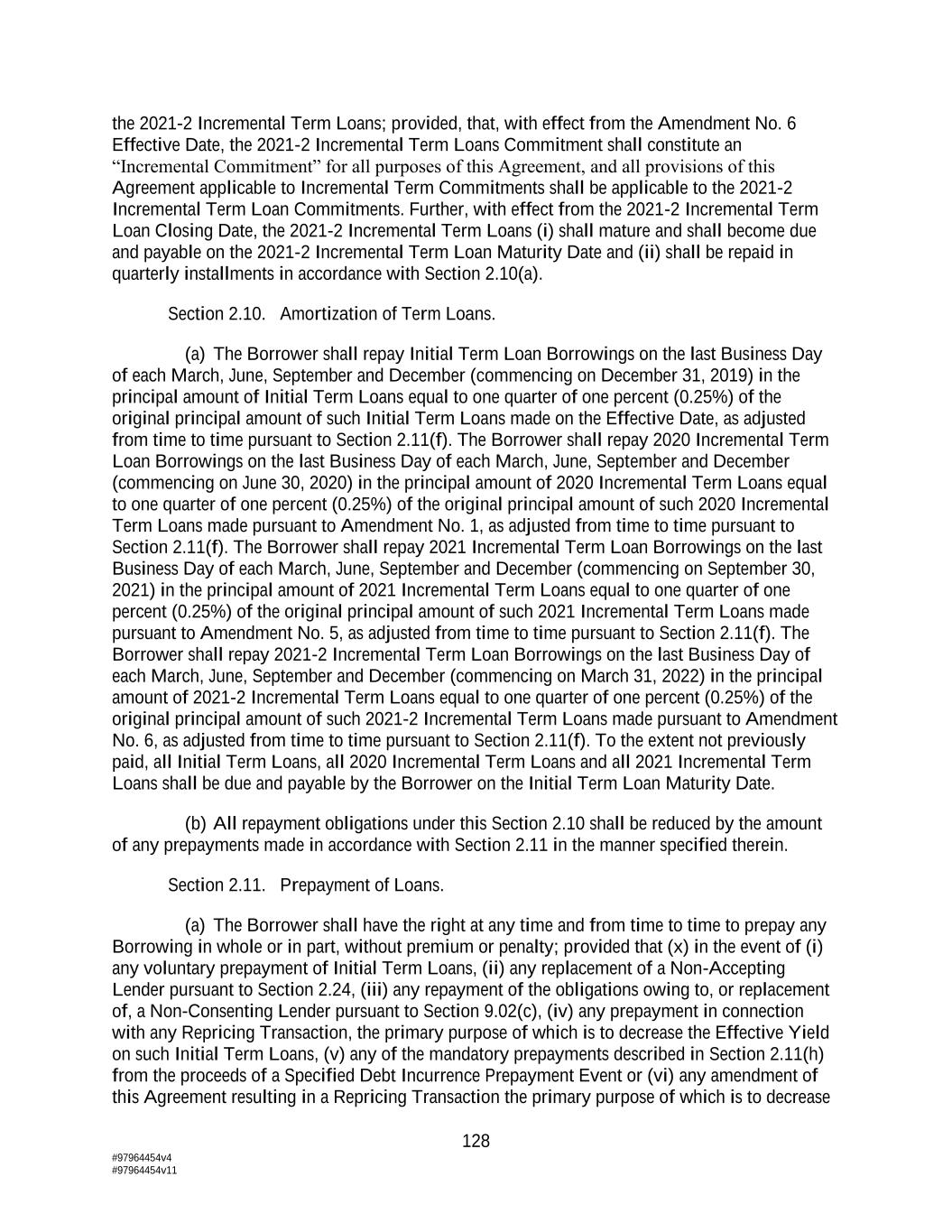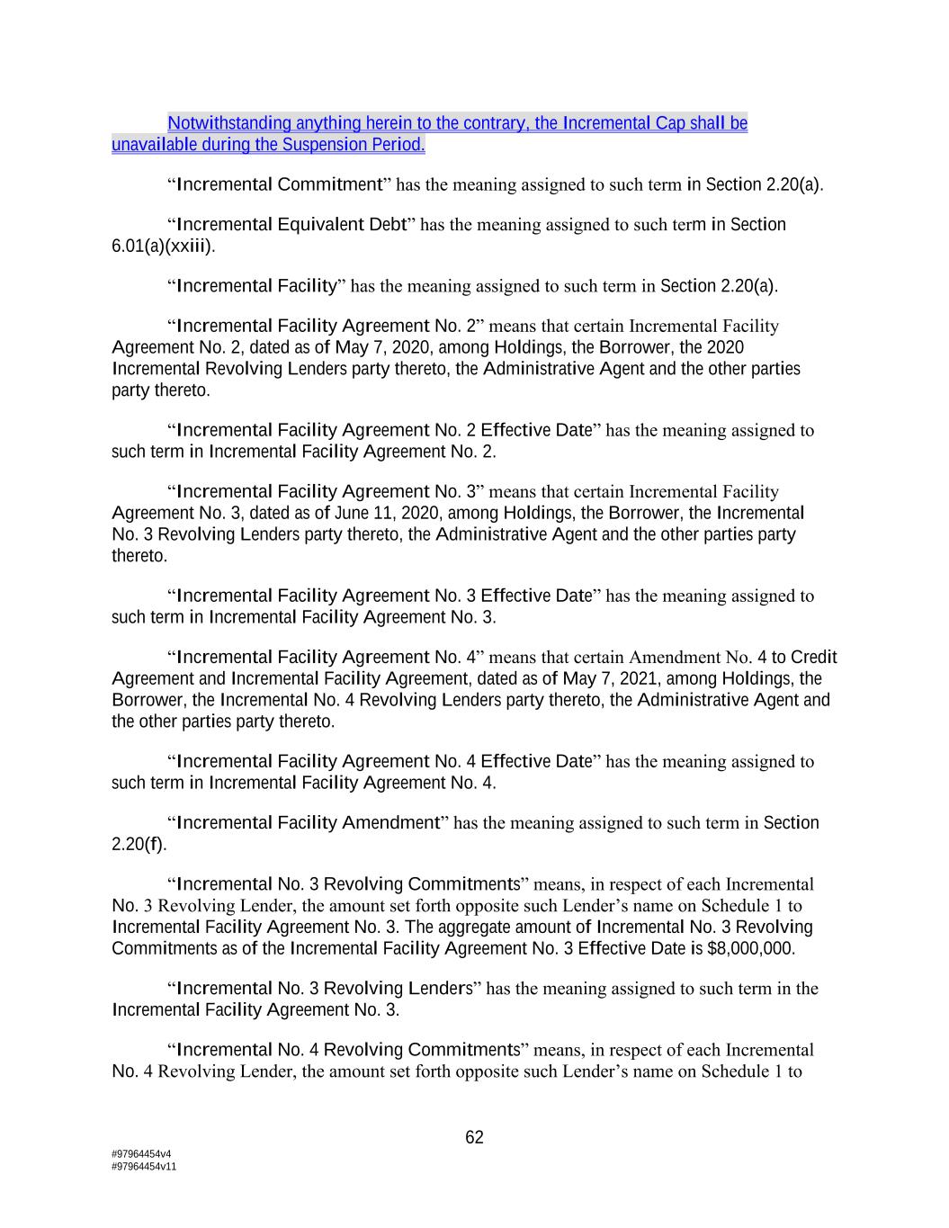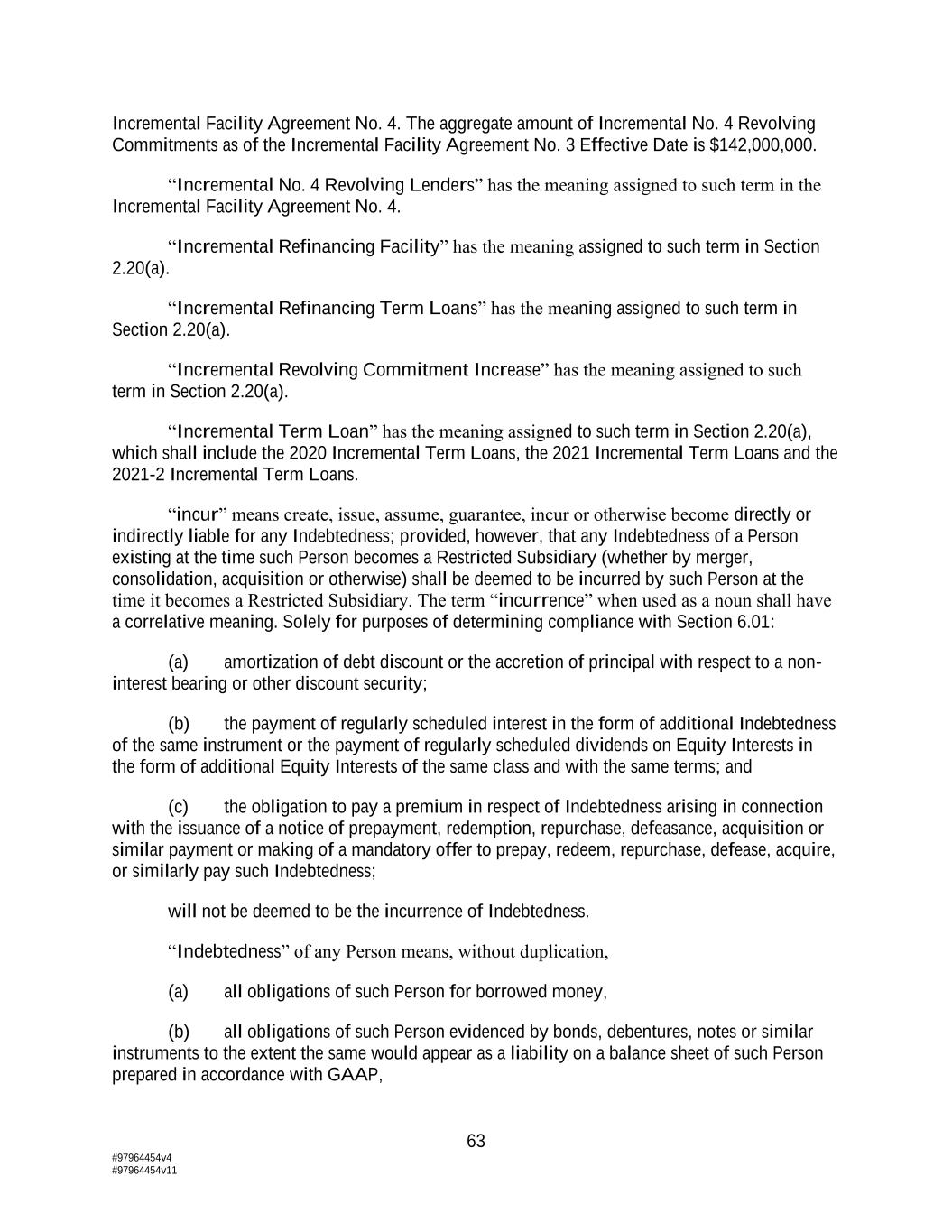 3 #97964454v4 #97964454v11 the Amendment No. 1. The aggregate amount of 2020 Incremental Term Loan Commitments as of the Amendment No. 1 Effective Date is $117,000,000. “2020 Incremental Term Loan Facility” means the facility under which the 2020 Incremental Term Loans are made available pursuant to the Amendment No. 1. “2020 Incremental Term Loans” has the meaning assigned to such term in Amendment No. 1. “2020 Incremental Term Loan Maturity Date” shall mean the Initial Term Loan Maturity Date. “2021 Incremental Term Lenders” has the meaning assigned to such term in Amendment No. 5. “2021 Incremental Term Loan Commitments” has the meaning assigned to such term in Amendment No. 5. “2021 Incremental Term Loan Facility” means the facility under which the 2021 Incremental Term Loans are made available pursuant to Amendment No. 5. “2021 Incremental Term Loans” has the meaning assigned to such term in Amendment No. 5. “2021 Incremental Term Loan Maturity Date” shall mean the Initial Term Loan Maturity Date. “2021-2 Incremental Term Lenders” has the meaning assigned to such term in Amendment No. 6. “2021-2 Incremental Term Loan Closing Date” means the “Incremental Funding Date” as defined in Amendment No. 6, which, for the avoidance of doubt, is November 10, 2021. “2021-2 Incremental Term Loan Commitments” has the meaning assigned to such term in Amendment No. 6. The aggregate amount of 2021-2 Incremental Term Loan Commitments as of the Amendment No. 6 Effective Date is $100,000,000. “2021-2 Incremental Term Loan Facility” means the facility under which the 2021-2 Incremental Term Loans are made available pursuant to Amendment No. 6. “2021-2 Incremental Term Loans” has the meaning assigned to such term in Amendment No. 6. “2021-2 Incremental Term Loan Maturity Date” shall mean the Initial Term Loan Maturity Date.