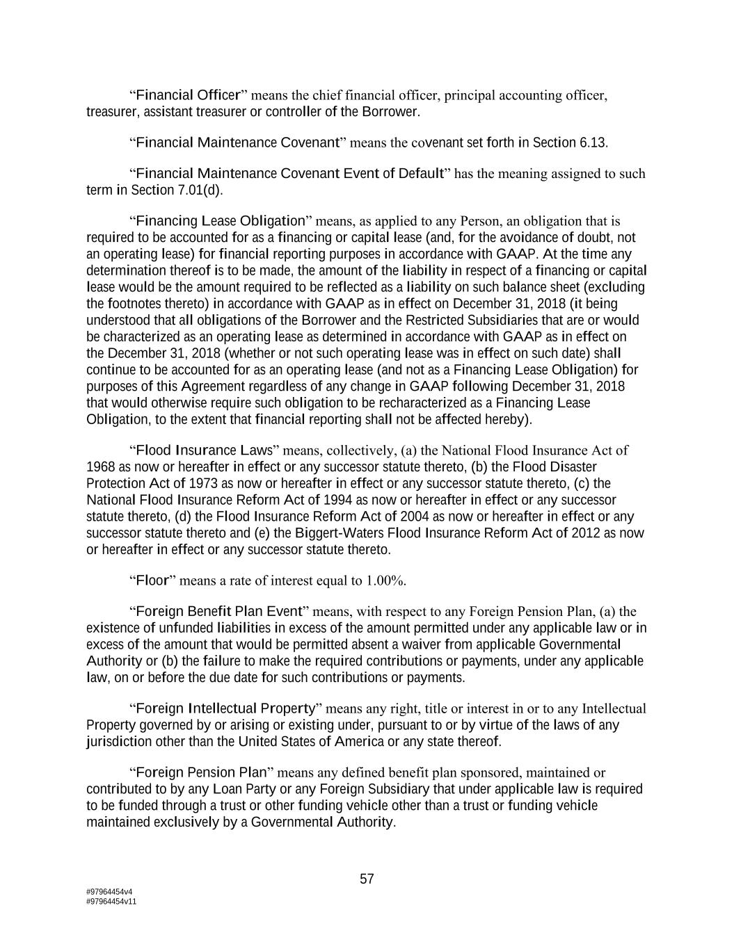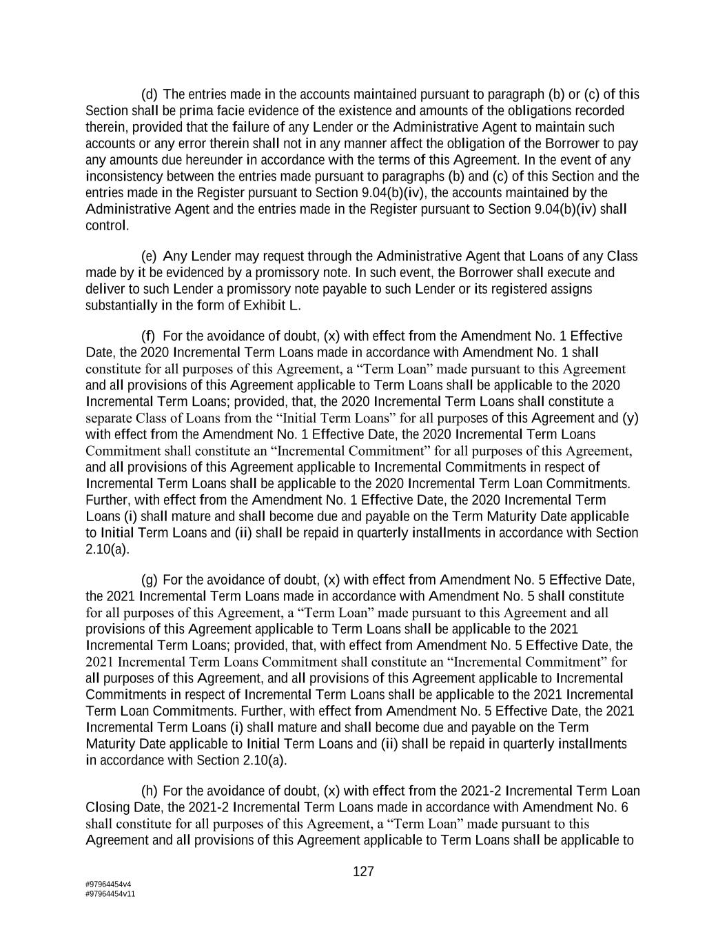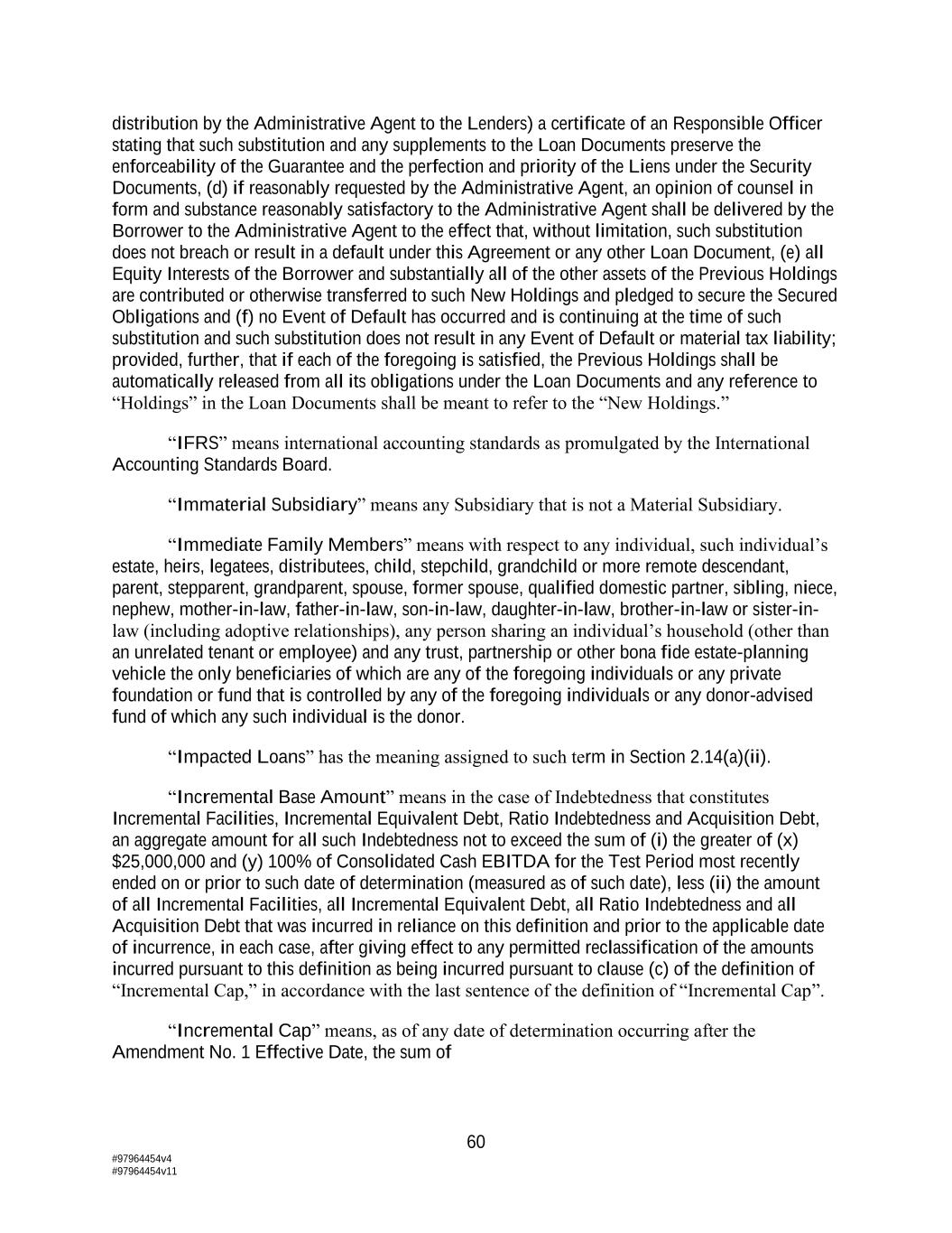 3 #97964454v4 #97964454v11 the Amendment No. 1. The aggregate amount of 2020 Incremental Term Loan Commitments as of the Amendment No. 1 Effective Date is $117,000,000. “2020 Incremental Term Loan Facility” means the facility under which the 2020 Incremental Term Loans are made available pursuant to the Amendment No. 1. “2020 Incremental Term Loans” has the meaning assigned to such term in Amendment No. 1. “2020 Incremental Term Loan Maturity Date” shall mean the Initial Term Loan Maturity Date. “2021 Incremental Term Lenders” has the meaning assigned to such term in Amendment No. 5. “2021 Incremental Term Loan Commitments” has the meaning assigned to such term in Amendment No. 5. “2021 Incremental Term Loan Facility” means the facility under which the 2021 Incremental Term Loans are made available pursuant to Amendment No. 5. “2021 Incremental Term Loans” has the meaning assigned to such term in Amendment No. 5. “2021 Incremental Term Loan Maturity Date” shall mean the Initial Term Loan Maturity Date. “2021-2 Incremental Term Lenders” has the meaning assigned to such term in Amendment No. 6. “2021-2 Incremental Term Loan Closing Date” means the “Incremental Funding Date” as defined in Amendment No. 6, which, for the avoidance of doubt, is November 10, 2021. “2021-2 Incremental Term Loan Commitments” has the meaning assigned to such term in Amendment No. 6. The aggregate amount of 2021-2 Incremental Term Loan Commitments as of the Amendment No. 6 Effective Date is $100,000,000. “2021-2 Incremental Term Loan Facility” means the facility under which the 2021-2 Incremental Term Loans are made available pursuant to Amendment No. 6. “2021-2 Incremental Term Loans” has the meaning assigned to such term in Amendment No. 6. “2021-2 Incremental Term Loan Maturity Date” shall mean the Initial Term Loan Maturity Date.
