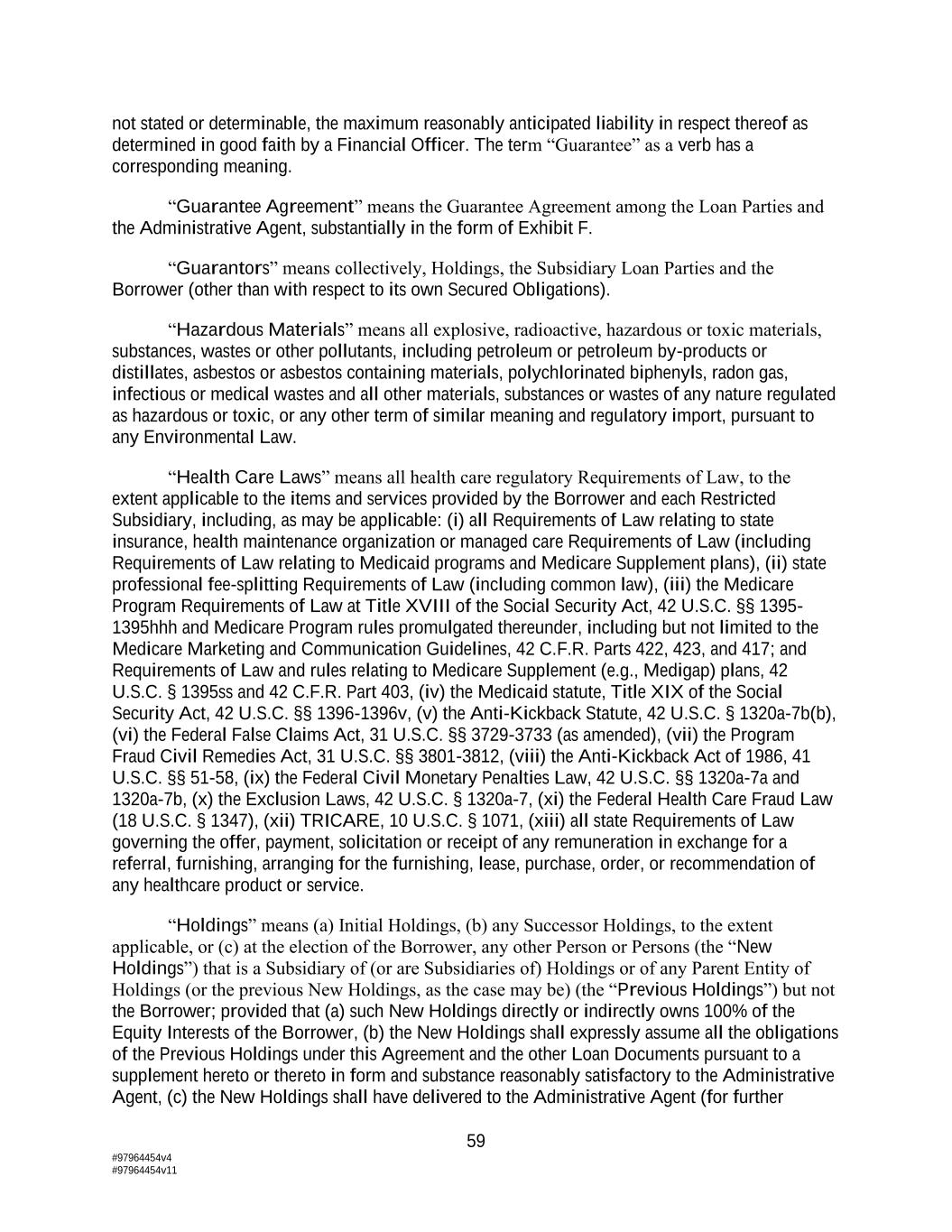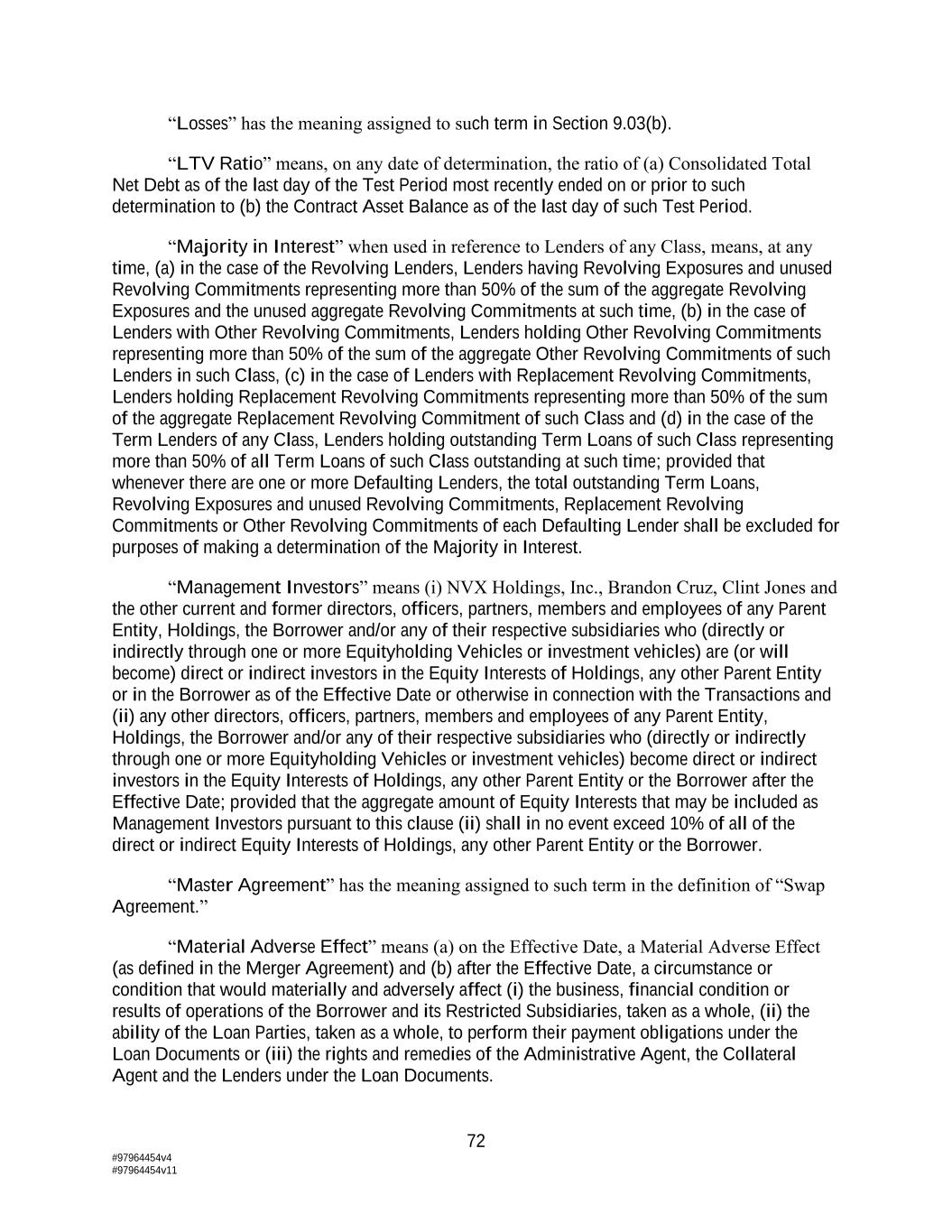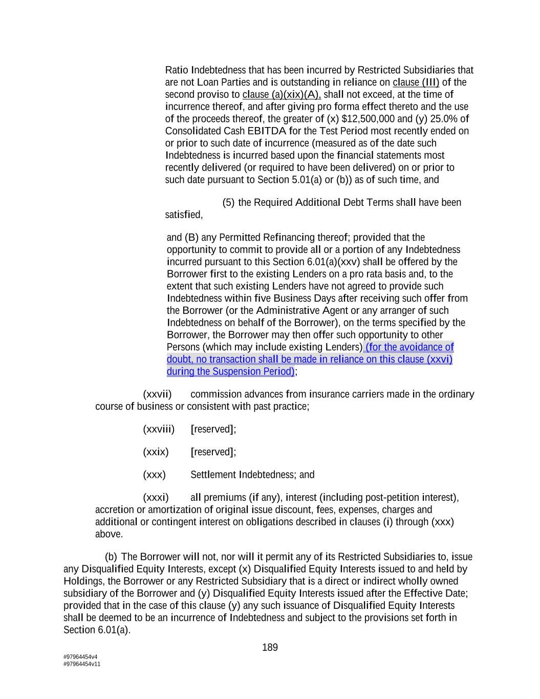 189 #97964454v4 #97964454v11 Ratio Indebtedness that has been incurred by Restricted Subsidiaries that are not Loan Parties and is outstanding in reliance on clause (III) of the second proviso to clause (a)(xix)(A), shall not exceed, at the time of incurrence thereof, and after giving pro forma effect thereto and the use of the proceeds thereof, the greater of (x) $12,500,000 and (y) 25.0% of Consolidated Cash EBITDA for the Test Period most recently ended on or prior to such date of incurrence (measured as of the date such Indebtedness is incurred based upon the financial statements most recently delivered (or required to have been delivered) on or prior to such date pursuant to Section 5.01(a) or (b)) as of such time, and (5) the Required Additional Debt Terms shall have been satisfied, and (B) any Permitted Refinancing thereof; provided that the opportunity to commit to provide all or a portion of any Indebtedness incurred pursuant to this Section 6.01(a)(xxv) shall be offered by the Borrower first to the existing Lenders on a pro rata basis and, to the extent that such existing Lenders have not agreed to provide such Indebtedness within five Business Days after receiving such offer from the Borrower (or the Administrative Agent or any arranger of such Indebtedness on behalf of the Borrower), on the terms specified by the Borrower, the Borrower may then offer such opportunity to other Persons (which may include existing Lenders) (for the avoidance of doubt, no transaction shall be made in reliance on this clause (xxvi) during the Suspension Period); (xxvii) commission advances from insurance carriers made in the ordinary course of business or consistent with past practice; (xxviii) [reserved]; (xxix) [reserved]; (xxx) Settlement Indebtedness; and (xxxi) all premiums (if any), interest (including post-petition interest), accretion or amortization of original issue discount, fees, expenses, charges and additional or contingent interest on obligations described in clauses (i) through (xxx) above. (b) The Borrower will not, nor will it permit any of its Restricted Subsidiaries to, issue any Disqualified Equity Interests, except (x) Disqualified Equity Interests issued to and held by Holdings, the Borrower or any Restricted Subsidiary that is a direct or indirect wholly owned subsidiary of the Borrower and (y) Disqualified Equity Interests issued after the Effective Date; provided that in the case of this clause (y) any such issuance of Disqualified Equity Interests shall be deemed to be an incurrence of Indebtedness and subject to the provisions set forth in Section 6.01(a).