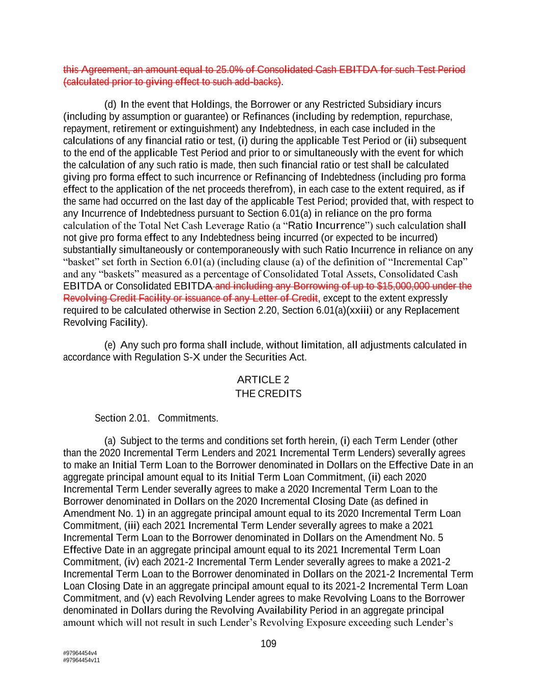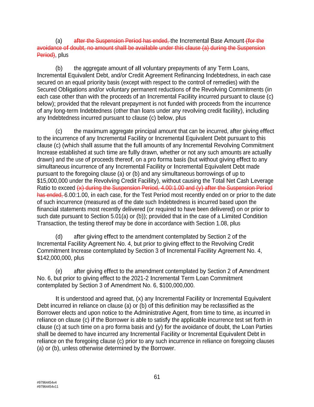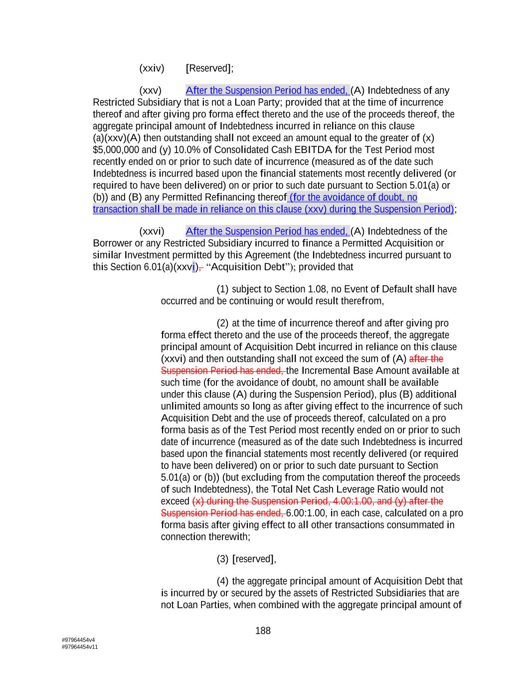 188 #97964454v4 #97964454v11 (xxiv) [Reserved]; (xxv) After the Suspension Period has ended, (A) Indebtedness of any Restricted Subsidiary that is not a Loan Party; provided that at the time of incurrence thereof and after giving pro forma effect thereto and the use of the proceeds thereof, the aggregate principal amount of Indebtedness incurred in reliance on this clause (a)(xxv)(A) then outstanding shall not exceed an amount equal to the greater of (x) $5,000,000 and (y) 10.0% of Consolidated Cash EBITDA for the Test Period most recently ended on or prior to such date of incurrence (measured as of the date such Indebtedness is incurred based upon the financial statements most recently delivered (or required to have been delivered) on or prior to such date pursuant to Section 5.01(a) or (b)) and (B) any Permitted Refinancing thereof (for the avoidance of doubt, no transaction shall be made in reliance on this clause (xxv) during the Suspension Period); (xxvi) After the Suspension Period has ended, (A) Indebtedness of the Borrower or any Restricted Subsidiary incurred to finance a Permitted Acquisition or similar Investment permitted by this Agreement (the Indebtedness incurred pursuant to this Section 6.01(a)(xxvi), “Acquisition Debt”); provided that (1) subject to Section 1.08, no Event of Default shall have occurred and be continuing or would result therefrom, (2) at the time of incurrence thereof and after giving pro forma effect thereto and the use of the proceeds thereof, the aggregate principal amount of Acquisition Debt incurred in reliance on this clause (xxvi) and then outstanding shall not exceed the sum of (A) after the Suspension Period has ended, the Incremental Base Amount available at such time (for the avoidance of doubt, no amount shall be available under this clause (A) during the Suspension Period), plus (B) additional unlimited amounts so long as after giving effect to the incurrence of such Acquisition Debt and the use of proceeds thereof, calculated on a pro forma basis as of the Test Period most recently ended on or prior to such date of incurrence (measured as of the date such Indebtedness is incurred based upon the financial statements most recently delivered (or required to have been delivered) on or prior to such date pursuant to Section 5.01(a) or (b)) (but excluding from the computation thereof the proceeds of such Indebtedness), the Total Net Cash Leverage Ratio would not exceed (x) during the Suspension Period, 4.00:1.00, and (y) after the Suspension Period has ended, 6.00:1.00, in each case, calculated on a pro forma basis after giving effect to all other transactions consummated in connection therewith; (3) [reserved], (4) the aggregate principal amount of Acquisition Debt that is incurred by or secured by the assets of Restricted Subsidiaries that are not Loan Parties, when combined with the aggregate principal amount of