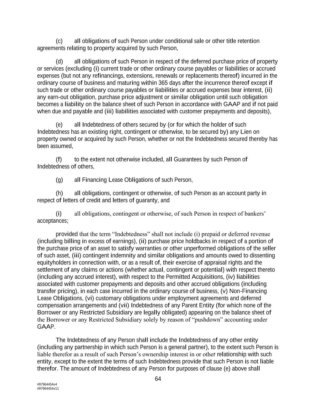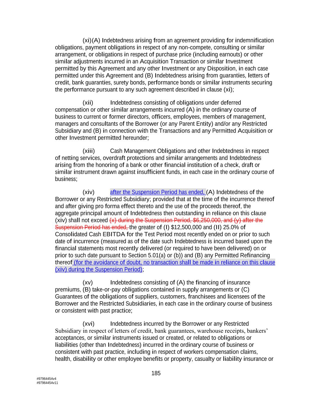 185 #97964454v4 #97964454v11 (xi) (A) Indebtedness arising from an agreement providing for indemnification obligations, payment obligations in respect of any non-compete, consulting or similar arrangement, or obligations in respect of purchase price (including earnouts) or other similar adjustments incurred in an Acquisition Transaction or similar Investment permitted by this Agreement and any other Investment or any Disposition, in each case permitted under this Agreement and (B) Indebtedness arising from guaranties, letters of credit, bank guaranties, surety bonds, performance bonds or similar instruments securing the performance pursuant to any such agreement described in clause (xi); (xii) Indebtedness consisting of obligations under deferred compensation or other similar arrangements incurred (A) in the ordinary course of business to current or former directors, officers, employees, members of management, managers and consultants of the Borrower (or any Parent Entity) and/or any Restricted Subsidiary and (B) in connection with the Transactions and any Permitted Acquisition or other Investment permitted hereunder; (xiii) Cash Management Obligations and other Indebtedness in respect of netting services, overdraft protections and similar arrangements and Indebtedness arising from the honoring of a bank or other financial institution of a check, draft or similar instrument drawn against insufficient funds, in each case in the ordinary course of business; (xiv) after the Suspension Period has ended, (A) Indebtedness of the Borrower or any Restricted Subsidiary; provided that at the time of the incurrence thereof and after giving pro forma effect thereto and the use of the proceeds thereof, the aggregate principal amount of Indebtedness then outstanding in reliance on this clause (xiv) shall not exceed (x) during the Suspension Period, $6,250,000, and (y) after the Suspension Period has ended, the greater of (I) $12,500,000 and (II) 25.0% of Consolidated Cash EBITDA for the Test Period most recently ended on or prior to such date of incurrence (measured as of the date such Indebtedness is incurred based upon the financial statements most recently delivered (or required to have been delivered) on or prior to such date pursuant to Section 5.01(a) or (b)) and (B) any Permitted Refinancing thereof (for the avoidance of doubt, no transaction shall be made in reliance on this clause (xiv) during the Suspension Period); (xv) Indebtedness consisting of (A) the financing of insurance premiums, (B) take-or-pay obligations contained in supply arrangements or (C) Guarantees of the obligations of suppliers, customers, franchisees and licensees of the Borrower and the Restricted Subsidiaries, in each case in the ordinary course of business or consistent with past practice; (xvi) Indebtedness incurred by the Borrower or any Restricted Subsidiary in respect of letters of credit, bank guarantees, warehouse receipts, bankers’ acceptances, or similar instruments issued or created, or related to obligations or liabilities (other than Indebtedness) incurred in the ordinary course of business or consistent with past practice, including in respect of workers compensation claims, health, disability or other employee benefits or property, casualty or liability insurance or