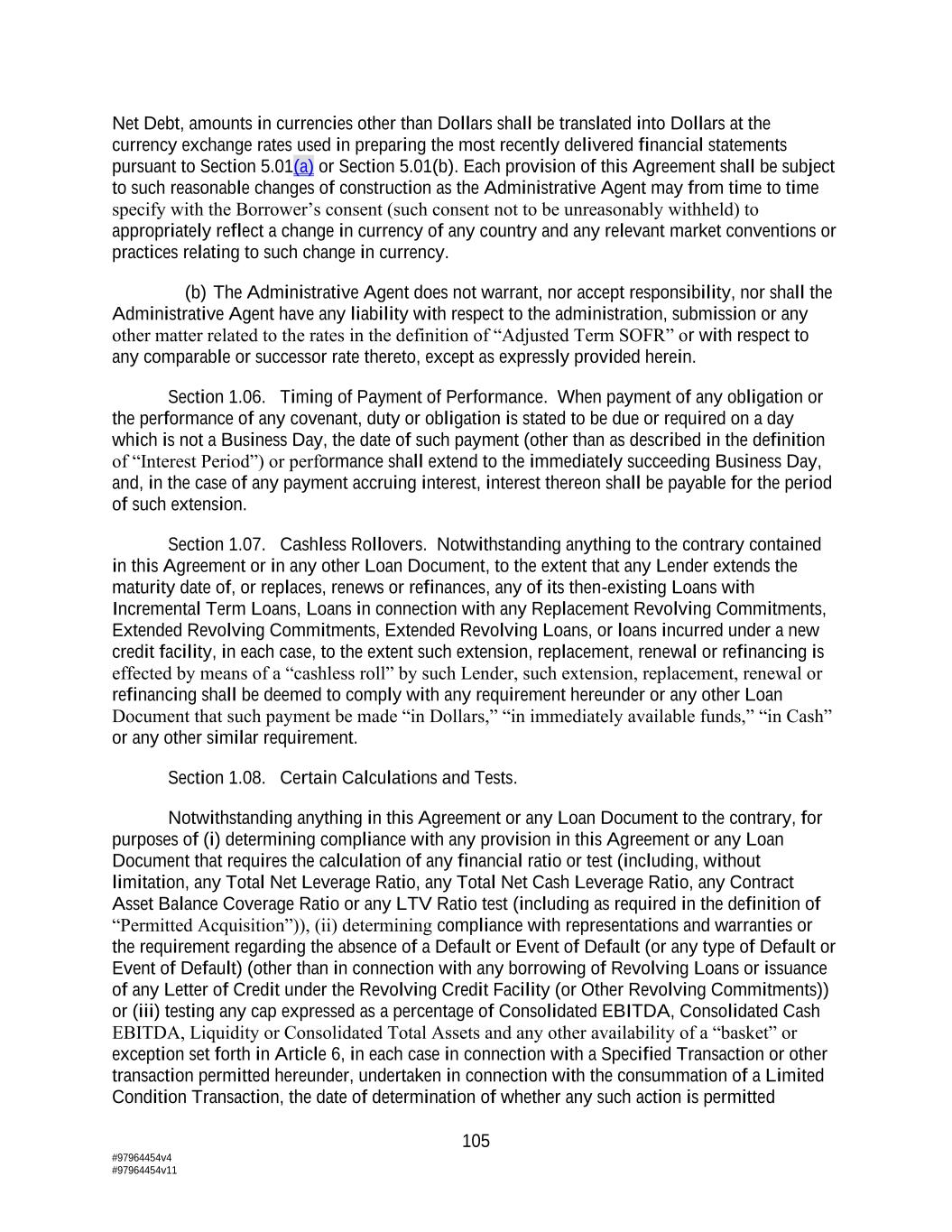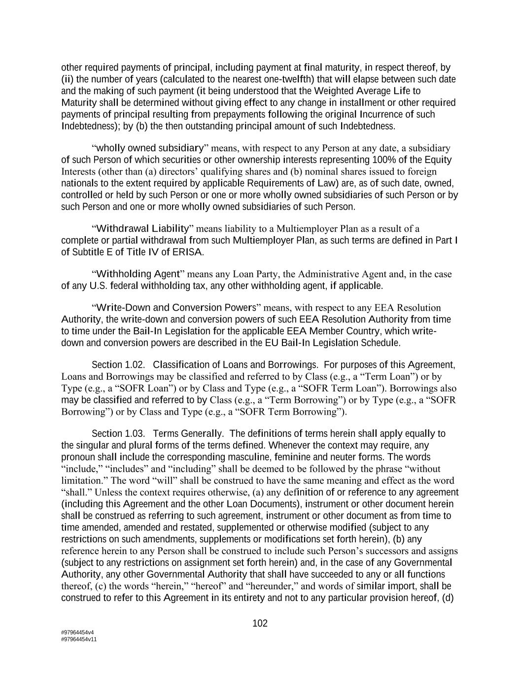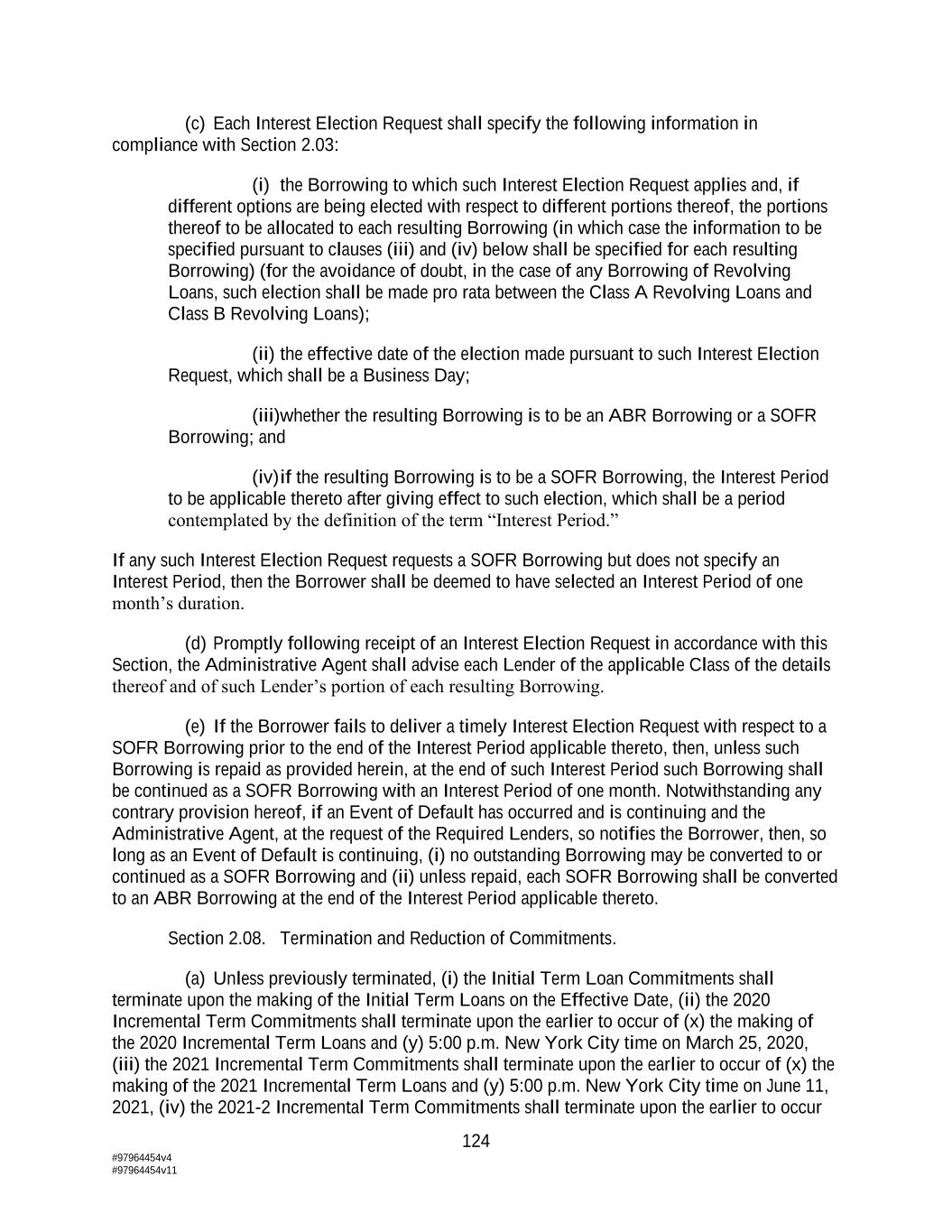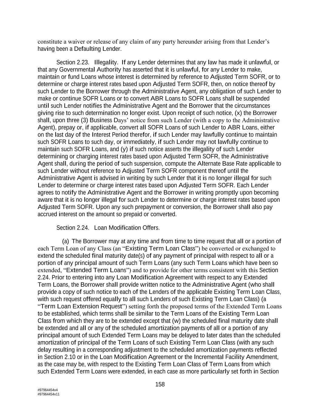 i #97964454v4 #97964454v11 TABLE OF CONTENTS PAGE ARTICLE 1 Definitions 2 Section 1.01. Defined Terms. 2 Section 1.02. Classification of Loans and Borrowings. 99101 Section 1.03. Terms Generally 99. . 101 Section 1.04. Accounting Terms; GAAP. 99101 Section 1.05. Currency Translation; Rates. 101103 Section 1.06. Timing of Payment of Performance. 101104 Section 1.07. Cashless Rollovers. 102104 Section 1.08. Certain Calculations and Tests. 102104 Section 1.09. Rounding. 103105 Section 1.10. [Reserved]. 103106 Section 1.11. Pro Forma and Other Calculations. 103106 ARTICLE 2 THE CREDITS 108 Section 2.01. Commitments. 106108 Section 2.02. Loans and Borrowings. 107109 Section 2.03. Requests for Borrowings. 108110 Section 2.04. Swingline Loans. 109111 Section 2.05. Letters of Credit. 111114 Section 2.06. Funding of Borrowings. 117121 Section 2.07. Interest Elections. 118122 Section 2.08. Termination and Reduction of Commitments. 119123 Section 2.09. Repayment of Loans; Evidence of Debt. 121125 Section 2.10. Amortization of Term Loans. 123127 Section 2.11. Prepayment of Loans. 123127 Section 2.12. Fees. 132136 Section 2.13. Interest. 134138 Section 2.14. Alternate Rate of Interest; Benchmark Replacement Setting. 135139 Section 2.15. Increased Costs. 137141 Section 2.16. Break Funding Payments. 138143 Section 2.17. Taxes. 139143 Section 2.18. Payments Generally; Pro Rata Treatment; Sharing of Setoffs. 143147 Section 2.19. Mitigation Obligations; Replacement of Lenders. 144149 Section 2.20. Incremental Loans and Commitments. 145150 Section 2.21. [Reserved]. 150154 Section 2.22. Defaulting Lenders. 150154 Section 2.23. Illegality. 152156 Section 2.24. Loan Modification Offers. 153157 ARTICLE 3 REPRESENTATIONS AND WARRANTIES 162 Section 3.01. Organization; Powers. 158162 Section 3.02. Authorization; Enforceability. 158162 Section 3.03. Governmental Approvals; No Conflicts. 158162