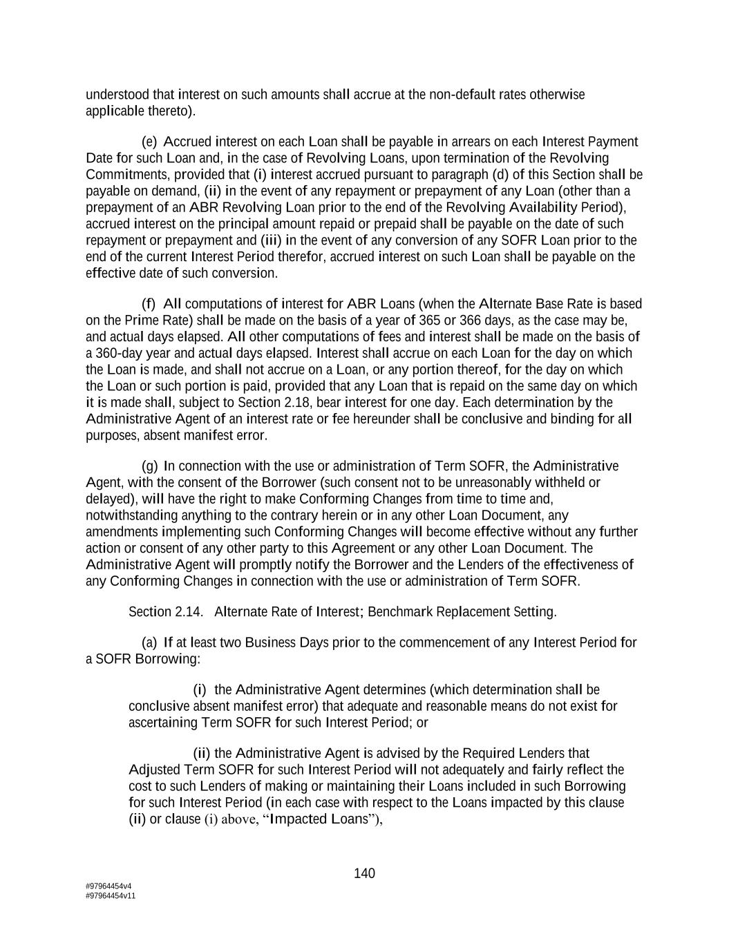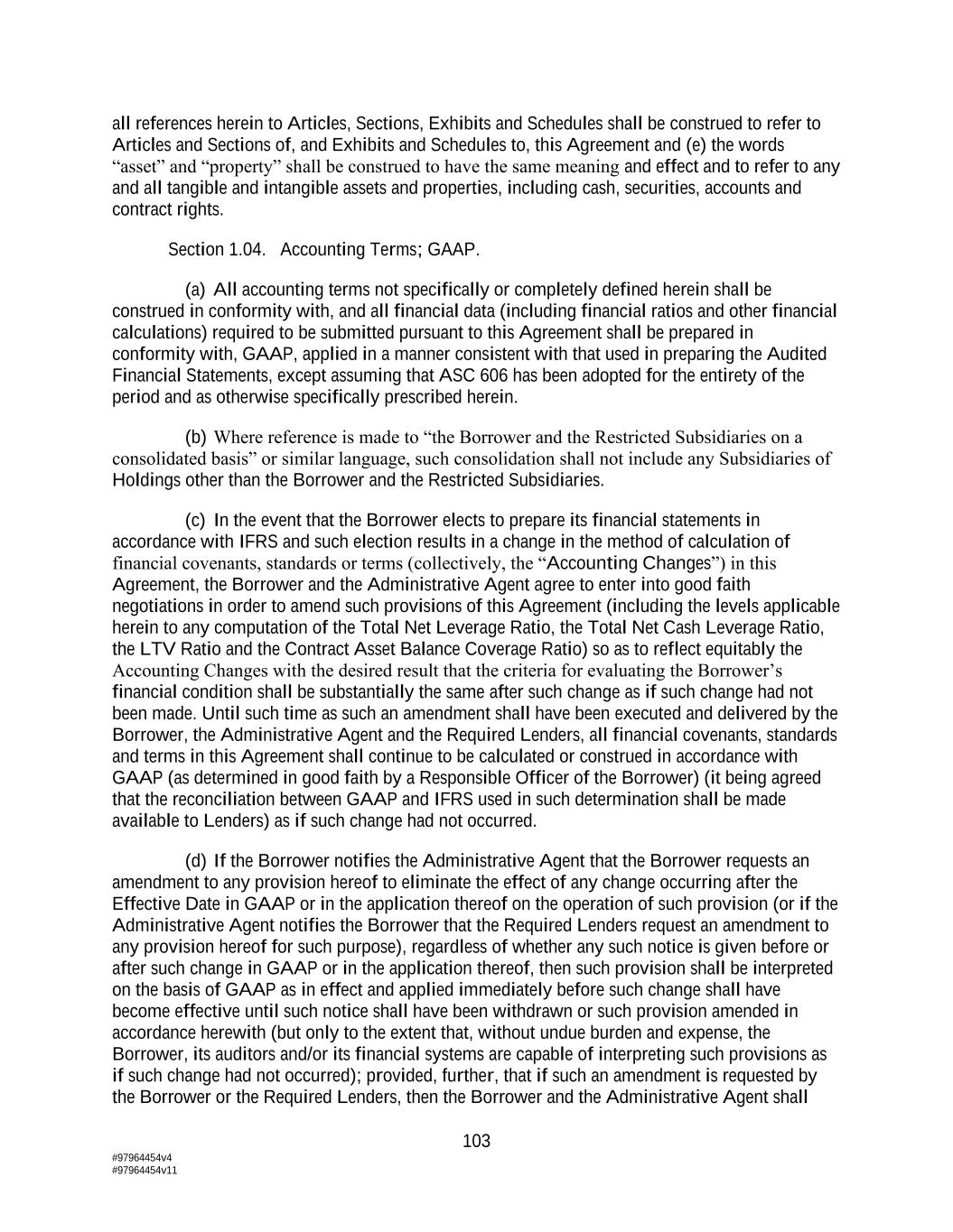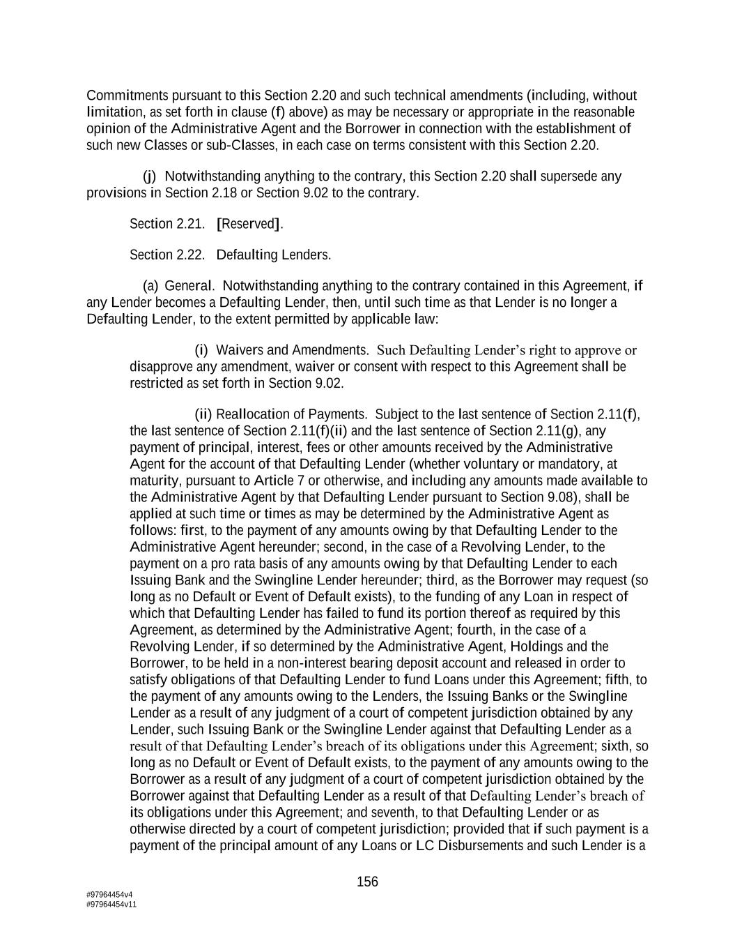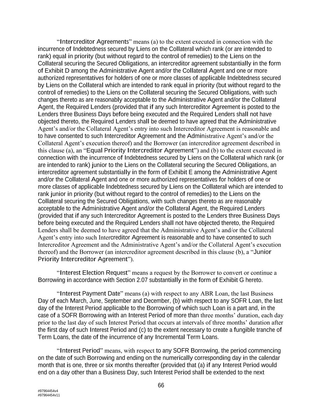 i #97964454v4 #97964454v11 TABLE OF CONTENTS PAGE ARTICLE 1 Definitions 2 Section 1.01. Defined Terms. 2 Section 1.02. Classification of Loans and Borrowings. 99101 Section 1.03. Terms Generally 99. . 101 Section 1.04. Accounting Terms; GAAP. 99101 Section 1.05. Currency Translation; Rates. 101103 Section 1.06. Timing of Payment of Performance. 101104 Section 1.07. Cashless Rollovers. 102104 Section 1.08. Certain Calculations and Tests. 102104 Section 1.09. Rounding. 103105 Section 1.10. [Reserved]. 103106 Section 1.11. Pro Forma and Other Calculations. 103106 ARTICLE 2 THE CREDITS 108 Section 2.01. Commitments. 106108 Section 2.02. Loans and Borrowings. 107109 Section 2.03. Requests for Borrowings. 108110 Section 2.04. Swingline Loans. 109111 Section 2.05. Letters of Credit. 111114 Section 2.06. Funding of Borrowings. 117121 Section 2.07. Interest Elections. 118122 Section 2.08. Termination and Reduction of Commitments. 119123 Section 2.09. Repayment of Loans; Evidence of Debt. 121125 Section 2.10. Amortization of Term Loans. 123127 Section 2.11. Prepayment of Loans. 123127 Section 2.12. Fees. 132136 Section 2.13. Interest. 134138 Section 2.14. Alternate Rate of Interest; Benchmark Replacement Setting. 135139 Section 2.15. Increased Costs. 137141 Section 2.16. Break Funding Payments. 138143 Section 2.17. Taxes. 139143 Section 2.18. Payments Generally; Pro Rata Treatment; Sharing of Setoffs. 143147 Section 2.19. Mitigation Obligations; Replacement of Lenders. 144149 Section 2.20. Incremental Loans and Commitments. 145150 Section 2.21. [Reserved]. 150154 Section 2.22. Defaulting Lenders. 150154 Section 2.23. Illegality. 152156 Section 2.24. Loan Modification Offers. 153157 ARTICLE 3 REPRESENTATIONS AND WARRANTIES 162 Section 3.01. Organization; Powers. 158162 Section 3.02. Authorization; Enforceability. 158162 Section 3.03. Governmental Approvals; No Conflicts. 158162