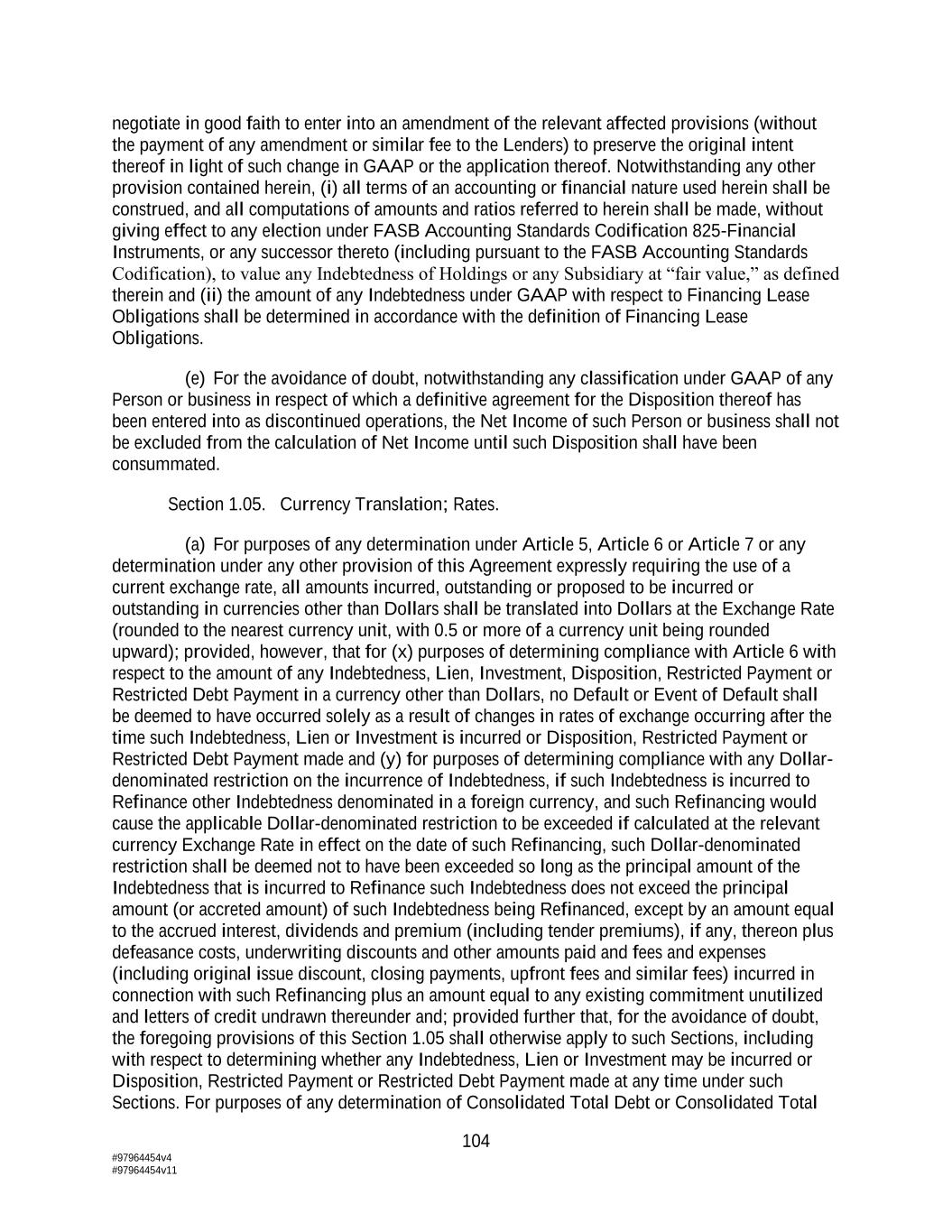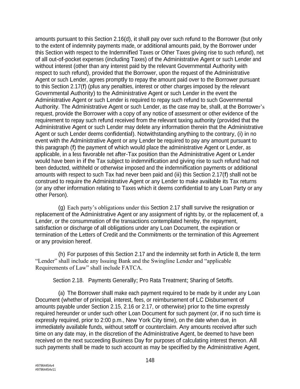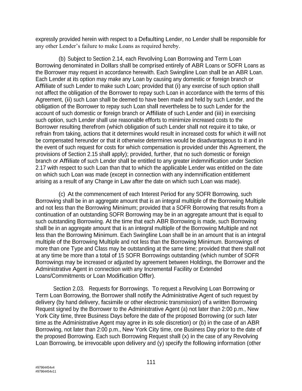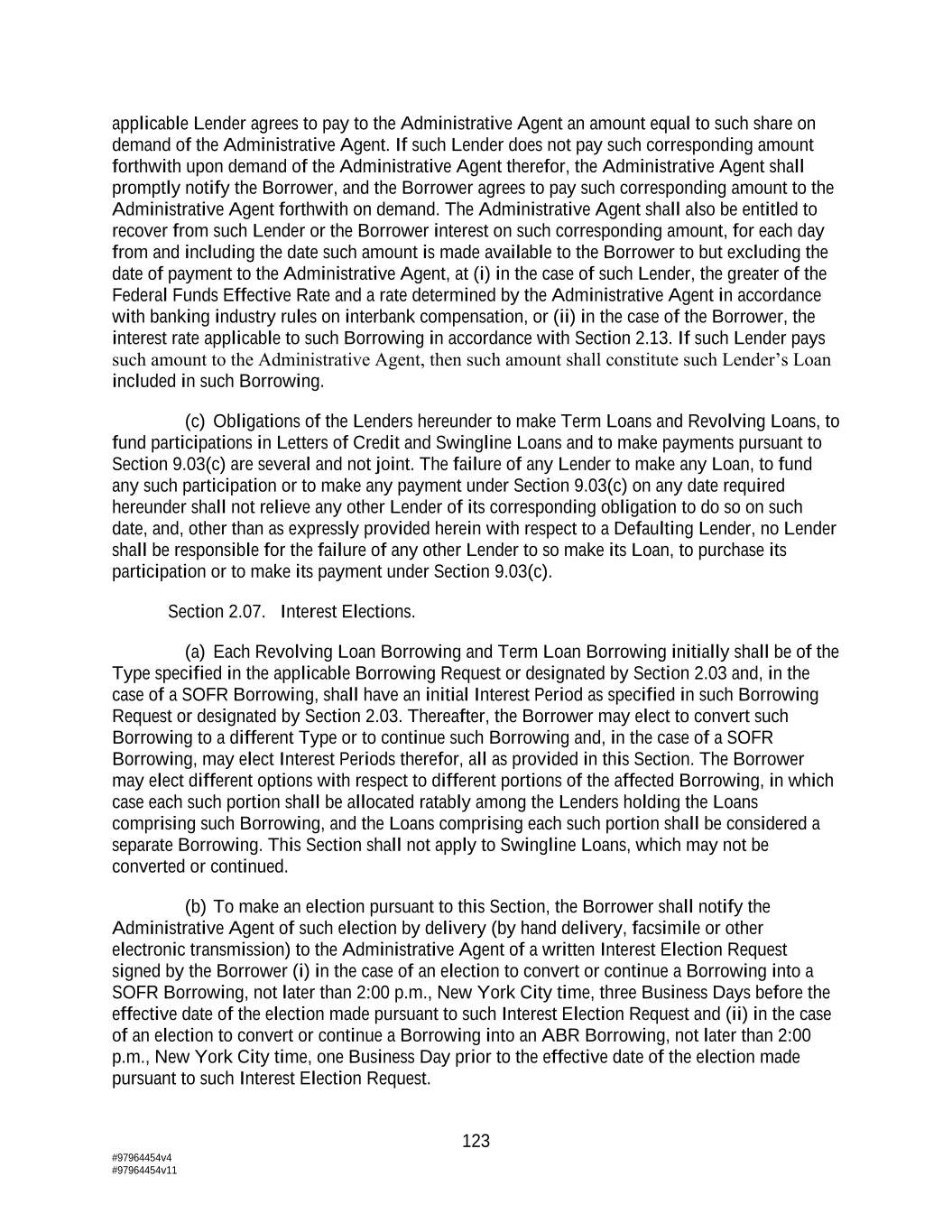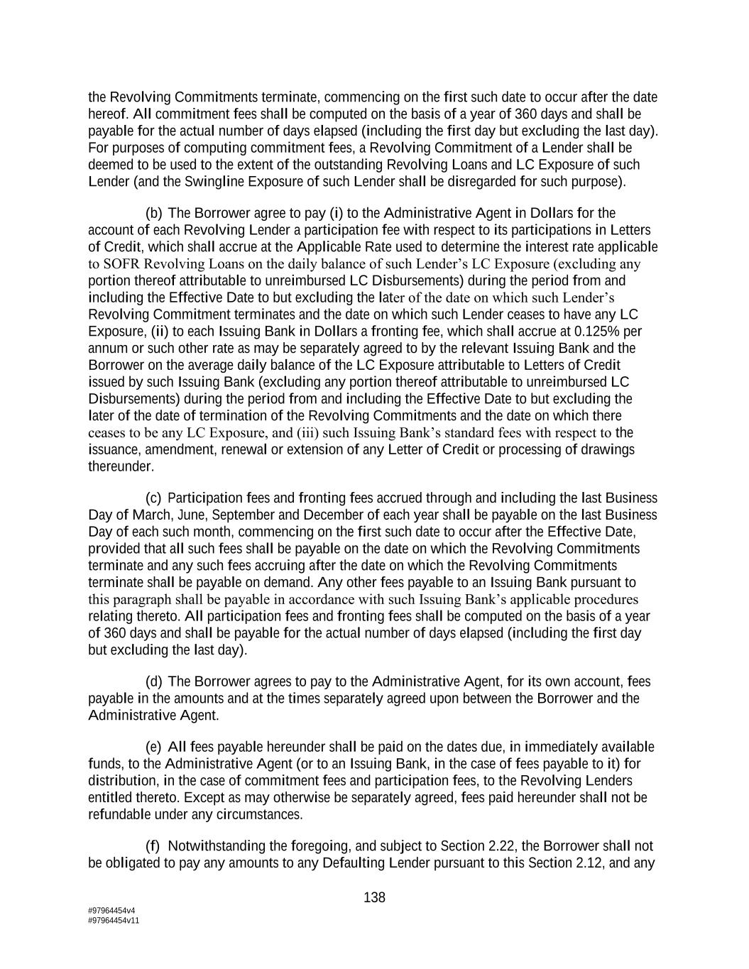 i #97964454v4 #97964454v11 TABLE OF CONTENTS PAGE ARTICLE 1 Definitions 2 Section 1.01. Defined Terms. 2 Section 1.02. Classification of Loans and Borrowings. 99101 Section 1.03. Terms Generally 99. . 101 Section 1.04. Accounting Terms; GAAP. 99101 Section 1.05. Currency Translation; Rates. 101103 Section 1.06. Timing of Payment of Performance. 101104 Section 1.07. Cashless Rollovers. 102104 Section 1.08. Certain Calculations and Tests. 102104 Section 1.09. Rounding. 103105 Section 1.10. [Reserved]. 103106 Section 1.11. Pro Forma and Other Calculations. 103106 ARTICLE 2 THE CREDITS 108 Section 2.01. Commitments. 106108 Section 2.02. Loans and Borrowings. 107109 Section 2.03. Requests for Borrowings. 108110 Section 2.04. Swingline Loans. 109111 Section 2.05. Letters of Credit. 111114 Section 2.06. Funding of Borrowings. 117121 Section 2.07. Interest Elections. 118122 Section 2.08. Termination and Reduction of Commitments. 119123 Section 2.09. Repayment of Loans; Evidence of Debt. 121125 Section 2.10. Amortization of Term Loans. 123127 Section 2.11. Prepayment of Loans. 123127 Section 2.12. Fees. 132136 Section 2.13. Interest. 134138 Section 2.14. Alternate Rate of Interest; Benchmark Replacement Setting. 135139 Section 2.15. Increased Costs. 137141 Section 2.16. Break Funding Payments. 138143 Section 2.17. Taxes. 139143 Section 2.18. Payments Generally; Pro Rata Treatment; Sharing of Setoffs. 143147 Section 2.19. Mitigation Obligations; Replacement of Lenders. 144149 Section 2.20. Incremental Loans and Commitments. 145150 Section 2.21. [Reserved]. 150154 Section 2.22. Defaulting Lenders. 150154 Section 2.23. Illegality. 152156 Section 2.24. Loan Modification Offers. 153157 ARTICLE 3 REPRESENTATIONS AND WARRANTIES 162 Section 3.01. Organization; Powers. 158162 Section 3.02. Authorization; Enforceability. 158162 Section 3.03. Governmental Approvals; No Conflicts. 158162