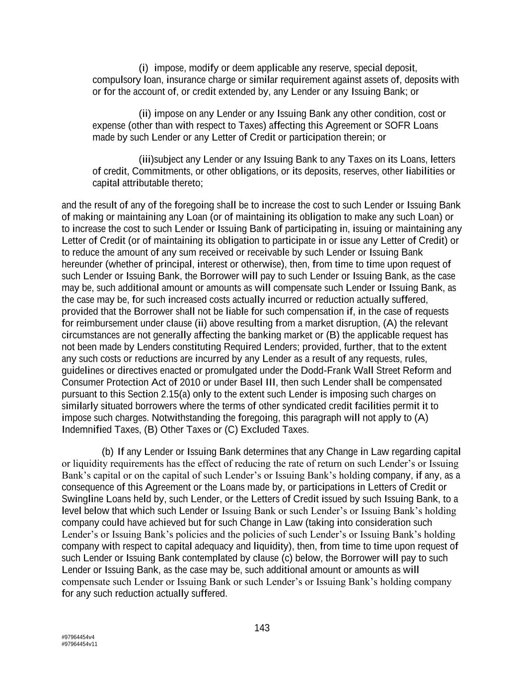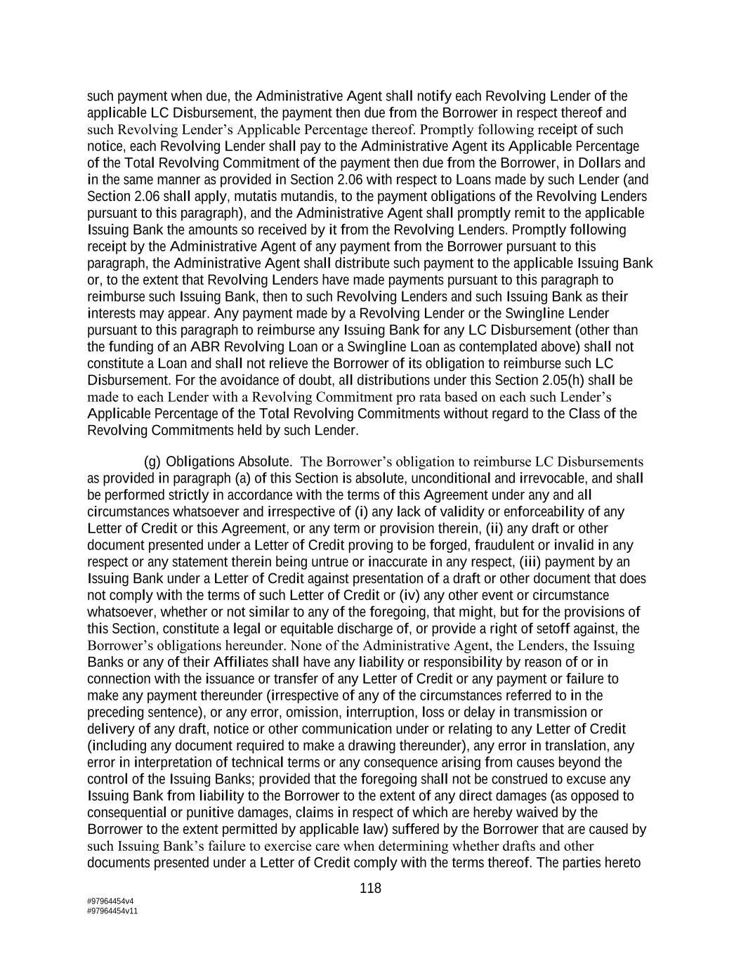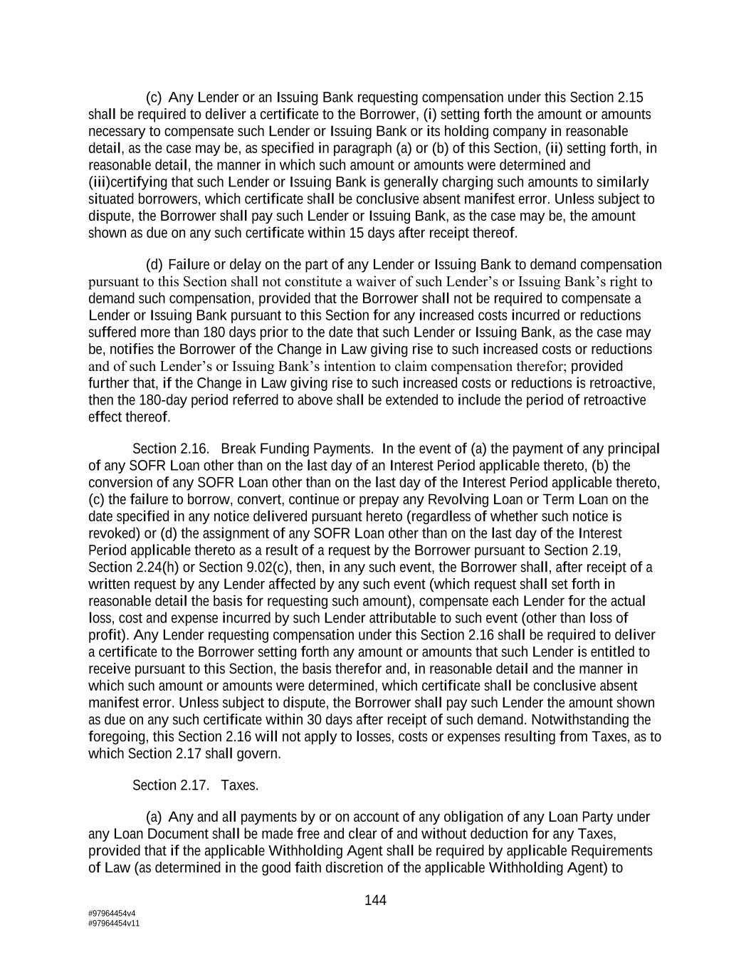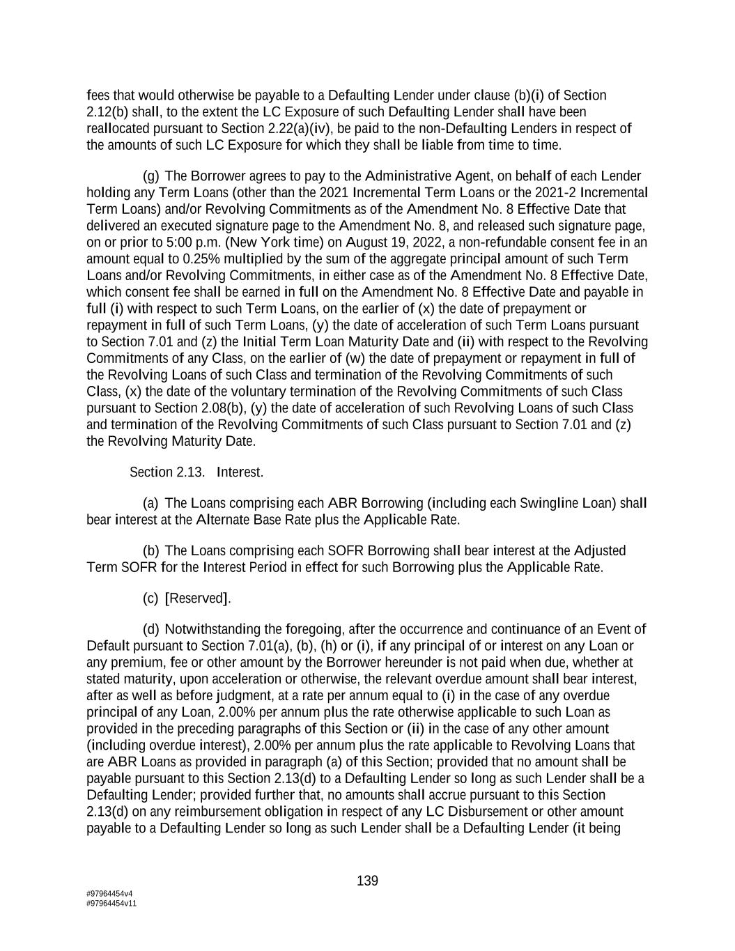 i #97964454v4 #97964454v11 TABLE OF CONTENTS PAGE ARTICLE 1 Definitions 2 Section 1.01. Defined Terms. 2 Section 1.02. Classification of Loans and Borrowings. 99101 Section 1.03. Terms Generally 99. . 101 Section 1.04. Accounting Terms; GAAP. 99101 Section 1.05. Currency Translation; Rates. 101103 Section 1.06. Timing of Payment of Performance. 101104 Section 1.07. Cashless Rollovers. 102104 Section 1.08. Certain Calculations and Tests. 102104 Section 1.09. Rounding. 103105 Section 1.10. [Reserved]. 103106 Section 1.11. Pro Forma and Other Calculations. 103106 ARTICLE 2 THE CREDITS 108 Section 2.01. Commitments. 106108 Section 2.02. Loans and Borrowings. 107109 Section 2.03. Requests for Borrowings. 108110 Section 2.04. Swingline Loans. 109111 Section 2.05. Letters of Credit. 111114 Section 2.06. Funding of Borrowings. 117121 Section 2.07. Interest Elections. 118122 Section 2.08. Termination and Reduction of Commitments. 119123 Section 2.09. Repayment of Loans; Evidence of Debt. 121125 Section 2.10. Amortization of Term Loans. 123127 Section 2.11. Prepayment of Loans. 123127 Section 2.12. Fees. 132136 Section 2.13. Interest. 134138 Section 2.14. Alternate Rate of Interest; Benchmark Replacement Setting. 135139 Section 2.15. Increased Costs. 137141 Section 2.16. Break Funding Payments. 138143 Section 2.17. Taxes. 139143 Section 2.18. Payments Generally; Pro Rata Treatment; Sharing of Setoffs. 143147 Section 2.19. Mitigation Obligations; Replacement of Lenders. 144149 Section 2.20. Incremental Loans and Commitments. 145150 Section 2.21. [Reserved]. 150154 Section 2.22. Defaulting Lenders. 150154 Section 2.23. Illegality. 152156 Section 2.24. Loan Modification Offers. 153157 ARTICLE 3 REPRESENTATIONS AND WARRANTIES 162 Section 3.01. Organization; Powers. 158162 Section 3.02. Authorization; Enforceability. 158162 Section 3.03. Governmental Approvals; No Conflicts. 158162