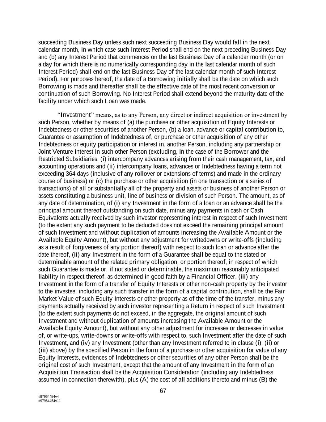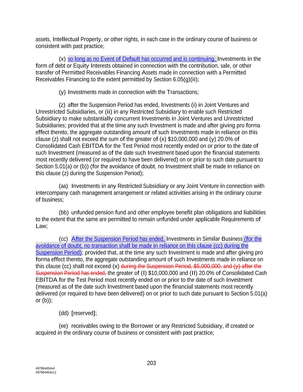 203 #97964454v4 #97964454v11 assets, Intellectual Property, or other rights, in each case in the ordinary course of business or consistent with past practice; (x) so long as no Event of Default has occurred and is continuing, Investments in the form of debt or Equity Interests obtained in connection with the contribution, sale, or other transfer of Permitted Receivables Financing Assets made in connection with a Permitted Receivables Financing to the extent permitted by Section 6.05(g)(ii); (y) Investments made in connection with the Transactions; (z) after the Suspension Period has ended, Investments (i) in Joint Ventures and Unrestricted Subsidiaries, or (ii) in any Restricted Subsidiary to enable such Restricted Subsidiary to make substantially concurrent Investments in Joint Ventures and Unrestricted Subsidiaries; provided that at the time any such Investment is made and after giving pro forma effect thereto, the aggregate outstanding amount of such Investments made in reliance on this clause (z) shall not exceed the sum of the greater of (x) $10,000,000 and (y) 20.0% of Consolidated Cash EBITDA for the Test Period most recently ended on or prior to the date of such Investment (measured as of the date such Investment based upon the financial statements most recently delivered (or required to have been delivered) on or prior to such date pursuant to Section 5.01(a) or (b)) (for the avoidance of doubt, no Investment shall be made in reliance on this clause (z) during the Suspension Period); (aa) Investments in any Restricted Subsidiary or any Joint Venture in connection with intercompany cash management arrangement or related activities arising in the ordinary course of business; (bb) unfunded pension fund and other employee benefit plan obligations and liabilities to the extent that the same are permitted to remain unfunded under applicable Requirements of Law; (cc) After the Suspension Period has ended, Investments in Similar Business (for the avoidance of doubt, no transaction shall be made in reliance on this clause (cc) during the Suspension Period); provided that, at the time any such Investment is made and after giving pro forma effect thereto, the aggregate outstanding amount of such Investments made in reliance on this clause (cc) shall not exceed (x) during the Suspension Period, $5,000,000, and (y) after the Suspension Period has ended, the greater of (I) $10,000,000 and (II) 20.0% of Consolidated Cash EBITDA for the Test Period most recently ended on or prior to the date of such Investment (measured as of the date such Investment based upon the financial statements most recently delivered (or required to have been delivered) on or prior to such date pursuant to Section 5.01(a) or (b)); (dd) [reserved]; (ee) receivables owing to the Borrower or any Restricted Subsidiary, if created or acquired in the ordinary course of business or consistent with past practice;
