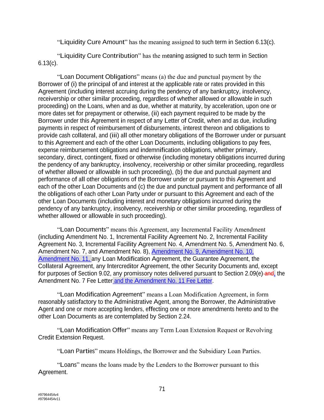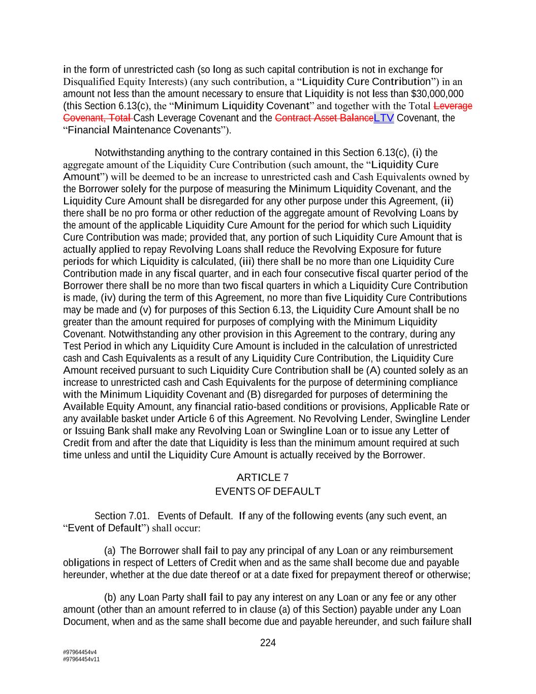 224 #97964454v4 #97964454v11 in the form of unrestricted cash (so long as such capital contribution is not in exchange for Disqualified Equity Interests) (any such contribution, a “Liquidity Cure Contribution”) in an amount not less than the amount necessary to ensure that Liquidity is not less than $30,000,000 (this Section 6.13(c), the “Minimum Liquidity Covenant” and together with the Total Leverage Covenant, Total Cash Leverage Covenant and the Contract Asset BalanceLTV Covenant, the “Financial Maintenance Covenants”). Notwithstanding anything to the contrary contained in this Section 6.13(c), (i) the aggregate amount of the Liquidity Cure Contribution (such amount, the “Liquidity Cure Amount”) will be deemed to be an increase to unrestricted cash and Cash Equivalents owned by the Borrower solely for the purpose of measuring the Minimum Liquidity Covenant, and the Liquidity Cure Amount shall be disregarded for any other purpose under this Agreement, (ii) there shall be no pro forma or other reduction of the aggregate amount of Revolving Loans by the amount of the applicable Liquidity Cure Amount for the period for which such Liquidity Cure Contribution was made; provided that, any portion of such Liquidity Cure Amount that is actually applied to repay Revolving Loans shall reduce the Revolving Exposure for future periods for which Liquidity is calculated, (iii) there shall be no more than one Liquidity Cure Contribution made in any fiscal quarter, and in each four consecutive fiscal quarter period of the Borrower there shall be no more than two fiscal quarters in which a Liquidity Cure Contribution is made, (iv) during the term of this Agreement, no more than five Liquidity Cure Contributions may be made and (v) for purposes of this Section 6.13, the Liquidity Cure Amount shall be no greater than the amount required for purposes of complying with the Minimum Liquidity Covenant. Notwithstanding any other provision in this Agreement to the contrary, during any Test Period in which any Liquidity Cure Amount is included in the calculation of unrestricted cash and Cash Equivalents as a result of any Liquidity Cure Contribution, the Liquidity Cure Amount received pursuant to such Liquidity Cure Contribution shall be (A) counted solely as an increase to unrestricted cash and Cash Equivalents for the purpose of determining compliance with the Minimum Liquidity Covenant and (B) disregarded for purposes of determining the Available Equity Amount, any financial ratio-based conditions or provisions, Applicable Rate or any available basket under Article 6 of this Agreement. No Revolving Lender, Swingline Lender or Issuing Bank shall make any Revolving Loan or Swingline Loan or to issue any Letter of Credit from and after the date that Liquidity is less than the minimum amount required at such time unless and until the Liquidity Cure Amount is actually received by the Borrower. ARTICLE 7 EVENTS OF DEFAULT Section 7.01. Events of Default. If any of the following events (any such event, an “Event of Default”) shall occur: (a) The Borrower shall fail to pay any principal of any Loan or any reimbursement obligations in respect of Letters of Credit when and as the same shall become due and payable hereunder, whether at the due date thereof or at a date fixed for prepayment thereof or otherwise; (b) any Loan Party shall fail to pay any interest on any Loan or any fee or any other amount (other than an amount referred to in clause (a) of this Section) payable under any Loan Document, when and as the same shall become due and payable hereunder, and such failure shall