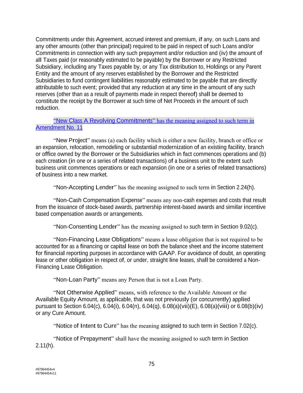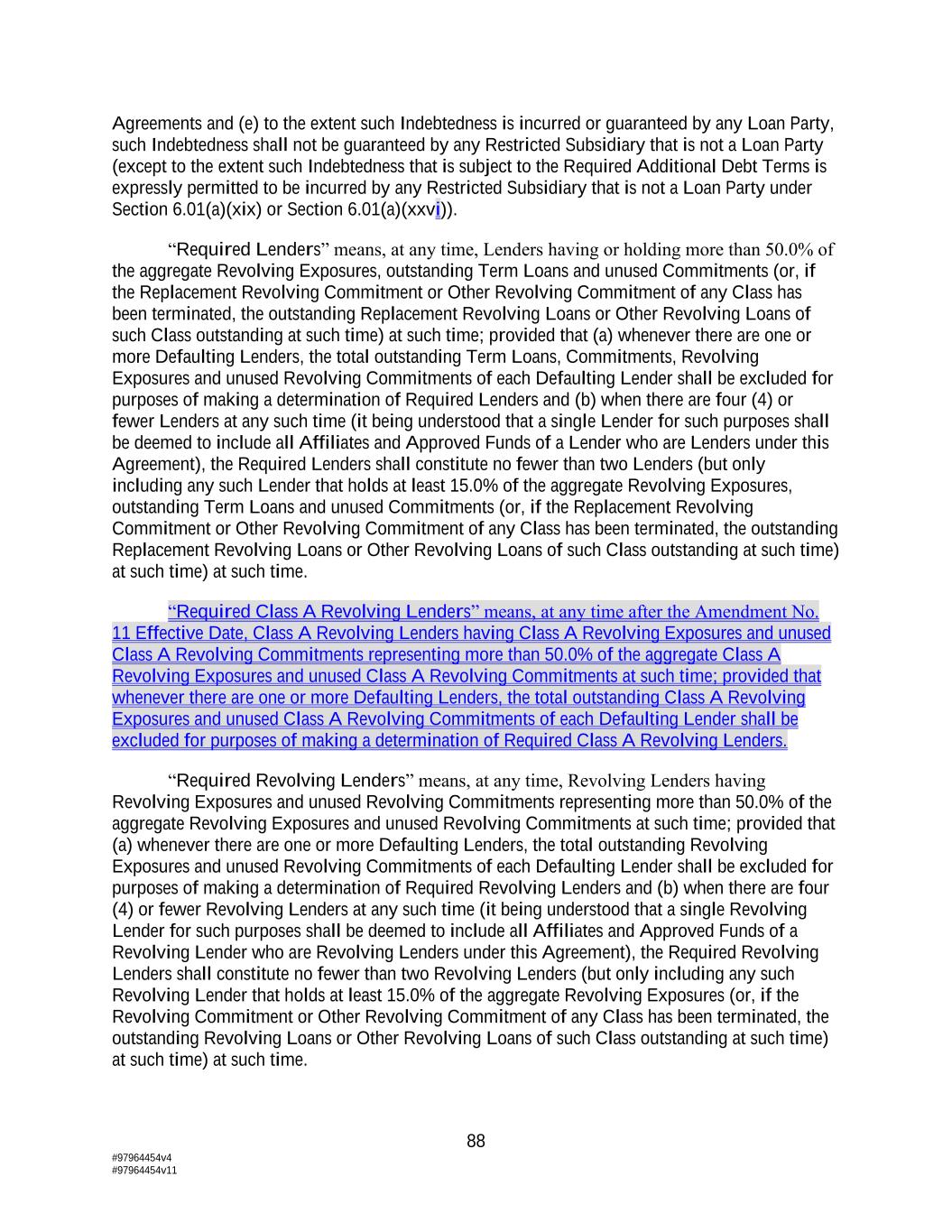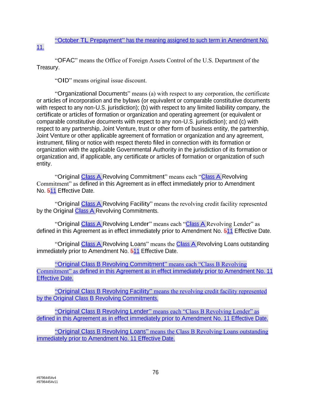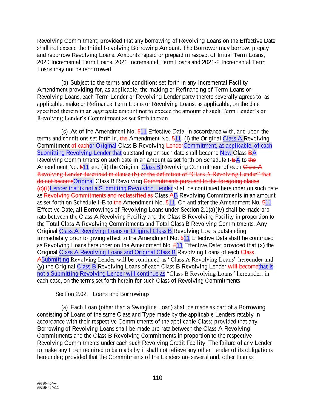 20 #97964454v4 #97964454v11 directives promulgated by the Bank of International Settlements, the Basel Committee on Banking Supervision (or any successor or similar authority) or United States or foreign regulatory authorities, in each case pursuant to Basel III, shall in each case be deemed to be a “Change in Law,” regardless of the date enacted, adopted, promulgated or issued after the date of this Agreement, but only to the extent the relevant increased costs or loss of yield would have been included if they had been imposed under applicable increased cost provisions, including, without limitation, for purposes of Section 2.15. “Class” when used in reference to (a) any Loan or Borrowing, refers to whether such Loan, or the Loans comprising such Borrowing, are Revolving Loans, Class A Revolving Loans, Class B Revolving Loans, Other Revolving Loans, Initial Term Loans, 2020 Incremental Term Loans, 2021 Incremental Term Loans, 2021-2 Incremental Term Loans, any other Incremental Term Loans, Replacement Revolving Loans, Other Term Loans, or Swingline Loans, (b) any Commitment, refers to whether such Commitment is a Revolving Commitment, Class A Revolving Commitment, Class B Revolving Commitment, Other Revolving Commitment, Replacement Revolving Commitment, Initial Term Loan Commitment, 2020 Incremental Term Loan Commitment, 2021 Incremental Term Loan Commitment, 2021-2 Incremental Term Loan Commitment, any other Incremental Commitment or Other Term Commitment and (c) any Lender, refers to whether such Lender has a Loan or Commitment with respect to a particular Class of Loans or Commitments. Other Term Commitments, Other Term Loans, Other Revolving Commitments (and the Other Revolving Loans made pursuant thereto), Incremental Commitments and Incremental Term Loans, Replacement Revolving Commitments (and Replacement Revolving Loans made pursuant thereto) that have different terms and conditions shall be construed to be in different Classes. “Class A Revolving Commitment” means (a) prior to the Amendment No. 511 Effective Date, with respect to each Original Class A Revolving Lender, its Original Class A Revolving Commitment and (b) on orand after Amendment No. 511 Effective Date, (i) with respect to each OriginalClass A Revolving Lender that is not party to the Amendment No. 5 but whose name is set forth on Schedule 1-B to Amendment No. 5, the amount set forth onunder Schedule 1-B toA of Amendment No. 5 opposite such Lender’s name as such Lender’s Commitment under the heading “Class A Revolving Commitments,” which Commitment shall terminate on the Revolving Maturity Date, as such Class A Revolving Commitment may be reduced from time to time pursuant to the terms hereof and11, (ii) in the case of any Lender that receives an assignment of any portion of a Class A Revolving Commitment after the Amendment No. 11 Effective Date, the amount specified as such Lender’s “Class A Revolving Commitment” in the Assignment and Acceptance pursuant to which such Lender assumed a portion of the Total Class A Revolving Commitment, as such Class A Revolving Commitment may be reduced from time to time pursuant to the terms hereof and (iii) in the case of any Class A Revolving Lender that increases its Class A Revolving Commitment or becomes an Incremental Revolving Credit Commitment Increase Lender, in each case pursuant to Section 2.20, the amount specified in the applicable Incremental Agreement, in each case under this clause (b), as such Class A Revolving Commitment may be reduced from time to time pursuant to the terms hereof. As of Amendment No. 511 Effective Date, the aggregate amount of the Class A Revolving Commitments outstanding is $30,000,00088,500,000.