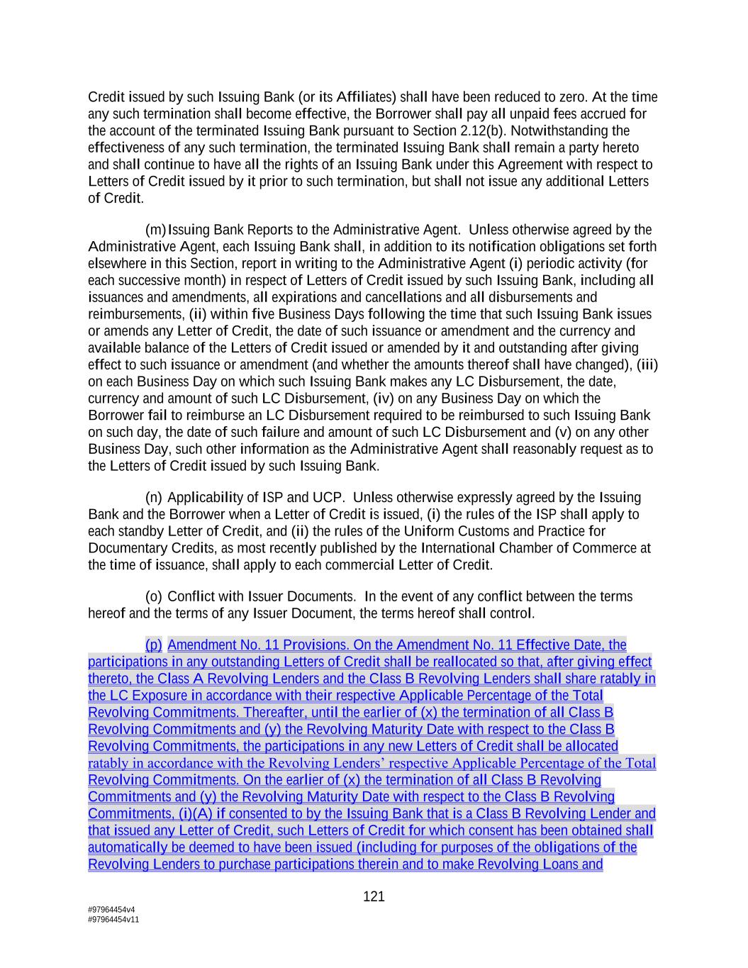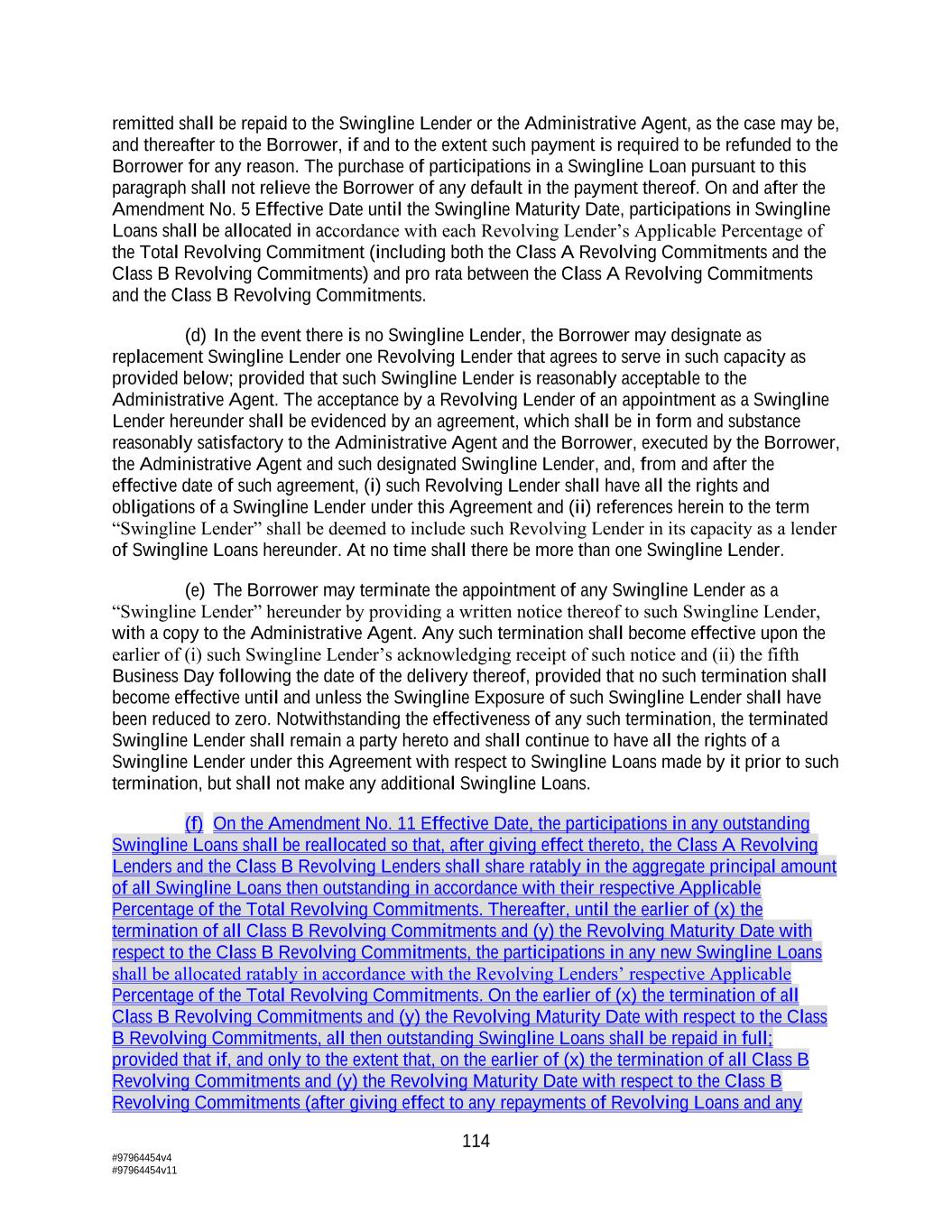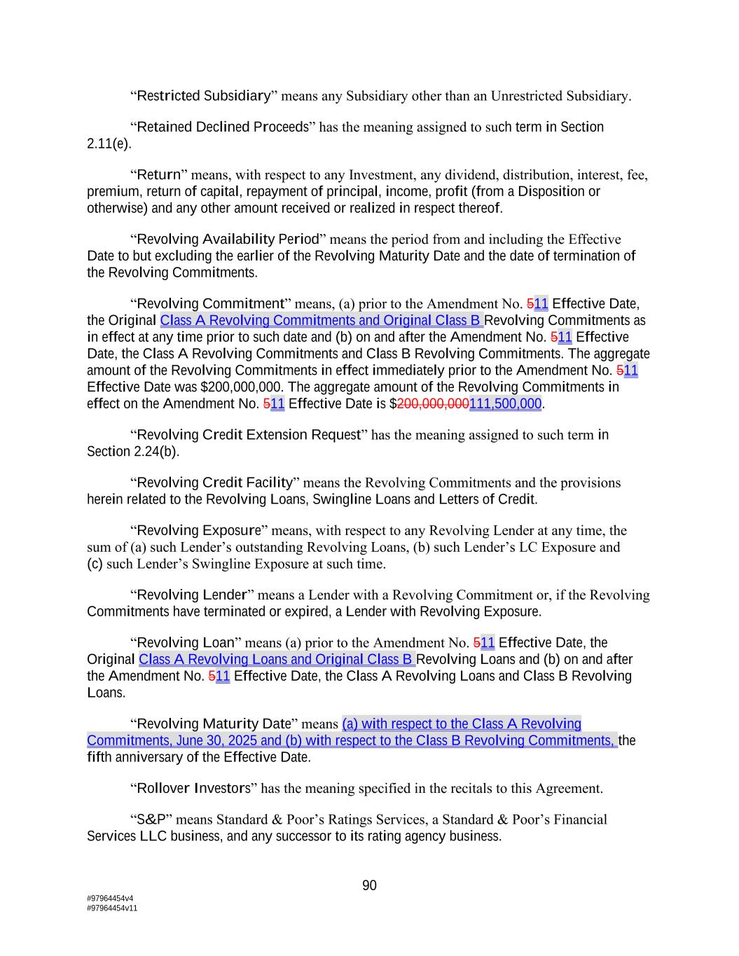 20 #97964454v4 #97964454v11 directives promulgated by the Bank of International Settlements, the Basel Committee on Banking Supervision (or any successor or similar authority) or United States or foreign regulatory authorities, in each case pursuant to Basel III, shall in each case be deemed to be a “Change in Law,” regardless of the date enacted, adopted, promulgated or issued after the date of this Agreement, but only to the extent the relevant increased costs or loss of yield would have been included if they had been imposed under applicable increased cost provisions, including, without limitation, for purposes of Section 2.15. “Class” when used in reference to (a) any Loan or Borrowing, refers to whether such Loan, or the Loans comprising such Borrowing, are Revolving Loans, Class A Revolving Loans, Class B Revolving Loans, Other Revolving Loans, Initial Term Loans, 2020 Incremental Term Loans, 2021 Incremental Term Loans, 2021-2 Incremental Term Loans, any other Incremental Term Loans, Replacement Revolving Loans, Other Term Loans, or Swingline Loans, (b) any Commitment, refers to whether such Commitment is a Revolving Commitment, Class A Revolving Commitment, Class B Revolving Commitment, Other Revolving Commitment, Replacement Revolving Commitment, Initial Term Loan Commitment, 2020 Incremental Term Loan Commitment, 2021 Incremental Term Loan Commitment, 2021-2 Incremental Term Loan Commitment, any other Incremental Commitment or Other Term Commitment and (c) any Lender, refers to whether such Lender has a Loan or Commitment with respect to a particular Class of Loans or Commitments. Other Term Commitments, Other Term Loans, Other Revolving Commitments (and the Other Revolving Loans made pursuant thereto), Incremental Commitments and Incremental Term Loans, Replacement Revolving Commitments (and Replacement Revolving Loans made pursuant thereto) that have different terms and conditions shall be construed to be in different Classes. “Class A Revolving Commitment” means (a) prior to the Amendment No. 511 Effective Date, with respect to each Original Class A Revolving Lender, its Original Class A Revolving Commitment and (b) on orand after Amendment No. 511 Effective Date, (i) with respect to each OriginalClass A Revolving Lender that is not party to the Amendment No. 5 but whose name is set forth on Schedule 1-B to Amendment No. 5, the amount set forth onunder Schedule 1-B toA of Amendment No. 5 opposite such Lender’s name as such Lender’s Commitment under the heading “Class A Revolving Commitments,” which Commitment shall terminate on the Revolving Maturity Date, as such Class A Revolving Commitment may be reduced from time to time pursuant to the terms hereof and11, (ii) in the case of any Lender that receives an assignment of any portion of a Class A Revolving Commitment after the Amendment No. 11 Effective Date, the amount specified as such Lender’s “Class A Revolving Commitment” in the Assignment and Acceptance pursuant to which such Lender assumed a portion of the Total Class A Revolving Commitment, as such Class A Revolving Commitment may be reduced from time to time pursuant to the terms hereof and (iii) in the case of any Class A Revolving Lender that increases its Class A Revolving Commitment or becomes an Incremental Revolving Credit Commitment Increase Lender, in each case pursuant to Section 2.20, the amount specified in the applicable Incremental Agreement, in each case under this clause (b), as such Class A Revolving Commitment may be reduced from time to time pursuant to the terms hereof. As of Amendment No. 511 Effective Date, the aggregate amount of the Class A Revolving Commitments outstanding is $30,000,00088,500,000.