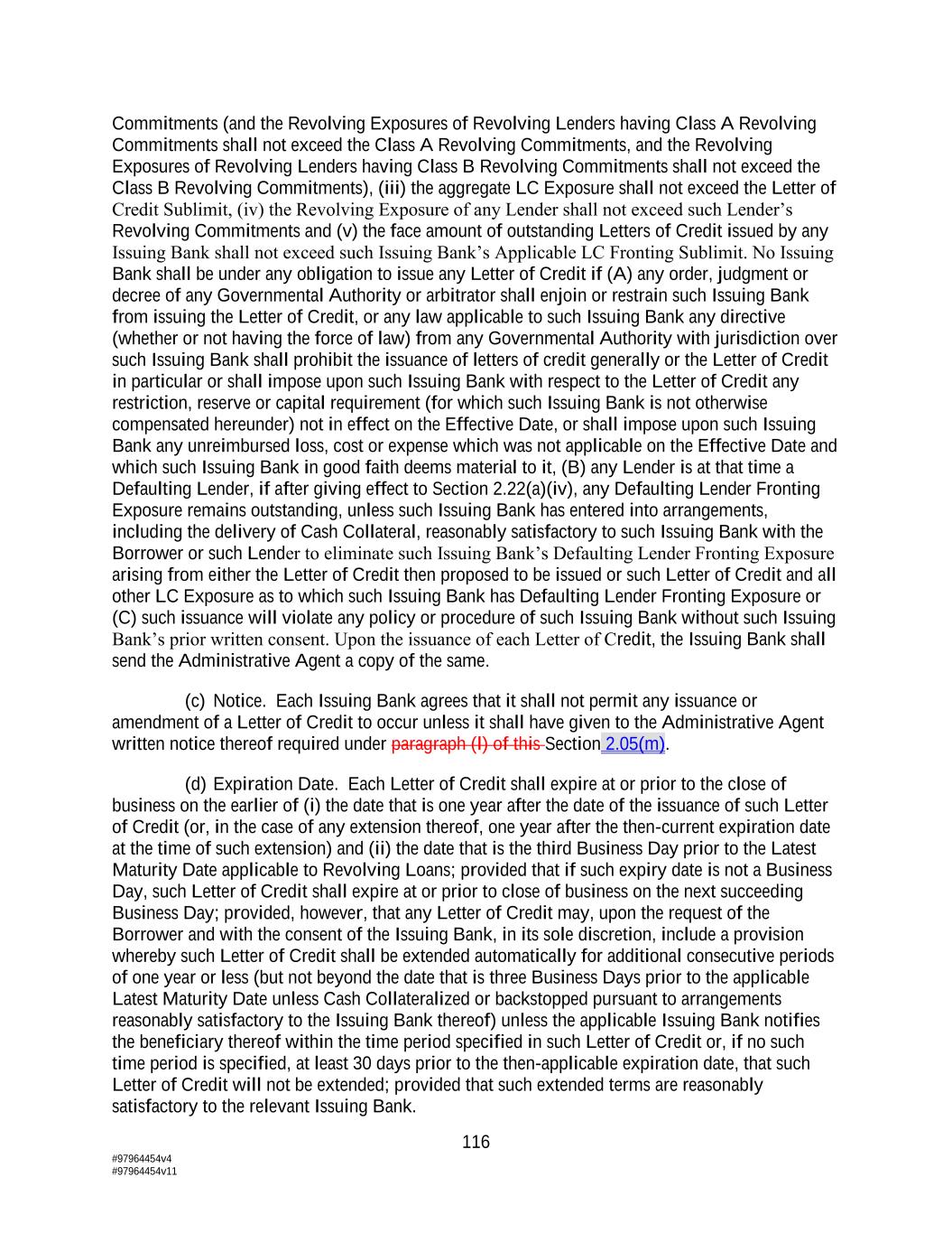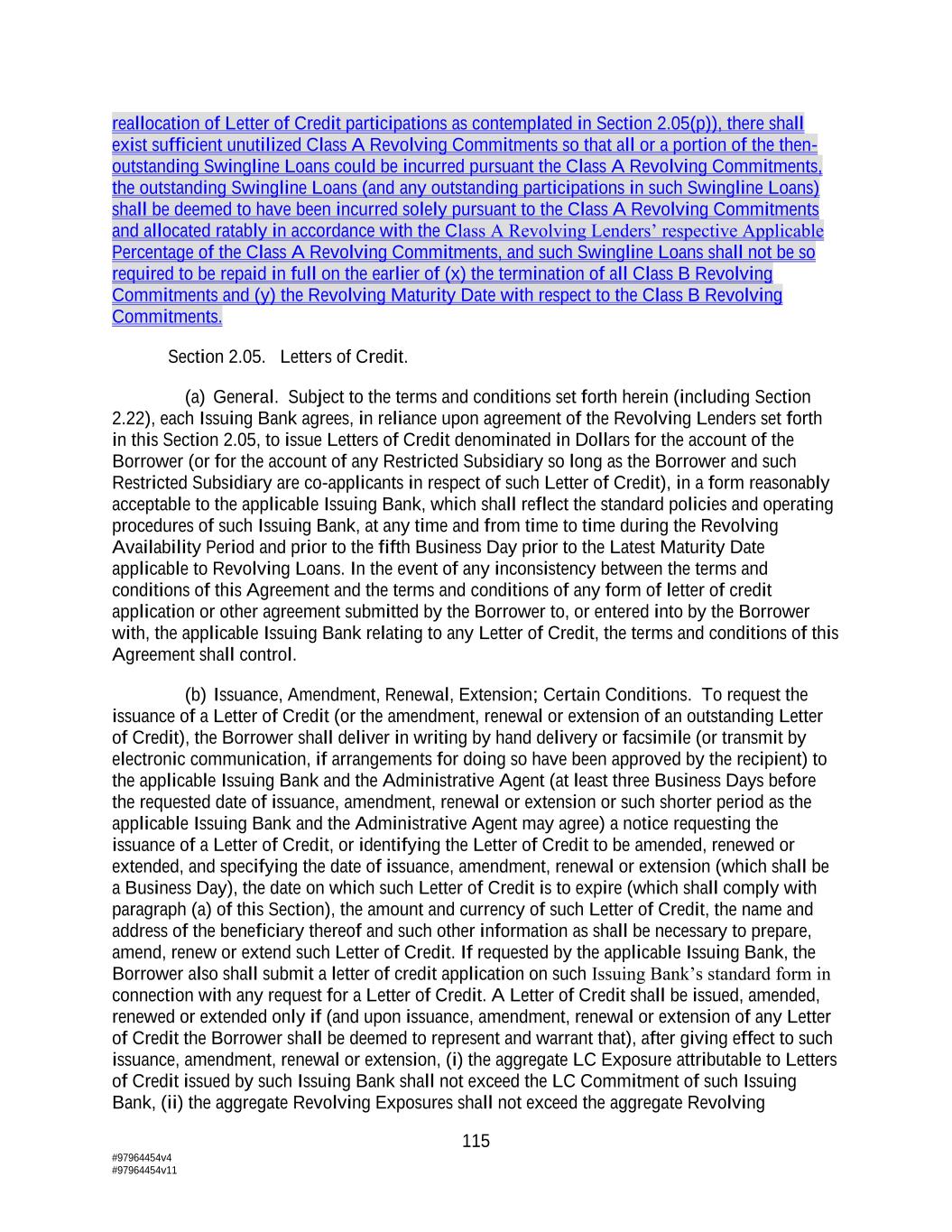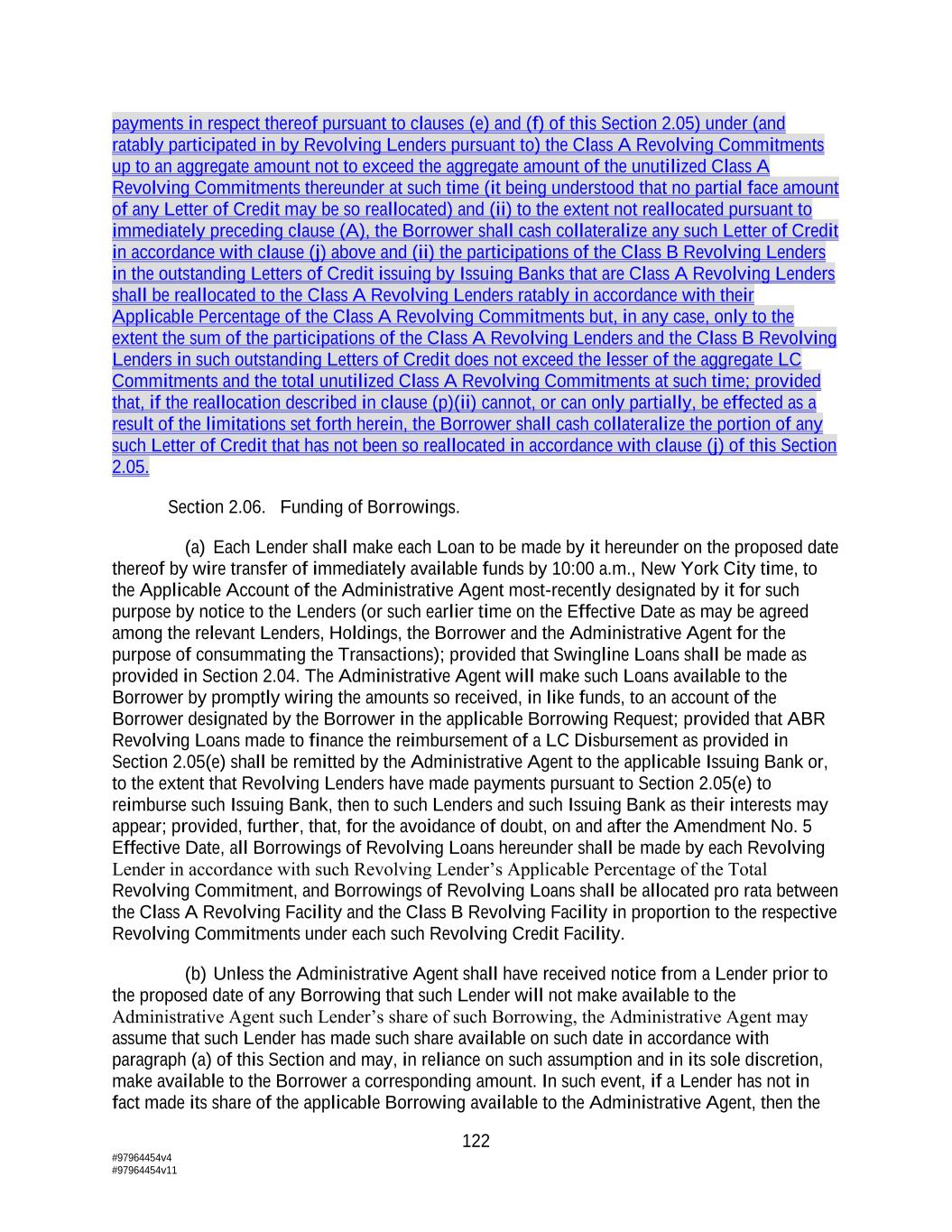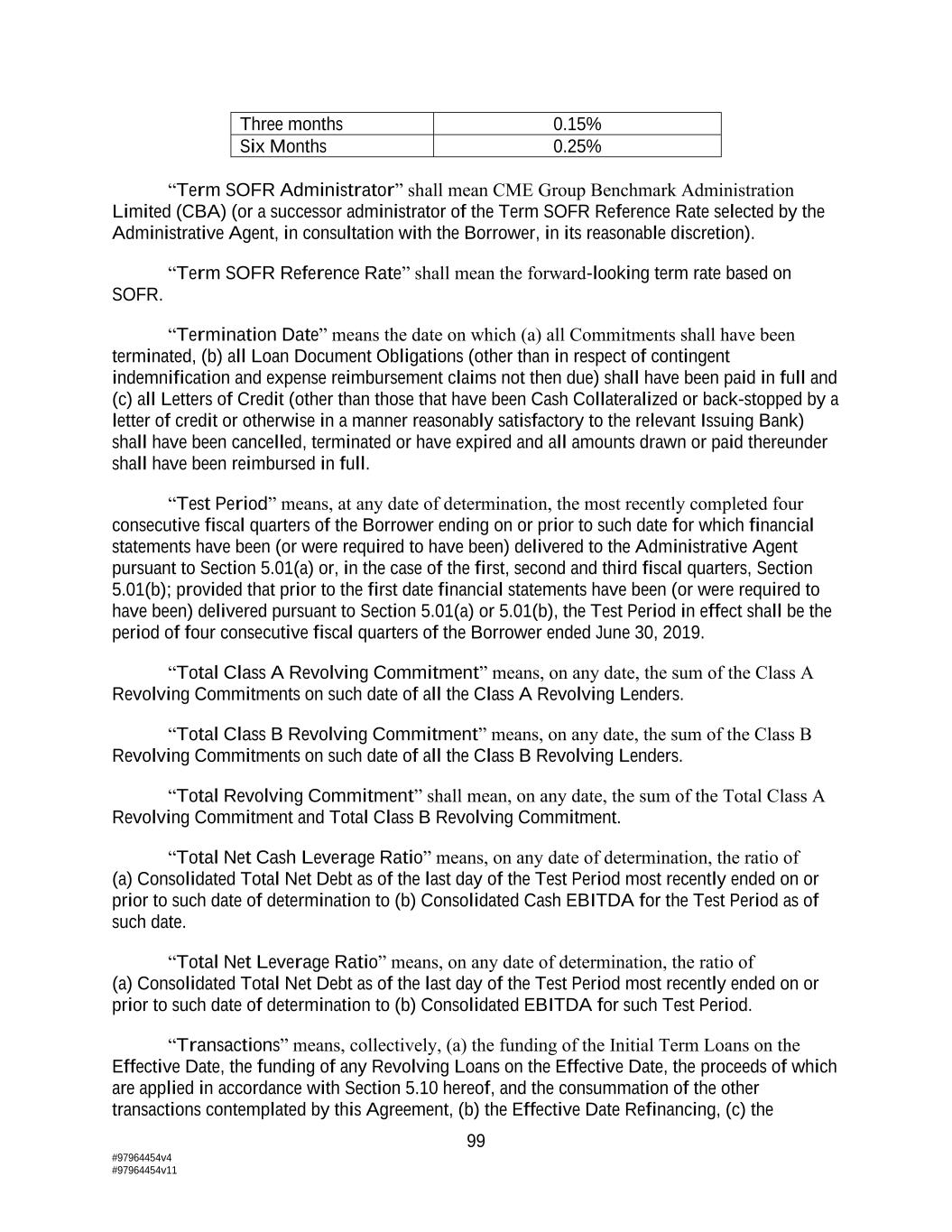 20 #97964454v4 #97964454v11 directives promulgated by the Bank of International Settlements, the Basel Committee on Banking Supervision (or any successor or similar authority) or United States or foreign regulatory authorities, in each case pursuant to Basel III, shall in each case be deemed to be a “Change in Law,” regardless of the date enacted, adopted, promulgated or issued after the date of this Agreement, but only to the extent the relevant increased costs or loss of yield would have been included if they had been imposed under applicable increased cost provisions, including, without limitation, for purposes of Section 2.15. “Class” when used in reference to (a) any Loan or Borrowing, refers to whether such Loan, or the Loans comprising such Borrowing, are Revolving Loans, Class A Revolving Loans, Class B Revolving Loans, Other Revolving Loans, Initial Term Loans, 2020 Incremental Term Loans, 2021 Incremental Term Loans, 2021-2 Incremental Term Loans, any other Incremental Term Loans, Replacement Revolving Loans, Other Term Loans, or Swingline Loans, (b) any Commitment, refers to whether such Commitment is a Revolving Commitment, Class A Revolving Commitment, Class B Revolving Commitment, Other Revolving Commitment, Replacement Revolving Commitment, Initial Term Loan Commitment, 2020 Incremental Term Loan Commitment, 2021 Incremental Term Loan Commitment, 2021-2 Incremental Term Loan Commitment, any other Incremental Commitment or Other Term Commitment and (c) any Lender, refers to whether such Lender has a Loan or Commitment with respect to a particular Class of Loans or Commitments. Other Term Commitments, Other Term Loans, Other Revolving Commitments (and the Other Revolving Loans made pursuant thereto), Incremental Commitments and Incremental Term Loans, Replacement Revolving Commitments (and Replacement Revolving Loans made pursuant thereto) that have different terms and conditions shall be construed to be in different Classes. “Class A Revolving Commitment” means (a) prior to the Amendment No. 511 Effective Date, with respect to each Original Class A Revolving Lender, its Original Class A Revolving Commitment and (b) on orand after Amendment No. 511 Effective Date, (i) with respect to each OriginalClass A Revolving Lender that is not party to the Amendment No. 5 but whose name is set forth on Schedule 1-B to Amendment No. 5, the amount set forth onunder Schedule 1-B toA of Amendment No. 5 opposite such Lender’s name as such Lender’s Commitment under the heading “Class A Revolving Commitments,” which Commitment shall terminate on the Revolving Maturity Date, as such Class A Revolving Commitment may be reduced from time to time pursuant to the terms hereof and11, (ii) in the case of any Lender that receives an assignment of any portion of a Class A Revolving Commitment after the Amendment No. 11 Effective Date, the amount specified as such Lender’s “Class A Revolving Commitment” in the Assignment and Acceptance pursuant to which such Lender assumed a portion of the Total Class A Revolving Commitment, as such Class A Revolving Commitment may be reduced from time to time pursuant to the terms hereof and (iii) in the case of any Class A Revolving Lender that increases its Class A Revolving Commitment or becomes an Incremental Revolving Credit Commitment Increase Lender, in each case pursuant to Section 2.20, the amount specified in the applicable Incremental Agreement, in each case under this clause (b), as such Class A Revolving Commitment may be reduced from time to time pursuant to the terms hereof. As of Amendment No. 511 Effective Date, the aggregate amount of the Class A Revolving Commitments outstanding is $30,000,00088,500,000.