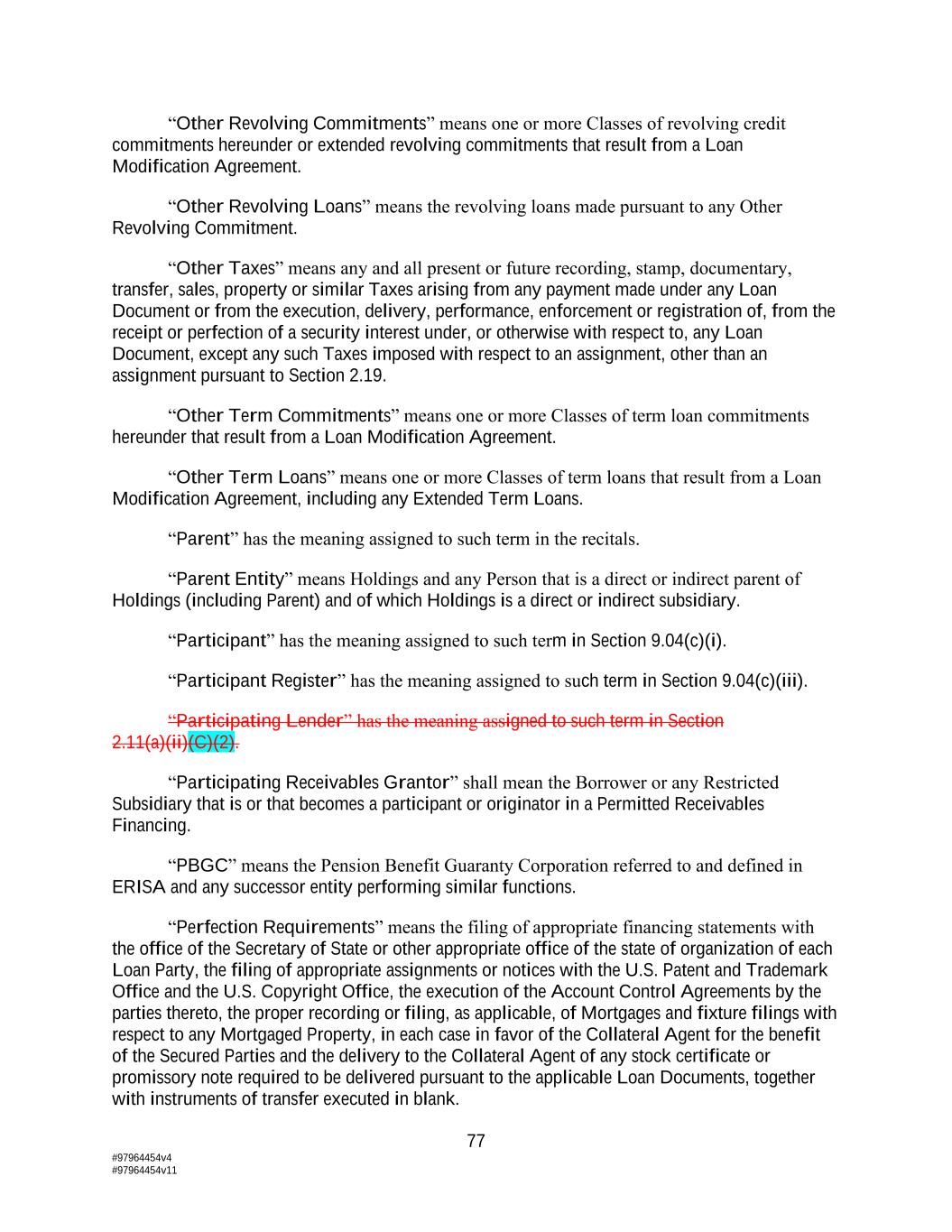 3 “New Class A Revolving Commitments” shall have the meaning provided in the recitals hereto. “New Class A Revolving Loans” shall have the meaning provided in the recitals hereto. “Perfection Certificate” shall mean the Perfection Certificate in the form attached hereto as Exhibit B or such other form as shall be approved by the Administrative Agent. “Releasee” shall have the meaning provided in Section 12 hereof. “Releasing Party” shall have the meaning provided in Section 12 hereof. “Submitted Revolving Commitment Amount” shall have the meaning provided in Section 3 hereof. “Submitting Revolving Lender” shall mean any Revolving Lender that submits to the Administrative Agent a signature page to this Agreement agreeing to exchange and reclassify its Existing Revolving Commitments and Existing Revolving Loans to New Class A Revolving Commitments and New Class A Revolving Loans, respectively. Section 2. Amendment. Pursuant to Section 9.02 of the Credit Agreement, the Borrower, Holdings, and Lenders hereby agree that, effective on the Amendment No. 11 Effective Date, the Credit Agreement shall be amended to delete the stricken text (indicated textually in the same manner as the following example: stricken text) and to add the double-underlined text (indicated textually in the same manner as the following example: added double-underlined text) as set forth in the pages of the Amended Credit Agreement attached as Exhibit A hereto. Section 3. New Class A Revolving Commitments. (a) Each Submitting Revolving Lender (A) irrevocably offers for exchange into a New Class A Revolving Commitment an amount of the Existing Revolving Commitment held by such Lender equal to the entire aggregate principal amount of its Existing Revolving Commitment (such Submitting Revolving Lender’s “Submitted Revolving Commitment Amount”) and (B) agrees that as of the Amendment No. 11 Effective Date, the entire aggregate principal amount of its Existing Revolving Loans will be exchanged and reclassified to become New Class A Revolving Loans and the entire aggregate principal amount of its Submitted Revolving Commitment will be exchanged and reclassified to become a New Class A Revolving Commitment in the amount set forth on Schedule 1-A hereto under the heading “New Class A Revolving Commitments” with respect to the Revolving Facility, in each case, having the terms set forth therefor in the Amended Credit Agreement. On and after the Amendment No. 11 Effective Date, all references under the Amended Credit Agreement to “Class A Revolving Commitments” shall be deemed to be a reference to the New Class A Revolving Commitments established pursuant to this Agreement. (b) As of the Amendment No. 11 Effective Date, the Existing Revolving Loans and Existing Revolving Commitment of each Revolving Lender that is not a party hereto by becoming a Submitting Revolving Lender shall remain outstanding as Class B Revolving Loans and a Class B Revolving Commitments, respectively, in the respective amounts set forth in Schedule 1-B