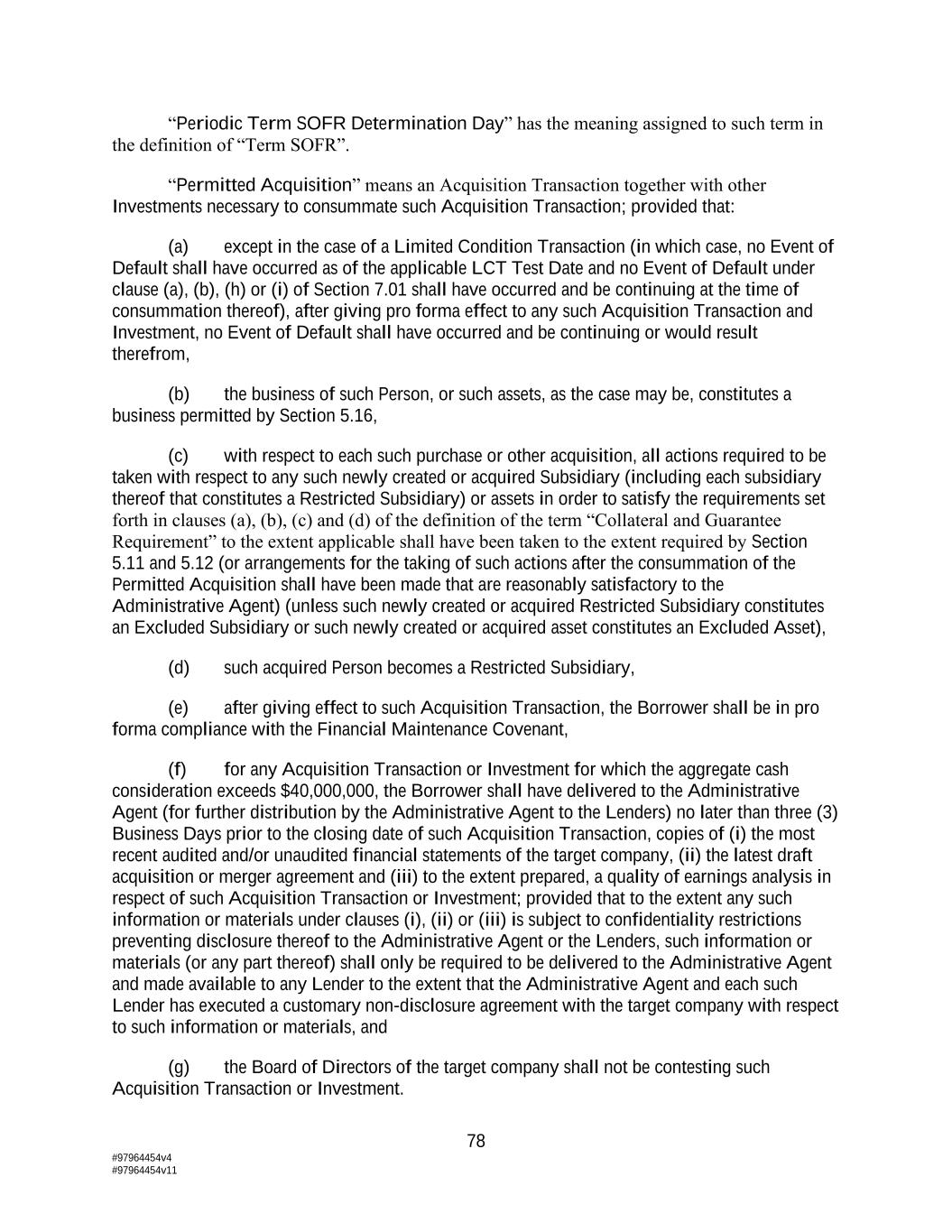 4 #97964454v4 #97964454v11 “ABR” when used in reference to any Loan or Borrowing, refers to whether such Loan, or the Loans comprising such Borrowing, are bearing interest at a rate determined by reference to the Alternate Base Rate. “ABR Term SOFR Determination Day” shall have the meaning assigned to such term in the definition of “Term SOFR”. “Account Control Agreement” has the meaning assigned to such term in clause (e) of the definition of “Collateral and Guarantee Requirement.” “Accounting Changes” has the meaning assigned to such term in Section 1.04(c). “Acquired EBITDA” means, with respect to any Pro Forma Entity for any period, the amount for such period of Consolidated EBITDA of such Pro Forma Entity (determined as if references to the Borrower and the Restricted Subsidiaries in the definition of “Consolidated EBITDA” (and in the component financial definitions used therein) were references to such Pro Forma Entity and its Subsidiaries which will become Restricted Subsidiaries), all as determined on a consolidated basis for such Pro Forma Entity. “Acquired Entity or Business” has the meaning assigned to such term in the definition of “Consolidated EBITDA.” “Acquisition” has the meaning assigned to such term in the recitals to this Agreement. “Acquisition Consideration” means, in connection with any Acquisition Transaction, the aggregate amount (as valued at the Fair Market Value of such Acquisition Transaction at the time such Acquisition Transaction is made) of, without duplication: (a) the purchase consideration paid or payable for such Acquisition Transaction, whether payable at or prior to the consummation of such Acquisition Transaction or deferred for payment at any future time, whether or not any such future payment is subject to the occurrence of any contingency, and including any and all payments representing the purchase price and any assumptions of Indebtedness and/or Guarantees, “earn-outs” and other agreements to make any payment the amount of which is, or the terms of payment of which are, in any respect subject to or contingent upon the revenues, income, cash flow or profits (or the like) of any Person or business and (b) the aggregate amount of Indebtedness assumed or acquired in connection with such Acquisition Transaction; provided in each case, that any such future payment that is subject to a contingency shall be considered Acquisition Consideration only to the extent of the reserve, if any, required under GAAP (as determined at the time of the consummation of such Acquisition Transaction) to be established in respect thereof by Holdings, the Borrower or any Restricted Subsidiary. “Acquisition Debt” has the meaning assigned to such term in Section 6.01(a)(xxvi). “Acquisition Transaction” means the purchase or other acquisition, by merger, consolidation or otherwise, by the Borrower or any Restricted Subsidiary of all Equity Interests in, or all or substantially all the assets of (or all or substantially all the assets constituting a business unit, division, product line or line of business of), any Person or of a majority of the outstanding Equity Interests of any Person (including any Investment which serves to increase