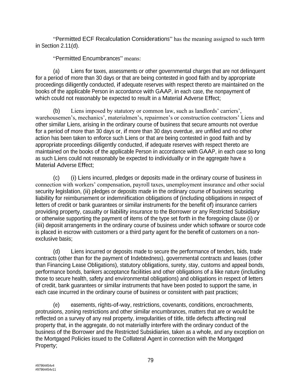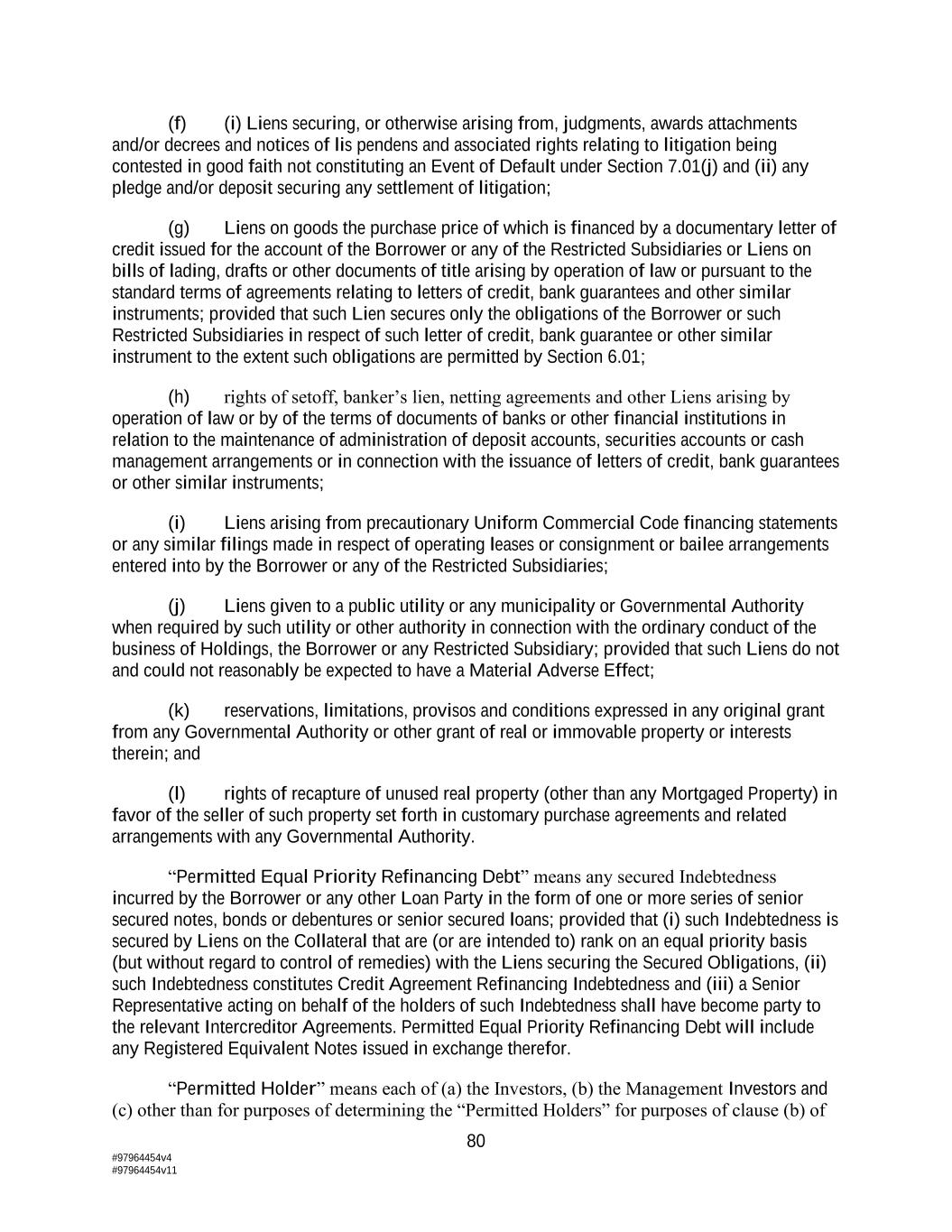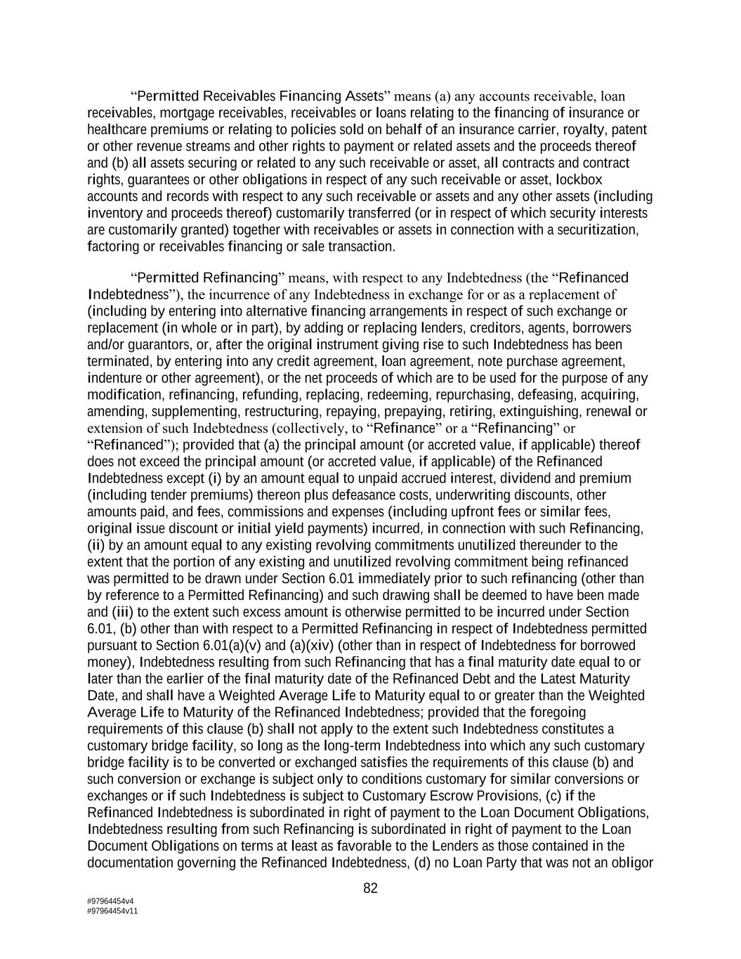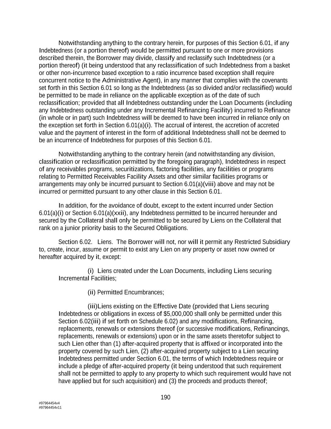 190 #97964454v4 #97964454v11 Notwithstanding anything to the contrary herein, for purposes of this Section 6.01, if any Indebtedness (or a portion thereof) would be permitted pursuant to one or more provisions described therein, the Borrower may divide, classify and reclassify such Indebtedness (or a portion thereof) (it being understood that any reclassification of such Indebtedness from a basket or other non-incurrence based exception to a ratio incurrence based exception shall require concurrent notice to the Administrative Agent), in any manner that complies with the covenants set forth in this Section 6.01 so long as the Indebtedness (as so divided and/or reclassified) would be permitted to be made in reliance on the applicable exception as of the date of such reclassification; provided that all Indebtedness outstanding under the Loan Documents (including any Indebtedness outstanding under any Incremental Refinancing Facility) incurred to Refinance (in whole or in part) such Indebtedness will be deemed to have been incurred in reliance only on the exception set forth in Section 6.01(a)(i). The accrual of interest, the accretion of accreted value and the payment of interest in the form of additional Indebtedness shall not be deemed to be an incurrence of Indebtedness for purposes of this Section 6.01. Notwithstanding anything to the contrary herein (and notwithstanding any division, classification or reclassification permitted by the foregoing paragraph), Indebtedness in respect of any receivables programs, securitizations, factoring facilities, any facilities or programs relating to Permitted Receivables Facility Assets and other similar facilities programs or arrangements may only be incurred pursuant to Section 6.01(a)(viii) above and may not be incurred or permitted pursuant to any other clause in this Section 6.01. In addition, for the avoidance of doubt, except to the extent incurred under Section 6.01(a)(i) or Section 6.01(a)(xxii), any Indebtedness permitted to be incurred hereunder and secured by the Collateral shall only be permitted to be secured by Liens on the Collateral that rank on a junior priority basis to the Secured Obligations. Section 6.02. Liens. The Borrower will not, nor will it permit any Restricted Subsidiary to, create, incur, assume or permit to exist any Lien on any property or asset now owned or hereafter acquired by it, except: (i) Liens created under the Loan Documents, including Liens securing Incremental Facilities; (ii) Permitted Encumbrances; (iii)Liens existing on the Effective Date (provided that Liens securing Indebtedness or obligations in excess of $5,000,000 shall only be permitted under this Section 6.02(iii) if set forth on Schedule 6.02) and any modifications, Refinancing, replacements, renewals or extensions thereof (or successive modifications, Refinancings, replacements, renewals or extensions) upon or in the same assets theretofor subject to such Lien other than (1) after-acquired property that is affixed or incorporated into the property covered by such Lien, (2) after-acquired property subject to a Lien securing Indebtedness permitted under Section 6.01, the terms of which Indebtedness require or include a pledge of after-acquired property (it being understood that such requirement shall not be permitted to apply to any property to which such requirement would have not have applied but for such acquisition) and (3) the proceeds and products thereof;
