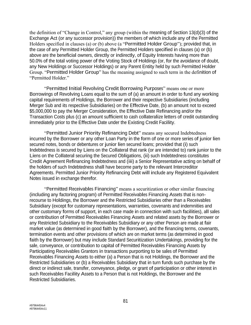 19 #97964454v4 #97964454v11 (a) the failure of Holdings, directly or indirectly through wholly owned subsidiaries that are Guarantors (including, for the avoidance of doubt, through wholly owned subsidiaries that are subsidiaries of the Borrower), to own all of the Equity Interests in the Borrower, (b) prior to an IPO, the failure by the Permitted Holders to, directly or indirectly through one or more holding companies, own beneficially and of record at least a majority of the outstanding Voting Stock of Holdings, or (c) after an IPO, any person, entity or “group” (within the meaning of Section 13(d)(3) or Section 14(d)(2) of the Exchange Act, but excluding any employee benefit plan and/or Person acting as the trustee, agent or other fiduciary or administrator therefor), other than the Permitted Holders (or any Parent Entity of Holdings controlled directly or indirectly by the Permitted Holders), shall at any time have acquired direct or indirect beneficial ownership of voting power of the outstanding Voting Stock of Holdings having more than the greater of (A) 35.0% of the outstanding Voting Stock of Holdings and (B) the percentage of the then-existing outstanding Voting Stock of Holdings owned in the aggregate, directly or indirectly, beneficially, by the Permitted Holders, unless the Permitted Holders, directly or indirectly through one or more Parent Entities of Holdings, have the right (pursuant to contract, proxy, ownership of Equity Interests or otherwise) to designate or appoint (and do so designate or appoint) the Board of Directors of Holdings. For purposes of this definition and any related definition to the extent used for purposes of this definition, (i) “beneficial ownership” shall be as defined in Rules 13(d)-3 and 13(d)-5 under the Exchange Act, (ii) the phrase Person or “group” is within the meaning of Section 13(d) or 14(d) of the Exchange Act, but excluding any employee benefit plan of such Person or “group” and its subsidiaries and any Person acting in its capacity as trustee, agent or other fiduciary or administrator of any such plan, (iii) a Person or group shall not be deemed to beneficially own securities subject to an equity or asset purchase agreement, merger agreement or similar agreement (or voting or option or similar agreement related thereto) until the consummation of the transactions contemplated by such agreement, (iv) if any group includes one or more Permitted Holders, the issued and outstanding Voting Stock of Holdings beneficially owned, directly or indirectly, by any Permitted Holders that are part of such group shall not be treated as being beneficially owned by any other member of such group for purposes of determining whether a Change in Control has occurred and (v) a Person or group will not be deemed to beneficially own the Voting Stock of another Person as a result of its ownership of the Voting Stock or other securities of such other Person’s Parent Entity (or related contractual rights) unless it owns at least a majority of the total voting power of the Voting Stock of such Parent Entity. “Change in Law” means (a) the adoption of any rule, regulation, treaty or other law after the date of this Agreement, (b) any change in any rule, regulation, treaty or other law or in the administration or interpretation thereof by any Governmental Authority after the date of this Agreement or (c) the making or issuance of any request, guideline or directive (whether or not having the force of law) of any Governmental Authority made or issued after the date of this Agreement; provided that, notwithstanding anything herein to the contrary, (i) the Dodd-Frank Wall Street Reform and Consumer Protection Act of 2010 and any requests, rules, guidelines or directives thereunder or issued in connection therewith and (ii) any requests, rules, guidelines or