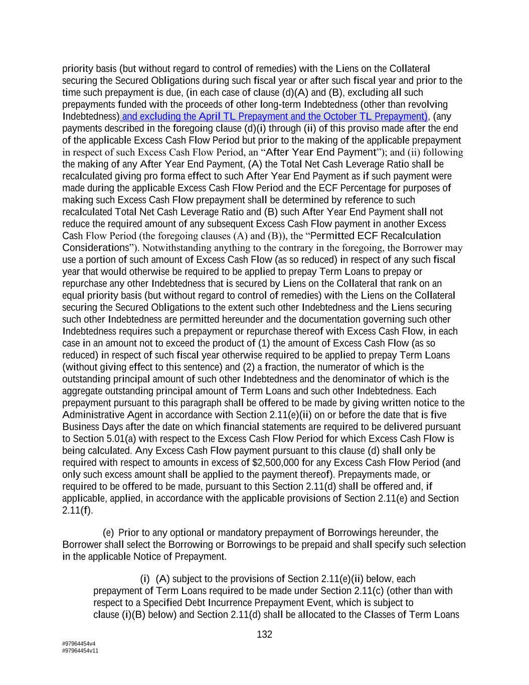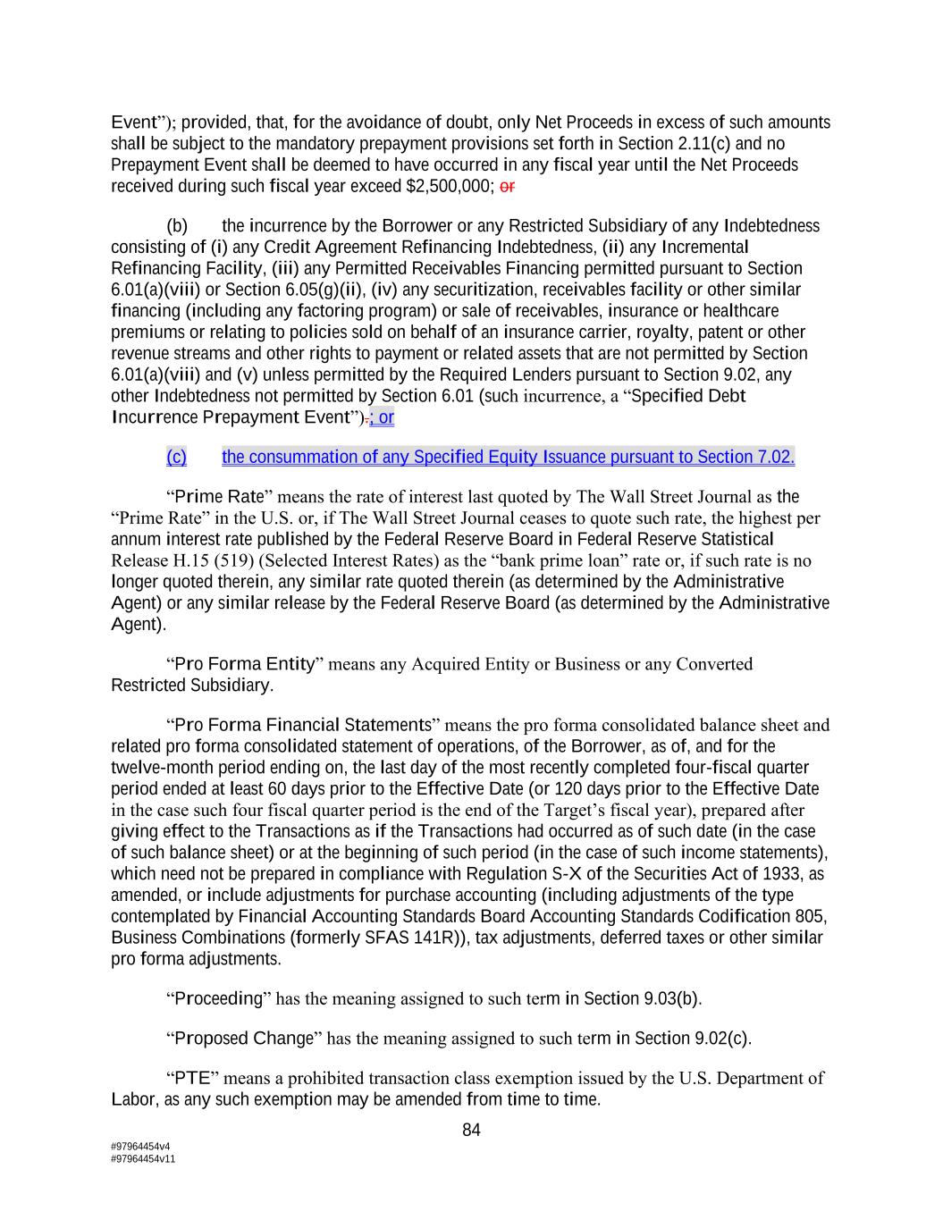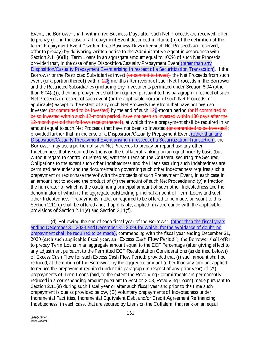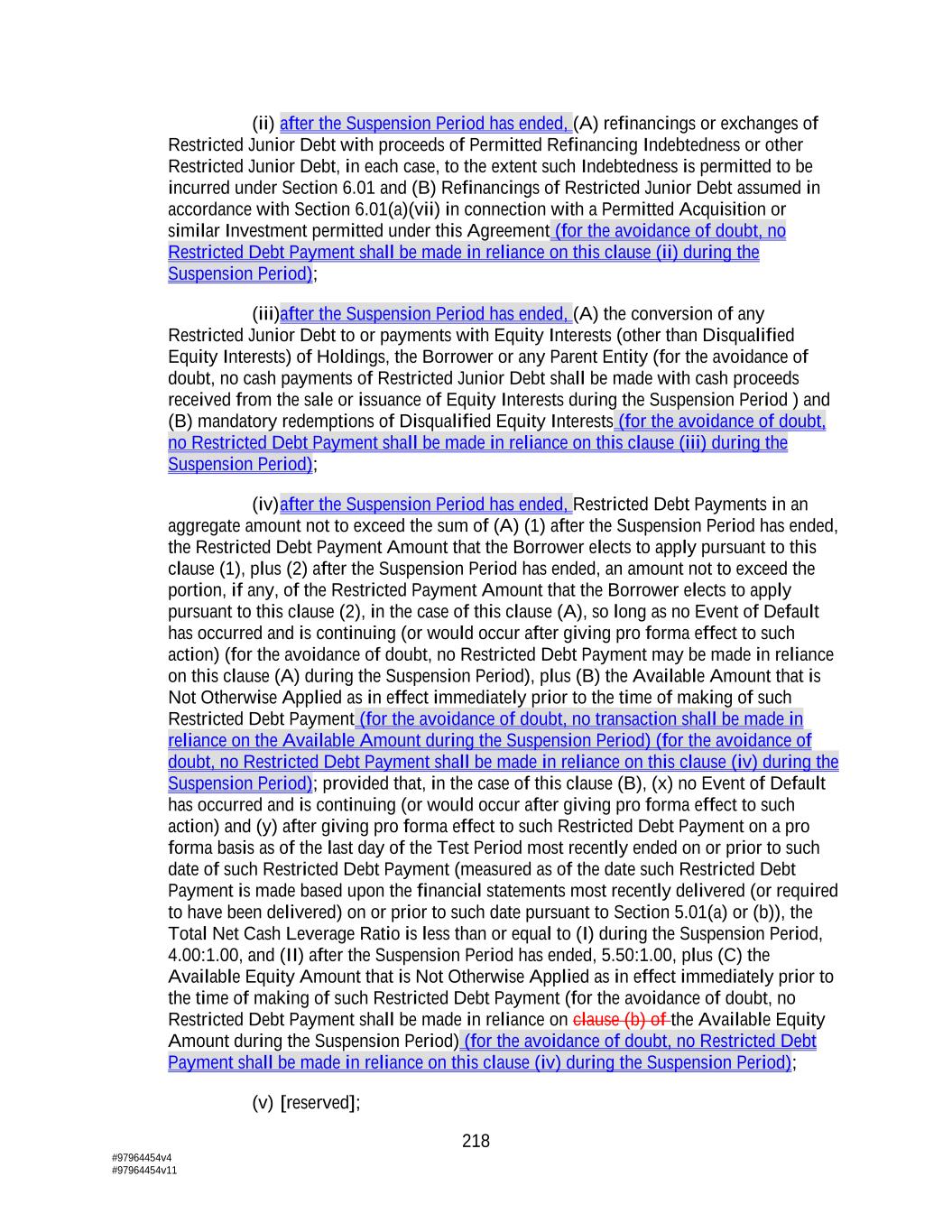 218 #97964454v4 #97964454v11 (ii) after the Suspension Period has ended, (A) refinancings or exchanges of Restricted Junior Debt with proceeds of Permitted Refinancing Indebtedness or other Restricted Junior Debt, in each case, to the extent such Indebtedness is permitted to be incurred under Section 6.01 and (B) Refinancings of Restricted Junior Debt assumed in accordance with Section 6.01(a)(vii) in connection with a Permitted Acquisition or similar Investment permitted under this Agreement (for the avoidance of doubt, no Restricted Debt Payment shall be made in reliance on this clause (ii) during the Suspension Period); (iii)after the Suspension Period has ended, (A) the conversion of any Restricted Junior Debt to or payments with Equity Interests (other than Disqualified Equity Interests) of Holdings, the Borrower or any Parent Entity (for the avoidance of doubt, no cash payments of Restricted Junior Debt shall be made with cash proceeds received from the sale or issuance of Equity Interests during the Suspension Period ) and (B) mandatory redemptions of Disqualified Equity Interests (for the avoidance of doubt, no Restricted Debt Payment shall be made in reliance on this clause (iii) during the Suspension Period); (iv) after the Suspension Period has ended, Restricted Debt Payments in an aggregate amount not to exceed the sum of (A) (1) after the Suspension Period has ended, the Restricted Debt Payment Amount that the Borrower elects to apply pursuant to this clause (1), plus (2) after the Suspension Period has ended, an amount not to exceed the portion, if any, of the Restricted Payment Amount that the Borrower elects to apply pursuant to this clause (2), in the case of this clause (A), so long as no Event of Default has occurred and is continuing (or would occur after giving pro forma effect to such action) (for the avoidance of doubt, no Restricted Debt Payment may be made in reliance on this clause (A) during the Suspension Period), plus (B) the Available Amount that is Not Otherwise Applied as in effect immediately prior to the time of making of such Restricted Debt Payment (for the avoidance of doubt, no transaction shall be made in reliance on the Available Amount during the Suspension Period) (for the avoidance of doubt, no Restricted Debt Payment shall be made in reliance on this clause (iv) during the Suspension Period); provided that, in the case of this clause (B), (x) no Event of Default has occurred and is continuing (or would occur after giving pro forma effect to such action) and (y) after giving pro forma effect to such Restricted Debt Payment on a pro forma basis as of the last day of the Test Period most recently ended on or prior to such date of such Restricted Debt Payment (measured as of the date such Restricted Debt Payment is made based upon the financial statements most recently delivered (or required to have been delivered) on or prior to such date pursuant to Section 5.01(a) or (b)), the Total Net Cash Leverage Ratio is less than or equal to (I) during the Suspension Period, 4.00:1.00, and (II) after the Suspension Period has ended, 5.50:1.00, plus (C) the Available Equity Amount that is Not Otherwise Applied as in effect immediately prior to the time of making of such Restricted Debt Payment (for the avoidance of doubt, no Restricted Debt Payment shall be made in reliance on clause (b) of the Available Equity Amount during the Suspension Period) (for the avoidance of doubt, no Restricted Debt Payment shall be made in reliance on this clause (iv) during the Suspension Period); (v) [reserved];