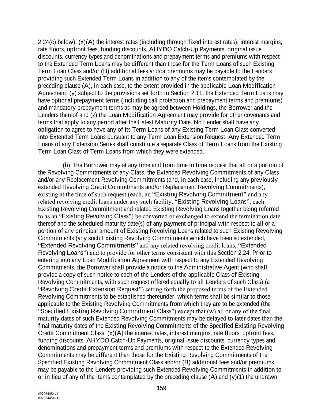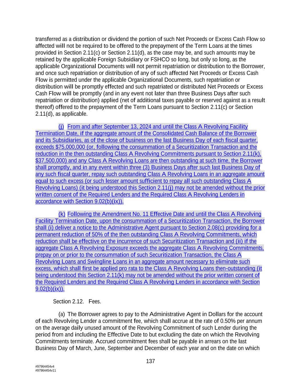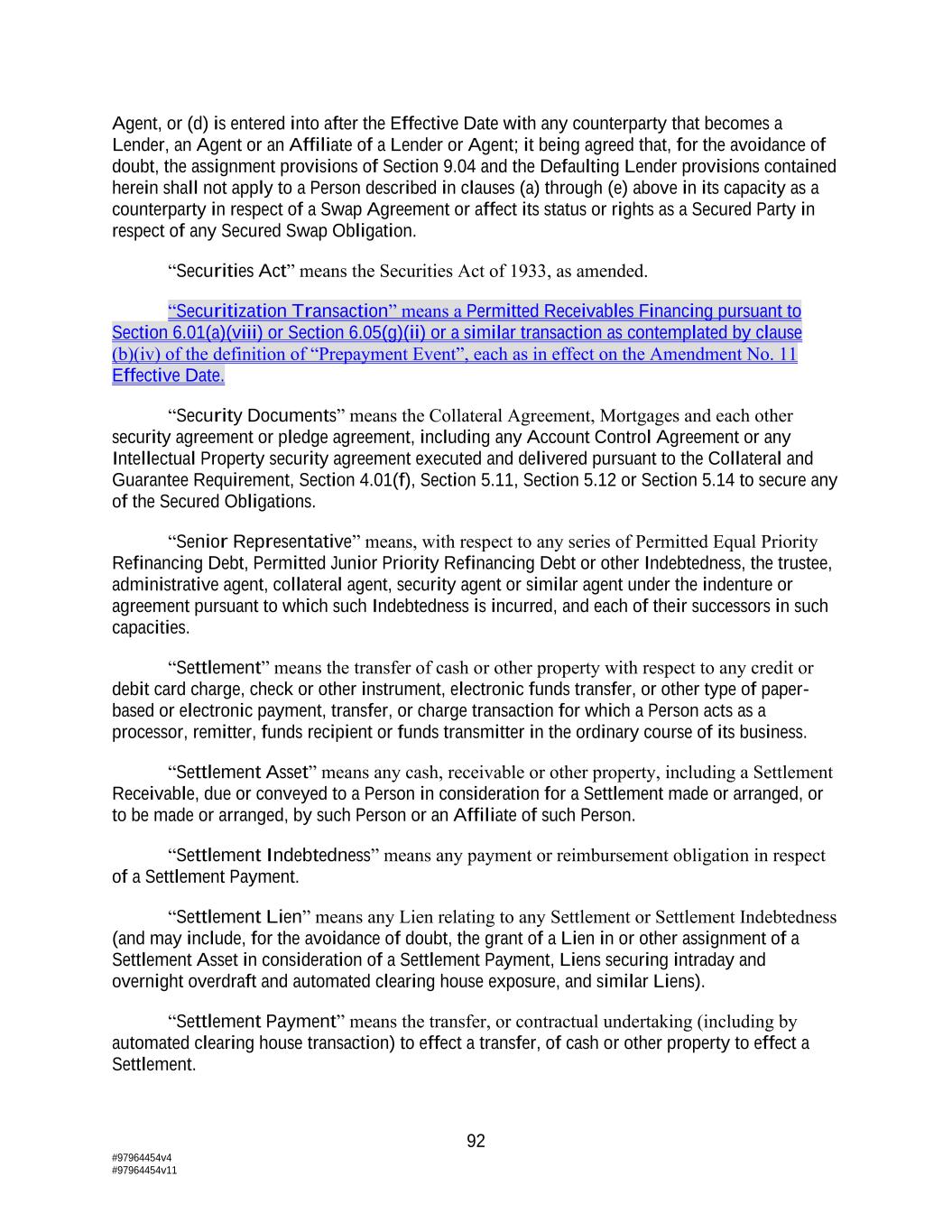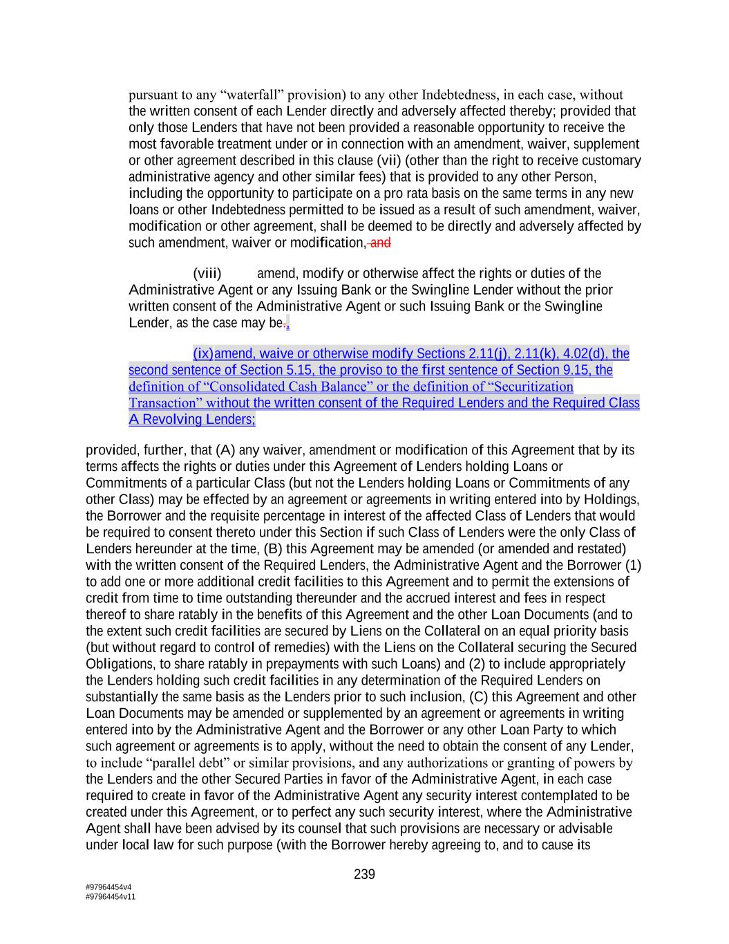 239 #97964454v4 #97964454v11 pursuant to any “waterfall” provision) to any other Indebtedness, in each case, without the written consent of each Lender directly and adversely affected thereby; provided that only those Lenders that have not been provided a reasonable opportunity to receive the most favorable treatment under or in connection with an amendment, waiver, supplement or other agreement described in this clause (vii) (other than the right to receive customary administrative agency and other similar fees) that is provided to any other Person, including the opportunity to participate on a pro rata basis on the same terms in any new loans or other Indebtedness permitted to be issued as a result of such amendment, waiver, modification or other agreement, shall be deemed to be directly and adversely affected by such amendment, waiver or modification, and (viii) amend, modify or otherwise affect the rights or duties of the Administrative Agent or any Issuing Bank or the Swingline Lender without the prior written consent of the Administrative Agent or such Issuing Bank or the Swingline Lender, as the case may be., (ix) amend, waive or otherwise modify Sections 2.11(j), 2.11(k), 4.02(d), the second sentence of Section 5.15, the proviso to the first sentence of Section 9.15, the definition of “Consolidated Cash Balance” or the definition of “Securitization Transaction” without the written consent of the Required Lenders and the Required Class A Revolving Lenders; provided, further, that (A) any waiver, amendment or modification of this Agreement that by its terms affects the rights or duties under this Agreement of Lenders holding Loans or Commitments of a particular Class (but not the Lenders holding Loans or Commitments of any other Class) may be effected by an agreement or agreements in writing entered into by Holdings, the Borrower and the requisite percentage in interest of the affected Class of Lenders that would be required to consent thereto under this Section if such Class of Lenders were the only Class of Lenders hereunder at the time, (B) this Agreement may be amended (or amended and restated) with the written consent of the Required Lenders, the Administrative Agent and the Borrower (1) to add one or more additional credit facilities to this Agreement and to permit the extensions of credit from time to time outstanding thereunder and the accrued interest and fees in respect thereof to share ratably in the benefits of this Agreement and the other Loan Documents (and to the extent such credit facilities are secured by Liens on the Collateral on an equal priority basis (but without regard to control of remedies) with the Liens on the Collateral securing the Secured Obligations, to share ratably in prepayments with such Loans) and (2) to include appropriately the Lenders holding such credit facilities in any determination of the Required Lenders on substantially the same basis as the Lenders prior to such inclusion, (C) this Agreement and other Loan Documents may be amended or supplemented by an agreement or agreements in writing entered into by the Administrative Agent and the Borrower or any other Loan Party to which such agreement or agreements is to apply, without the need to obtain the consent of any Lender, to include “parallel debt” or similar provisions, and any authorizations or granting of powers by the Lenders and the other Secured Parties in favor of the Administrative Agent, in each case required to create in favor of the Administrative Agent any security interest contemplated to be created under this Agreement, or to perfect any such security interest, where the Administrative Agent shall have been advised by its counsel that such provisions are necessary or advisable under local law for such purpose (with the Borrower hereby agreeing to, and to cause its