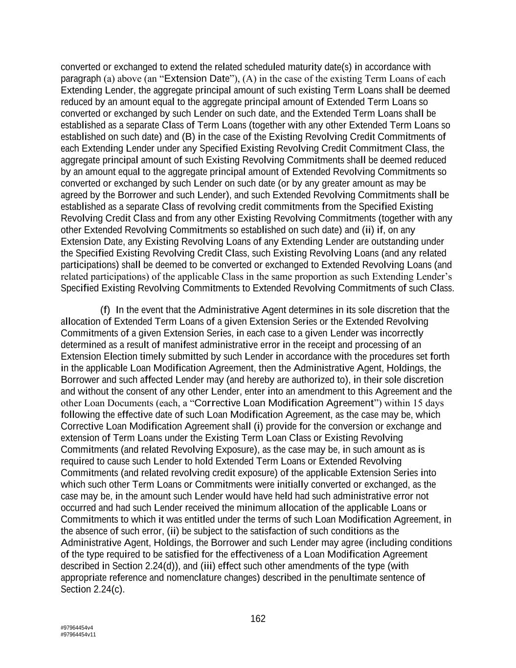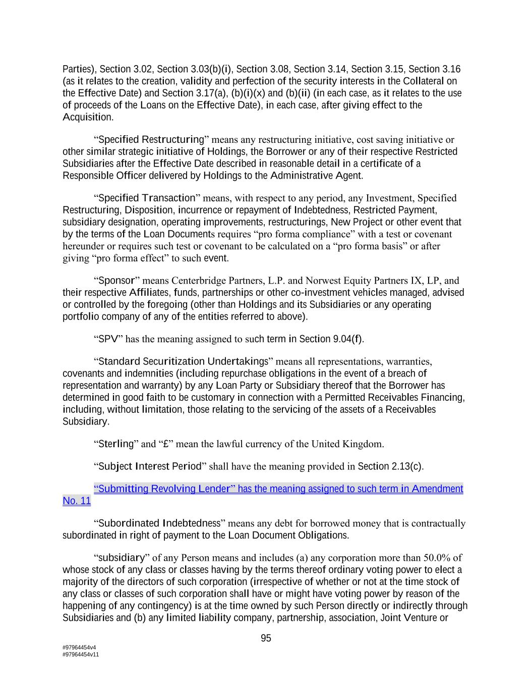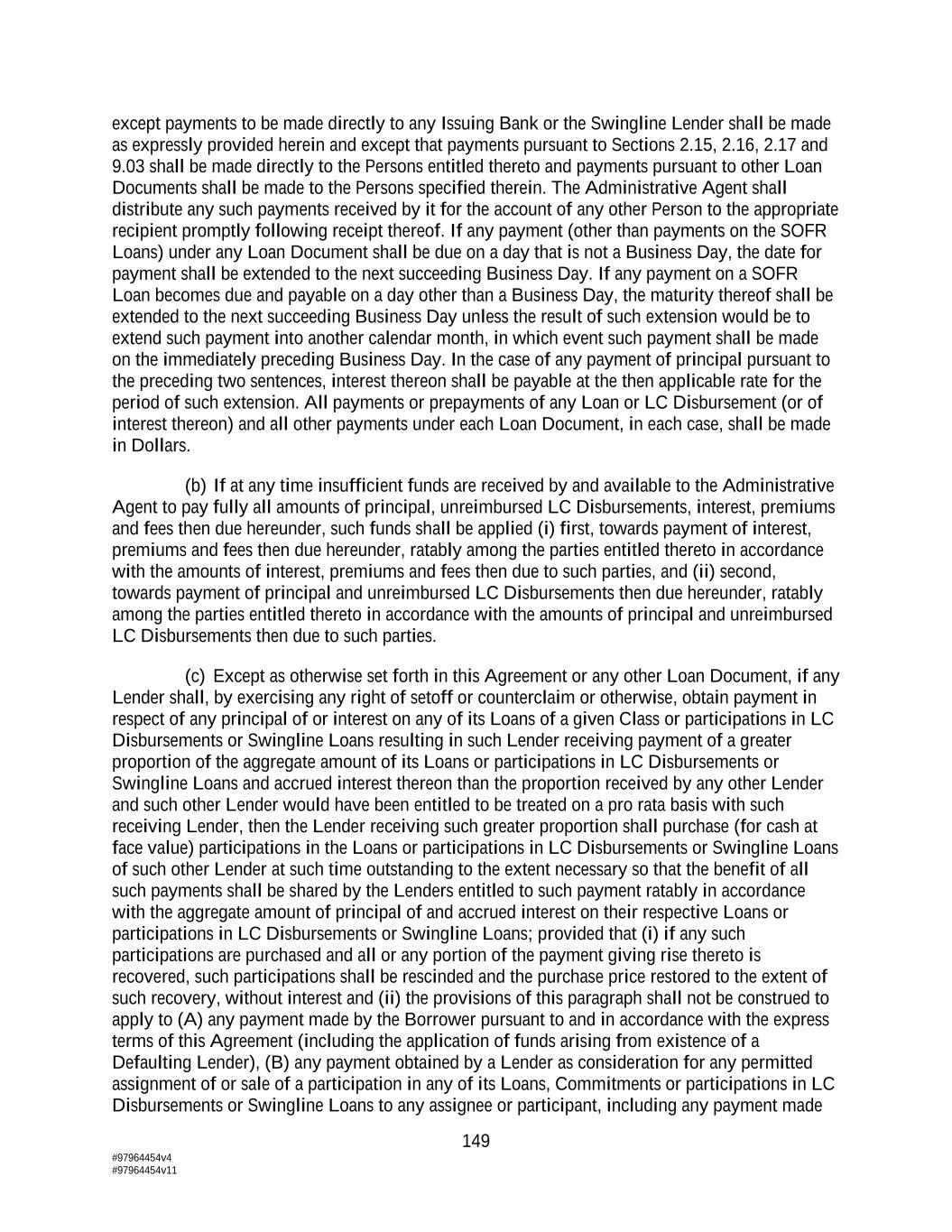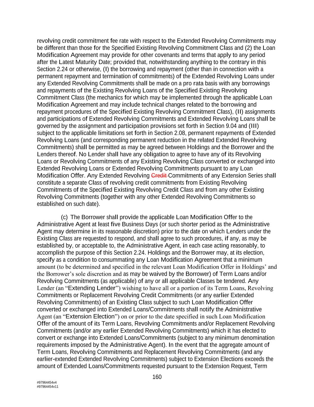 239 #97964454v4 #97964454v11 pursuant to any “waterfall” provision) to any other Indebtedness, in each case, without the written consent of each Lender directly and adversely affected thereby; provided that only those Lenders that have not been provided a reasonable opportunity to receive the most favorable treatment under or in connection with an amendment, waiver, supplement or other agreement described in this clause (vii) (other than the right to receive customary administrative agency and other similar fees) that is provided to any other Person, including the opportunity to participate on a pro rata basis on the same terms in any new loans or other Indebtedness permitted to be issued as a result of such amendment, waiver, modification or other agreement, shall be deemed to be directly and adversely affected by such amendment, waiver or modification, and (viii) amend, modify or otherwise affect the rights or duties of the Administrative Agent or any Issuing Bank or the Swingline Lender without the prior written consent of the Administrative Agent or such Issuing Bank or the Swingline Lender, as the case may be., (ix) amend, waive or otherwise modify Sections 2.11(j), 2.11(k), 4.02(d), the second sentence of Section 5.15, the proviso to the first sentence of Section 9.15, the definition of “Consolidated Cash Balance” or the definition of “Securitization Transaction” without the written consent of the Required Lenders and the Required Class A Revolving Lenders; provided, further, that (A) any waiver, amendment or modification of this Agreement that by its terms affects the rights or duties under this Agreement of Lenders holding Loans or Commitments of a particular Class (but not the Lenders holding Loans or Commitments of any other Class) may be effected by an agreement or agreements in writing entered into by Holdings, the Borrower and the requisite percentage in interest of the affected Class of Lenders that would be required to consent thereto under this Section if such Class of Lenders were the only Class of Lenders hereunder at the time, (B) this Agreement may be amended (or amended and restated) with the written consent of the Required Lenders, the Administrative Agent and the Borrower (1) to add one or more additional credit facilities to this Agreement and to permit the extensions of credit from time to time outstanding thereunder and the accrued interest and fees in respect thereof to share ratably in the benefits of this Agreement and the other Loan Documents (and to the extent such credit facilities are secured by Liens on the Collateral on an equal priority basis (but without regard to control of remedies) with the Liens on the Collateral securing the Secured Obligations, to share ratably in prepayments with such Loans) and (2) to include appropriately the Lenders holding such credit facilities in any determination of the Required Lenders on substantially the same basis as the Lenders prior to such inclusion, (C) this Agreement and other Loan Documents may be amended or supplemented by an agreement or agreements in writing entered into by the Administrative Agent and the Borrower or any other Loan Party to which such agreement or agreements is to apply, without the need to obtain the consent of any Lender, to include “parallel debt” or similar provisions, and any authorizations or granting of powers by the Lenders and the other Secured Parties in favor of the Administrative Agent, in each case required to create in favor of the Administrative Agent any security interest contemplated to be created under this Agreement, or to perfect any such security interest, where the Administrative Agent shall have been advised by its counsel that such provisions are necessary or advisable under local law for such purpose (with the Borrower hereby agreeing to, and to cause its