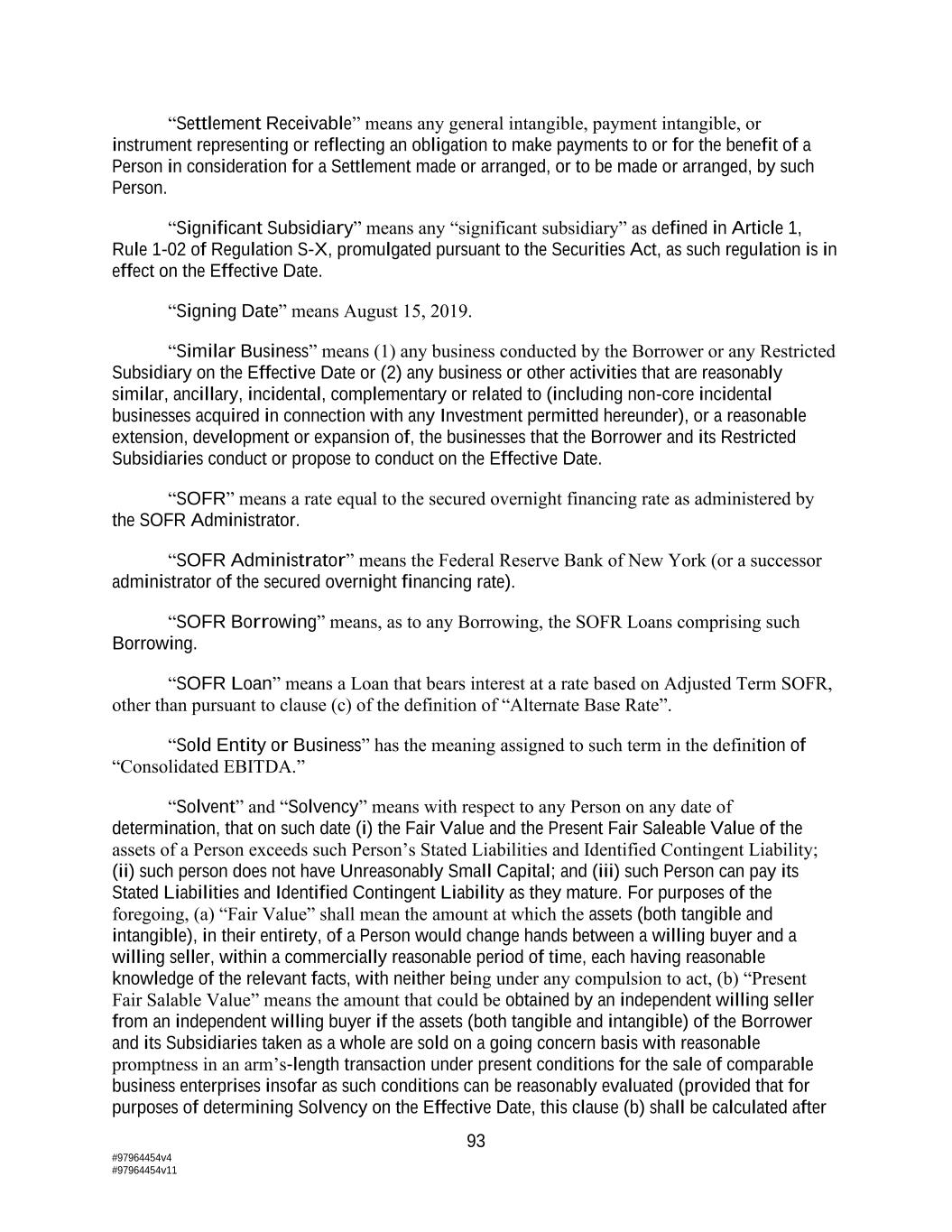 32 #97964454v4 #97964454v11 from such actions); provided that (A) such cost savings are reasonably identifiable and factually supportable and (B) no cost savings, operating expense reductions or synergies shall be added pursuant to this clause (b) to the extent duplicative of any expenses or charges relating to such cost savings, operating expense reductions or synergies that are included in clause (a) above or otherwise added back in the computation of Consolidated EBITDA (whether through a pro forma adjustment or otherwise) for such period (it being understood and agreed that “run rate” shall mean the full recurring benefit that is associated with any action taken) and (C) the aggregate amount added to Consolidated EBITDA pursuant to this clause (b)(1), when combined, without duplication, with any amount added pursuant to clauses (a)(xv), (a)(xvi) and (a)(xx) of this definition, excluded pursuant to clauses (a) and (b) of the definition of “Consolidated Net Income” and included pursuant to Section 1.11(c) for any Test Period shall not exceed (x) for purpose of any calculation of Consolidated EBITDA under this Agreement, an amount equal to 20.0% of Consolidated EBITDA for such Test Period (calculated prior to giving effect to such add-backs) and (y) for purposes of any calculation of Consolidated Cash EBITDA under this Agreement, an amount equal to 25.0% of Consolidated Cash EBITDA for such Test Period (calculated prior to giving effect to such add-backs) and (2) other adjustments and add- backs calculated in accordance with Regulation S-X, (as in effect immediately prior to January 1, 2021), less (c) without duplication and (other than with respect to clauses (ii) and (iii) below) to the extent included in arriving at such Consolidated Net Income, the sum of the following amounts for such period: (i) non-cash gains (excluding any non-cash gain to the extent it represents the reversal of an accrual or reserve for a potential cash item that reduced Consolidated Net Income or Consolidated EBITDA in any prior period), (ii) the amount of any non-controlling interest consisting of loss attributable to non-controlling interests of third parties in any Restricted Subsidiary that is not a wholly owned subsidiary added to and not deducted in such period from Consolidated Net Income, (iii) cash expenditures (or any netting arrangements resulting in increased cash expenditures) not representing Consolidated EBITDA in any period to the extent non- cash losses relating to such expenditures were added to the calculation of Consolidated EBITDA for any previous periods and not subtracted back, and (iv) interest expense and principal payments made by any Receivables Subsidiary in respect of any Permitted Receivables Financing, but excluding (A) payments of principal to the extent effecting a Refinancing thereof or (B) any other prepayment of any such Permitted Receivables Financing, but only to the extent that any remaining Permitted Receivables Financing Assets formerly subject to any such Permitted Refinancing Facility are transferred by the Receivables Subsidiary to a Borrower or a Restricted Subsidiary (other than a Receivables Subsidiary) in connection with such prepayment,