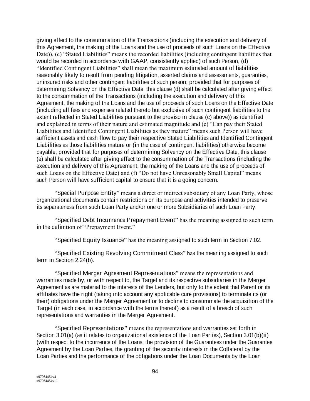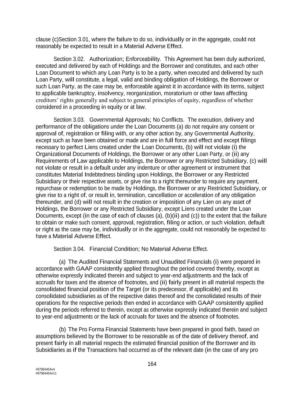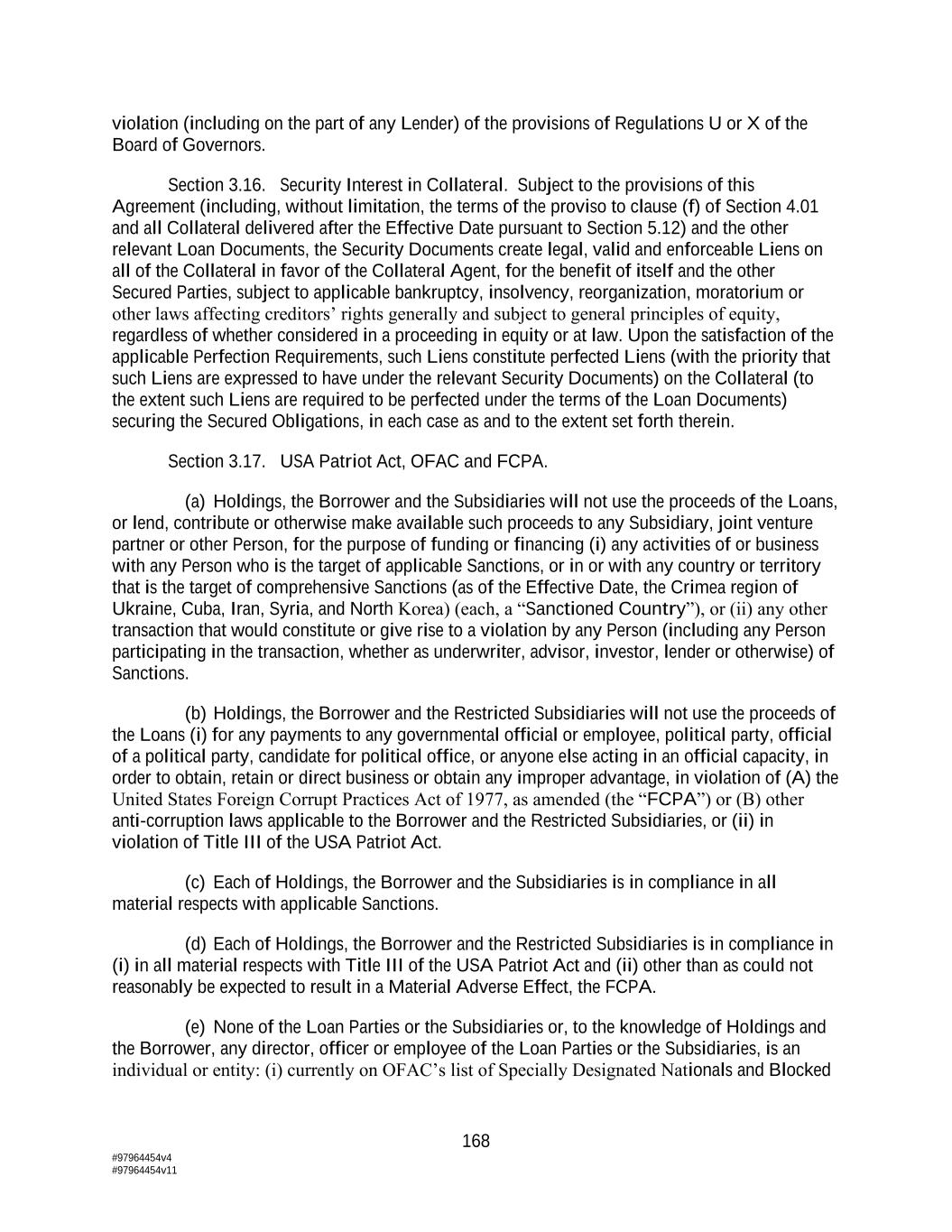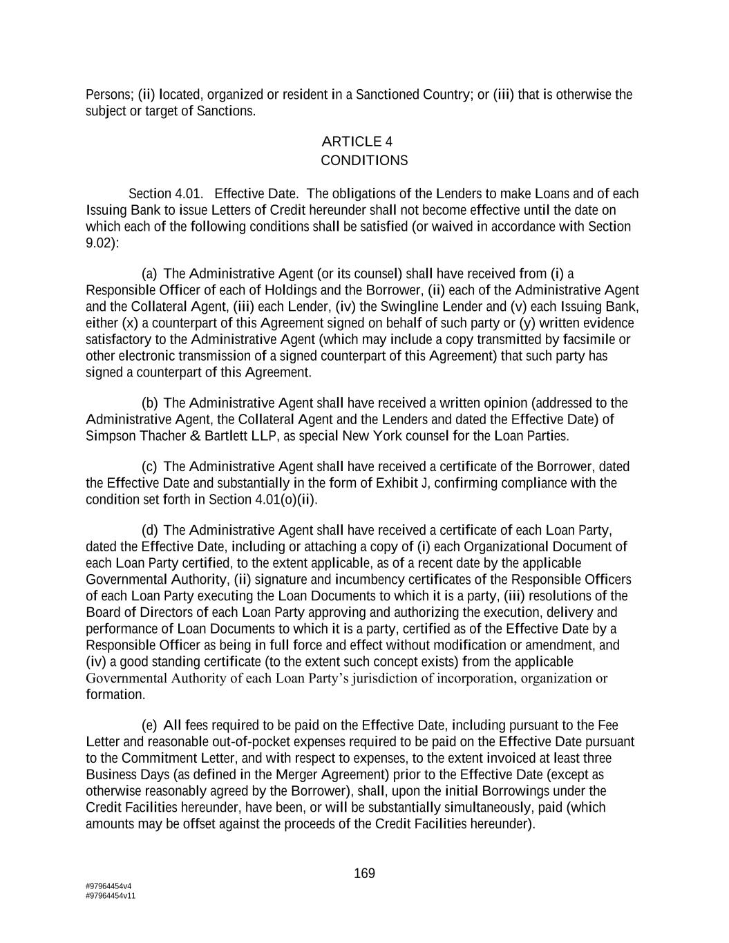 ii #97964454v4 #97964454v11 Section 3.04. Financial Condition; No Material Adverse Effect. 159163 Section 3.05. Properties. 159163 Section 3.06. Litigation, Environmental and Labor Matters. 159164 Section 3.07. Compliance with Laws. 160164 Section 3.08. Investment Company Status. 160164 Section 3.09. Taxes. 160164 Section 3.10. ERISA; Foreign Pension Plans. 160165 Section 3.11. Disclosure. 161165 Section 3.12. Subsidiaries. 162166 Section 3.13. Intellectual Property; Licenses, Etc. 162166 Section 3.14. Solvency. 162166 Section 3.15. Federal Reserve Regulations. 162166 Section 3.16. Security Interest in Collateral. 162166 Section 3.17. USA Patriot Act, OFAC and FCPA. 162167 ARTICLE 4 CONDITIONS 167 Section 4.01. Effective Date. 163167 Section 4.02. Each Credit Event. 166170 ARTICLE 5 AFFIRMATIVE COVENANTS 171 Section 5.01. Financial Statements and Other Information. 167171 Section 5.02. Notices of Material Events. 171175 Section 5.03. Information Regarding Collateral. 171175 Section 5.04. Existence; Conduct of Business. 171176 Section 5.05. Payment of Taxes, Etc. 171176 Section 5.06. Maintenance of Properties. 172176 Section 5.07. Insurance. 172176 Section 5.08. Books and Records; Inspection and Audit Rights; Lender Call. 172177 Section 5.09. Compliance with Laws. 173178 Section 5.10. Use of Proceeds and Letters of Credit. 173178 Section 5.11. Additional Subsidiaries. 174179 Section 5.12. Further Assurances. 175179 Section 5.13. [Reserved]. 176180 Section 5.14. Certain Post-Closing Obligations. 176180 Section 5.15. Designation of Subsidiaries. 176180 ARTICLE 6 NEGATIVE COVENANTS 181 Section 6.01. Indebtedness; Certain Equity Securities. 177181 Section 6.02. Liens. 184189 Section 6.03. Fundamental Changes. 190194 Section 6.04. Investments, Loans, Advances, Guarantees and Acquisitions. 192196 Section 6.05. Asset Sales. 197202 Section 6.06. Holdings Covenant. 201206 Section 6.07. Negative Pledge; Subsidiary Distributions. 203208 Section 6.08. Restricted Payments; Certain Payments of Indebtedness. 205210 Section 6.09. Transactions with Affiliates. 212217