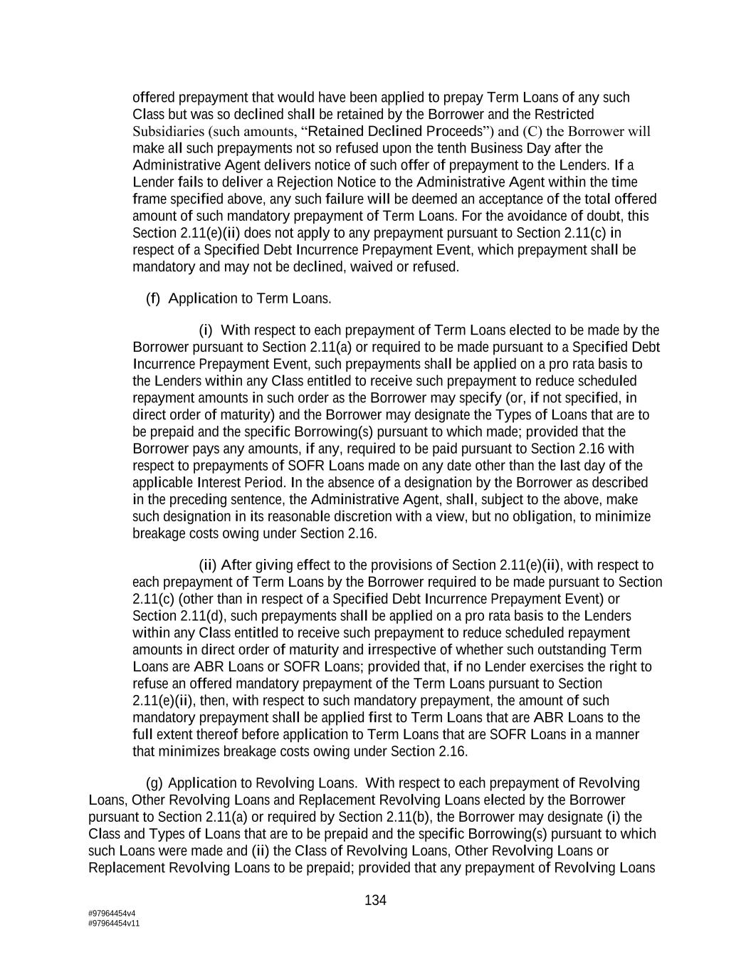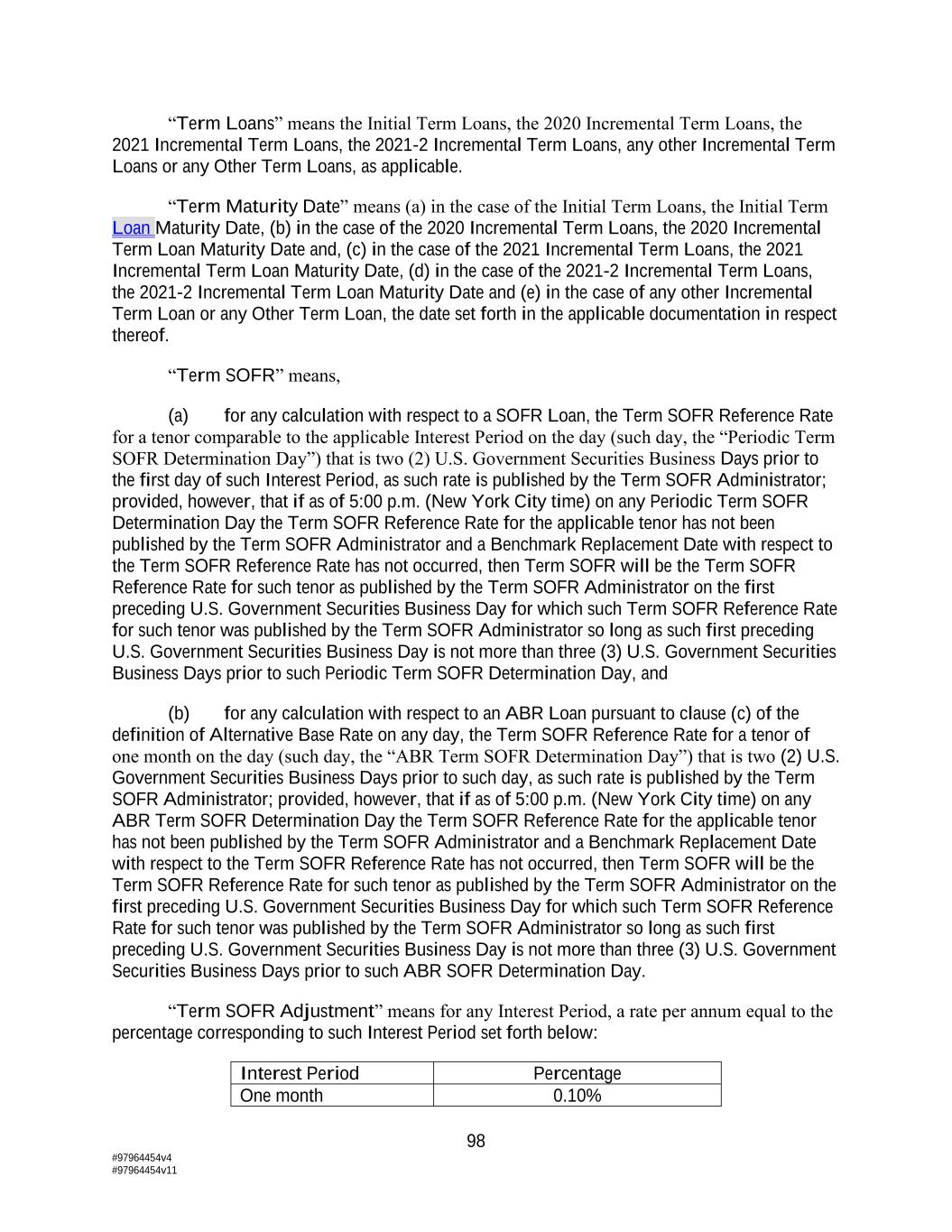 9 #97964454v4 #97964454v11 (c) with respect to any 2021 Incremental Term Loan (i) prior to the 2021-2 Incremental Term Loan Closing Date, (x) that is an ABR Loan, 3.00% per annum or (y) that is a SOFR Loan, 4.00% per annum, (ii) from and after the 2021-2 Incremental Term Loan Closing Date and prior to the Amendment No. 7 Effective Date, (x) that is an ABR Loan, 4.00% per annum or (y) that is a SOFR Loan, 5.00% per annum, (iii) from and after the Amendment No. 7 Effective Date and prior to the Amendment No. 8 Effective Date, (x) that is an ABR Loan, 5.50% per annum or (y) that is a SOFR Loan, 6.50% per annum, and (iv) from and after the Amendment No. 8 Effective Date, (x) that is an ABR Loan, 6.50% per annum or (y) that is a SOFR Loan, 7.50% per annum, and (v) from and after the Amendment No. 11 Effective Date, as follows: Period ABR Loans SOFR Loans From and after the Amendment No. 11 Effective Date through and including August 31, 2024 6.50% 7.50% Thereafter 7.00% 8.00% (d) with respect to any 2021-2 Incremental Term Loan (i) prior to the Amendment No. 7 Effective Date, (x) that is an ABR Loan, 4.00% per annum or (ii) that is a SOFR Loan, 5.00% per annum, (ii) from and after the Amendment No. 7 Effective Date and prior to the Amendment No. 8 Effective Date, (x) that is an ABR Loan, 5.50% per annum or (y) that is a SOFR Loan, 6.50% per annum, and (iii) from and after the Amendment No. 8 Effective Date, (x) that is an ABR Loan, 6.50% per annum or (y) that is a SOFR Loan, 7.50% per annum, and (iv) from and after the Amendment No. 11 Effective Date, as follows: Period ABR Loans SOFR Loans From and after the Amendment No. 11 Effective Date through and including August 31, 2024 6.50% 7.50% Thereafter 7.00% 8.00% (e) with respect to any Revolving Loan prior to the Amendment No. 5 Effective Date (i) that is an ABR Loan, 5.50% per annum or (ii) that is a SOFR Loan, 6.50% per annum, (f) with respect to any Class A Revolving Loan on and after the Amendment No. 5 Effective Date and prior to the Amendment No. 11 Effective Date (i) that is an ABR Loan, 5.50% per annum or (ii) that is a SOFR Loan, 6.50% per annum, and (g) with respect to any Class A Revolving Loan on and after the Amendment No. 11 Effective Date (i) that is an ABR Loan, 5.50% per annum or (ii) that is a SOFR Loan, 6.50% per annum, and
