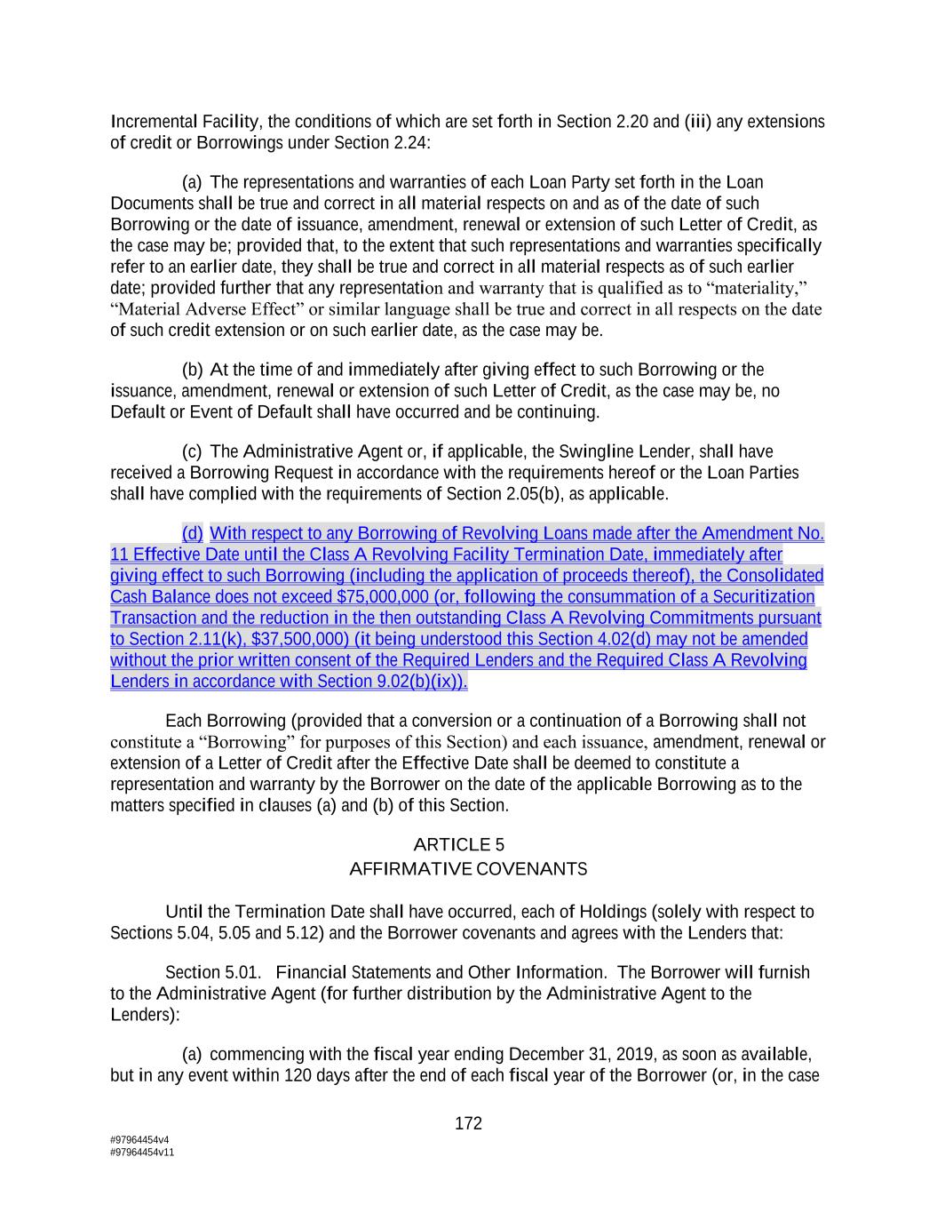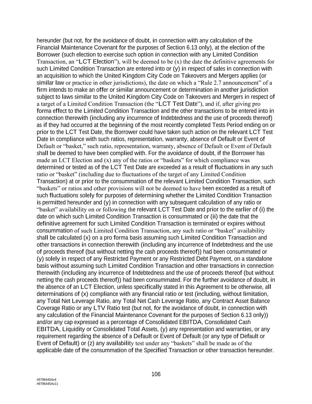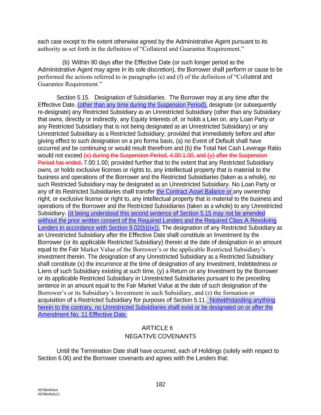 182 #97964454v4 #97964454v11 each case except to the extent otherwise agreed by the Administrative Agent pursuant to its authority as set forth in the definition of “Collateral and Guarantee Requirement.” (b) Within 90 days after the Effective Date (or such longer period as the Administrative Agent may agree in its sole discretion), the Borrower shall perform or cause to be performed the actions referred to in paragraphs (e) and (f) of the definition of “Collateral and Guarantee Requirement.” Section 5.15. Designation of Subsidiaries. The Borrower may at any time after the Effective Date, (other than any time during the Suspension Period), designate (or subsequently re-designate) any Restricted Subsidiary as an Unrestricted Subsidiary (other than any Subsidiary that owns, directly or indirectly, any Equity Interests of, or holds a Lien on, any Loan Party or any Restricted Subsidiary that is not being designated as an Unrestricted Subsidiary) or any Unrestricted Subsidiary as a Restricted Subsidiary; provided that immediately before and after giving effect to such designation on a pro forma basis, (a) no Event of Default shall have occurred and be continuing or would result therefrom and (b) the Total Net Cash Leverage Ratio would not exceed (x) during the Suspension Period, 4.00:1.00, and (y) after the Suspension Period has ended, 7.00:1.00; provided further that to the extent that any Restricted Subsidiary owns, or holds exclusive licenses or rights to, any intellectual property that is material to the business and operations of the Borrower and the Restricted Subsidiaries (taken as a whole), no such Restricted Subsidiary may be designated as an Unrestricted Subsidiary. No Loan Party or any of its Restricted Subsidiaries shall transfer the Contract Asset Balance or any ownership right, or exclusive license or right to, any intellectual property that is material to the business and operations of the Borrower and the Restricted Subsidiaries (taken as a whole) to any Unrestricted Subsidiary. (it being understood this second sentence of Section 5.15 may not be amended without the prior written consent of the Required Lenders and the Required Class A Revolving Lenders in accordance with Section 9.02(b)(ix)). The designation of any Restricted Subsidiary as an Unrestricted Subsidiary after the Effective Date shall constitute an Investment by the Borrower (or its applicable Restricted Subsidiary) therein at the date of designation in an amount equal to the Fair Market Value of the Borrower’s or the applicable Restricted Subsidiary’s investment therein. The designation of any Unrestricted Subsidiary as a Restricted Subsidiary shall constitute (x) the incurrence at the time of designation of any Investment, Indebtedness or Liens of such Subsidiary existing at such time, (y) a Return on any Investment by the Borrower or its applicable Restricted Subsidiary in Unrestricted Subsidiaries pursuant to the preceding sentence in an amount equal to the Fair Market Value at the date of such designation of the Borrower’s or its Subsidiary’s Investment in such Subsidiary, and (z) the formation or acquisition of a Restricted Subsidiary for purposes of Section 5.11. Notwithstanding anything herein to the contrary, no Unrestricted Subsidiaries shall exist or be designated on or after the Amendment No. 11 Effective Date. ARTICLE 6 NEGATIVE COVENANTS Until the Termination Date shall have occurred, each of Holdings (solely with respect to Section 6.06) and the Borrower covenants and agrees with the Lenders that:
