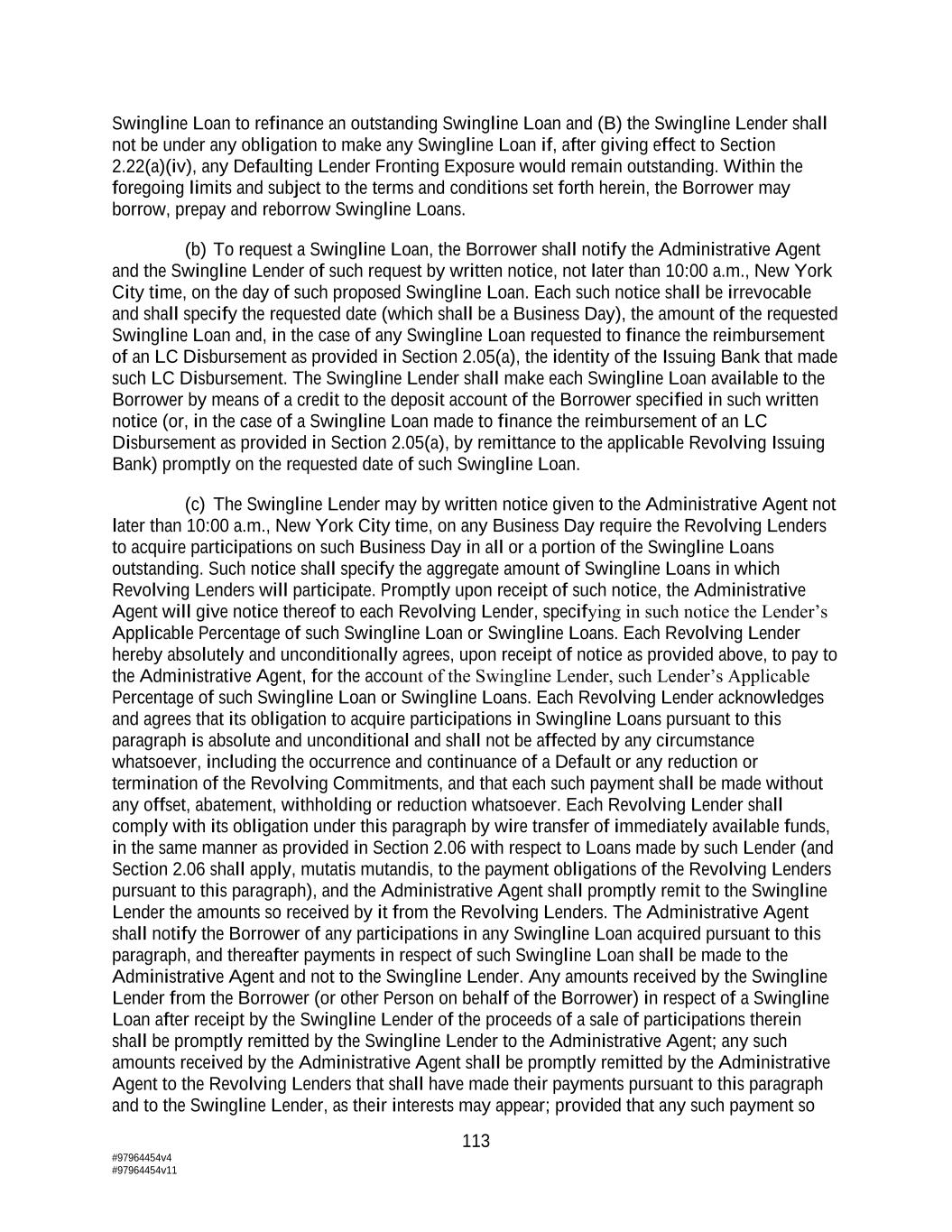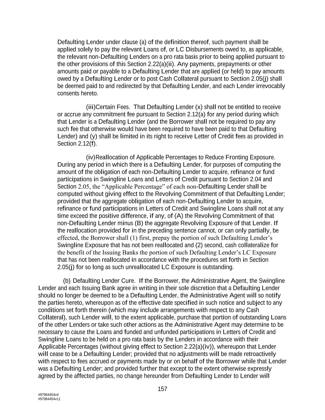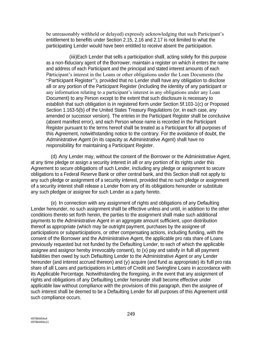 249 #97964454v4 #97964454v11 be unreasonably withheld or delayed) expressly acknowledging that such Participant’s entitlement to benefits under Section 2.15, 2.16 and 2.17 is not limited to what the participating Lender would have been entitled to receive absent the participation. (iii)Each Lender that sells a participation shall, acting solely for this purpose as a non-fiduciary agent of the Borrower, maintain a register on which it enters the name and address of each Participant and the principal and stated interest amounts of each Participant’s interest in the Loans or other obligations under the Loan Documents (the “Participant Register”); provided that no Lender shall have any obligation to disclose all or any portion of the Participant Register (including the identity of any participant or any information relating to a participant’s interest in any obligations under any Loan Document) to any Person except to the extent that such disclosure is necessary to establish that such obligation is in registered form under Section 5f.103-1(c) or Proposed Section 1.163-5(b) of the United States Treasury Regulations (or, in each case, any amended or successor version). The entries in the Participant Register shall be conclusive (absent manifest error), and each Person whose name is recorded in the Participant Register pursuant to the terms hereof shall be treated as a Participant for all purposes of this Agreement, notwithstanding notice to the contrary. For the avoidance of doubt, the Administrative Agent (in its capacity as Administrative Agent) shall have no responsibility for maintaining a Participant Register. (d) Any Lender may, without the consent of the Borrower or the Administrative Agent, at any time pledge or assign a security interest in all or any portion of its rights under this Agreement to secure obligations of such Lender, including any pledge or assignment to secure obligations to a Federal Reserve Bank or other central bank, and this Section shall not apply to any such pledge or assignment of a security interest, provided that no such pledge or assignment of a security interest shall release a Lender from any of its obligations hereunder or substitute any such pledgee or assignee for such Lender as a party hereto. (e) In connection with any assignment of rights and obligations of any Defaulting Lender hereunder, no such assignment shall be effective unless and until, in addition to the other conditions thereto set forth herein, the parties to the assignment shall make such additional payments to the Administrative Agent in an aggregate amount sufficient, upon distribution thereof as appropriate (which may be outright payment, purchases by the assignee of participations or subparticipations, or other compensating actions, including funding, with the consent of the Borrower and the Administrative Agent, the applicable pro rata share of Loans previously requested but not funded by the Defaulting Lender, to each of which the applicable assignee and assignor hereby irrevocably consent), to (x) pay and satisfy in full all payment liabilities then owed by such Defaulting Lender to the Administrative Agent or any Lender hereunder (and interest accrued thereon) and (y) acquire (and fund as appropriate) its full pro rata share of all Loans and participations in Letters of Credit and Swingline Loans in accordance with its Applicable Percentage. Notwithstanding the foregoing, in the event that any assignment of rights and obligations of any Defaulting Lender hereunder shall become effective under applicable law without compliance with the provisions of this paragraph, then the assignee of such interest shall be deemed to be a Defaulting Lender for all purposes of this Agreement until such compliance occurs.