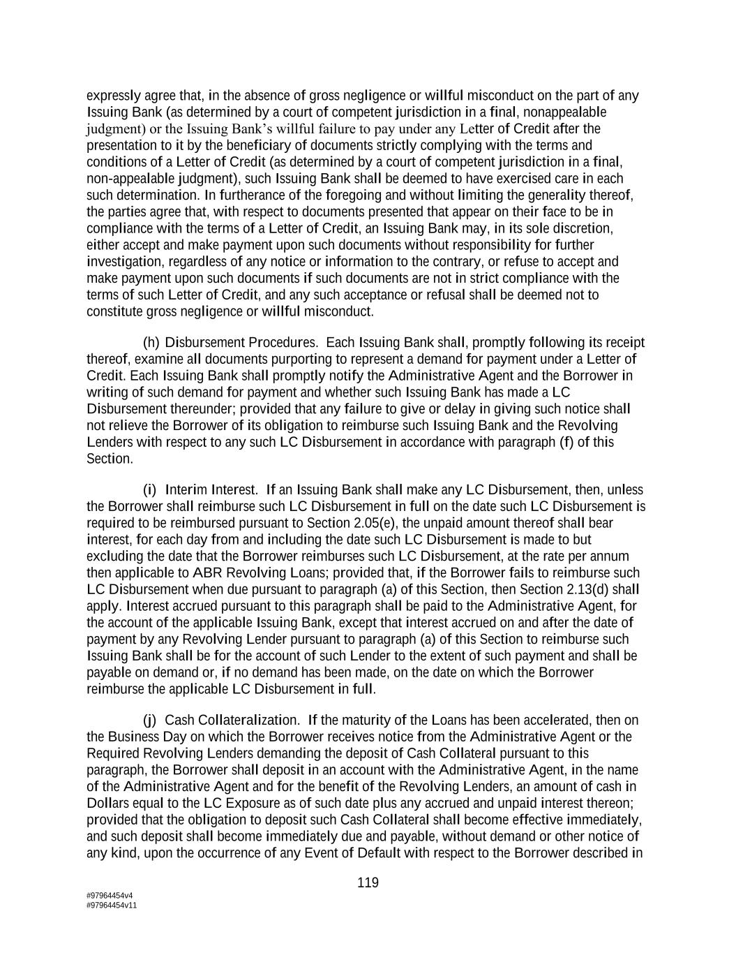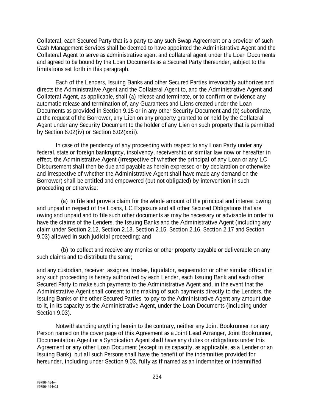 234 #97964454v4 #97964454v11 Collateral, each Secured Party that is a party to any such Swap Agreement or a provider of such Cash Management Services shall be deemed to have appointed the Administrative Agent and the Collateral Agent to serve as administrative agent and collateral agent under the Loan Documents and agreed to be bound by the Loan Documents as a Secured Party thereunder, subject to the limitations set forth in this paragraph. Each of the Lenders, Issuing Banks and other Secured Parties irrevocably authorizes and directs the Administrative Agent and the Collateral Agent to, and the Administrative Agent and Collateral Agent, as applicable, shall (a) release and terminate, or to confirm or evidence any automatic release and termination of, any Guarantees and Liens created under the Loan Documents as provided in Section 9.15 or in any other Security Document and (b) subordinate, at the request of the Borrower, any Lien on any property granted to or held by the Collateral Agent under any Security Document to the holder of any Lien on such property that is permitted by Section 6.02(iv) or Section 6.02(xxii). In case of the pendency of any proceeding with respect to any Loan Party under any federal, state or foreign bankruptcy, insolvency, receivership or similar law now or hereafter in effect, the Administrative Agent (irrespective of whether the principal of any Loan or any LC Disbursement shall then be due and payable as herein expressed or by declaration or otherwise and irrespective of whether the Administrative Agent shall have made any demand on the Borrower) shall be entitled and empowered (but not obligated) by intervention in such proceeding or otherwise: (a) to file and prove a claim for the whole amount of the principal and interest owing and unpaid in respect of the Loans, LC Exposure and all other Secured Obligations that are owing and unpaid and to file such other documents as may be necessary or advisable in order to have the claims of the Lenders, the Issuing Banks and the Administrative Agent (including any claim under Section 2.12, Section 2.13, Section 2.15, Section 2.16, Section 2.17 and Section 9.03) allowed in such judicial proceeding; and (b) to collect and receive any monies or other property payable or deliverable on any such claims and to distribute the same; and any custodian, receiver, assignee, trustee, liquidator, sequestrator or other similar official in any such proceeding is hereby authorized by each Lender, each Issuing Bank and each other Secured Party to make such payments to the Administrative Agent and, in the event that the Administrative Agent shall consent to the making of such payments directly to the Lenders, the Issuing Banks or the other Secured Parties, to pay to the Administrative Agent any amount due to it, in its capacity as the Administrative Agent, under the Loan Documents (including under Section 9.03). Notwithstanding anything herein to the contrary, neither any Joint Bookrunner nor any Person named on the cover page of this Agreement as a Joint Lead Arranger, Joint Bookrunner, Documentation Agent or a Syndication Agent shall have any duties or obligations under this Agreement or any other Loan Document (except in its capacity, as applicable, as a Lender or an Issuing Bank), but all such Persons shall have the benefit of the indemnities provided for hereunder, including under Section 9.03, fully as if named as an indemnitee or indemnified