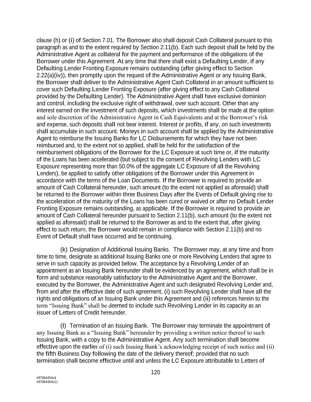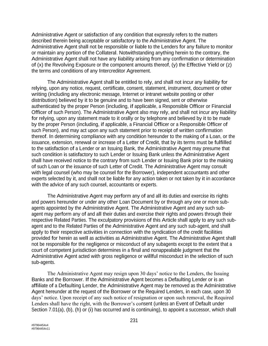 231 #97964454v4 #97964454v11 Administrative Agent or satisfaction of any condition that expressly refers to the matters described therein being acceptable or satisfactory to the Administrative Agent. The Administrative Agent shall not be responsible or liable to the Lenders for any failure to monitor or maintain any portion of the Collateral. Notwithstanding anything herein to the contrary, the Administrative Agent shall not have any liability arising from any confirmation or determination of (x) the Revolving Exposure or the component amounts thereof, (y) the Effective Yield or (z) the terms and conditions of any Intercreditor Agreement. The Administrative Agent shall be entitled to rely, and shall not incur any liability for relying, upon any notice, request, certificate, consent, statement, instrument, document or other writing (including any electronic message, Internet or intranet website posting or other distribution) believed by it to be genuine and to have been signed, sent or otherwise authenticated by the proper Person (including, if applicable, a Responsible Officer or Financial Officer of such Person). The Administrative Agent also may rely, and shall not incur any liability for relying, upon any statement made to it orally or by telephone and believed by it to be made by the proper Person (including, if applicable, a Financial Officer or a Responsible Officer of such Person), and may act upon any such statement prior to receipt of written confirmation thereof. In determining compliance with any condition hereunder to the making of a Loan, or the issuance, extension, renewal or increase of a Letter of Credit, that by its terms must be fulfilled to the satisfaction of a Lender or an Issuing Bank, the Administrative Agent may presume that such condition is satisfactory to such Lender or Issuing Bank unless the Administrative Agent shall have received notice to the contrary from such Lender or Issuing Bank prior to the making of such Loan or the issuance of such Letter of Credit. The Administrative Agent may consult with legal counsel (who may be counsel for the Borrower), independent accountants and other experts selected by it, and shall not be liable for any action taken or not taken by it in accordance with the advice of any such counsel, accountants or experts. The Administrative Agent may perform any of and all its duties and exercise its rights and powers hereunder or under any other Loan Document by or through any one or more sub- agents appointed by the Administrative Agent. The Administrative Agent and any such sub- agent may perform any of and all their duties and exercise their rights and powers through their respective Related Parties. The exculpatory provisions of this Article shall apply to any such sub- agent and to the Related Parties of the Administrative Agent and any such sub-agent, and shall apply to their respective activities in connection with the syndication of the credit facilities provided for herein as well as activities as Administrative Agent. The Administrative Agent shall not be responsible for the negligence or misconduct of any subagents except to the extent that a court of competent jurisdiction determines in a final and nonappealable judgment that the Administrative Agent acted with gross negligence or willful misconduct in the selection of such sub-agents. The Administrative Agent may resign upon 30 days’ notice to the Lenders, the Issuing Banks and the Borrower. If the Administrative Agent becomes a Defaulting Lender or is an affiliate of a Defaulting Lender, the Administrative Agent may be removed as the Administrative Agent hereunder at the request of the Borrower or the Required Lenders, in each case, upon 30 days’ notice. Upon receipt of any such notice of resignation or upon such removal, the Required Lenders shall have the right, with the Borrower’s consent (unless an Event of Default under Section 7.01(a), (b), (h) or (i) has occurred and is continuing), to appoint a successor, which shall