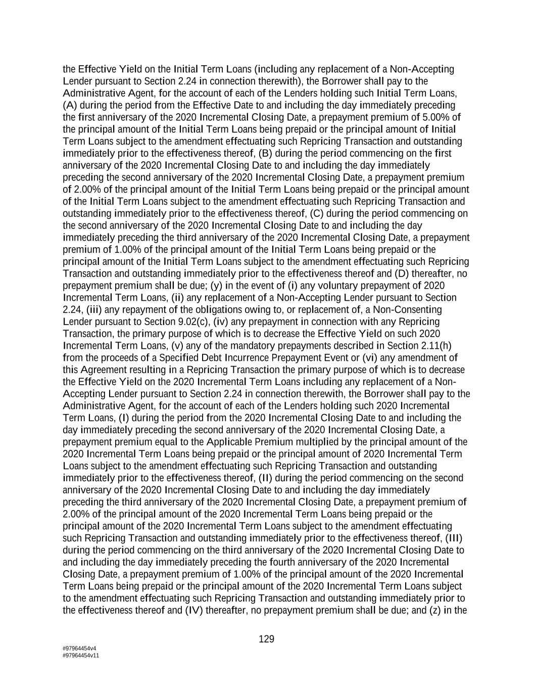 8 #97964454v4 #97964454v11 Section 2.11(a) (including any premium required pursuant to Section 2.11(a)), and (II) each scheduled payment of interest to be made on such Loan on or after such Prepayment Date through (and including) the date that is two years after the 2020 Incremental Closing Date (but, in the case of the first such scheduled payment of interest, excluding any amount of interest accrued prior to the Prepayment Date), in each case, discounted to the Prepayment Date on a quarterly basis (assuming a 360-day year consisting of twelve 30-day months) at the Treasury Rate as of such Prepayment Date plus 50 basis points, minus (ii) accrued but unpaid interest to, but excluding, the Prepayment Date over (b) the principal amount of such Loan, divided by (B) the principal amount of such Loan. Calculation of the Applicable Premium will be made by the Borrower or on behalf of the Borrower by such Person as the Borrower shall designate (and the amount of the Applicable Premium shall be provided by the Borrower to the Administrative Agent promptly following the calculation thereof); provided that such calculation or the correctness thereof shall not be a duty or obligation of the Administrative Agent. “Applicable Rate” means, for any day, (a) with respect to any Initial Term Loan (i) prior to the Amendment No. 8 Effective Date, (x) that is an ABR Loan, 5.50% per annum or (y) that is a SOFR Loan, 6.50% per annum, and (ii) from and after the Amendment No. 8 Effective Date, (x) that is an ABR Loan, 6.50% per annum or (y) that is a SOFR Loan, 7.50% per annum, and (iii) from and after the Amendment No. 11 Effective Date, as follows Period ABR Loans SOFR Loans From and after the Amendment No. 11 Effective Date through and including August 31, 2024 6.50% 7.50% Thereafter 7.00% 8.00% (b) with respect to any 2020 Incremental Term Loan (i) prior to the Amendment No. 8 Effective Date, (x) that is an ABR Loan, 5.50% per annum or (y) that is a SOFR Loan, 6.50% per annum, and (ii) from and after the Amendment No. 8 Effective Date, (x) that is an ABR Loan, 6.50% per annum or (y) that is a SOFR Loan, 7.50% per annum, and (iii) from and after the Amendment No. 11 Effective Date, as follows Period ABR Loans SOFR Loans From and after the Amendment No. 11 Effective Date through and including August 31, 2024 6.50% 7.50% Thereafter 7.00% 8.00%