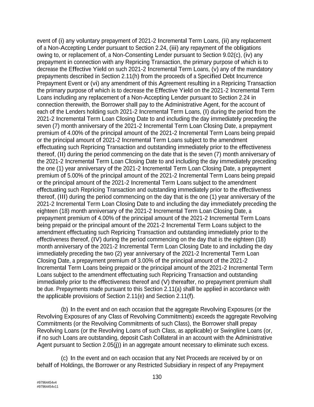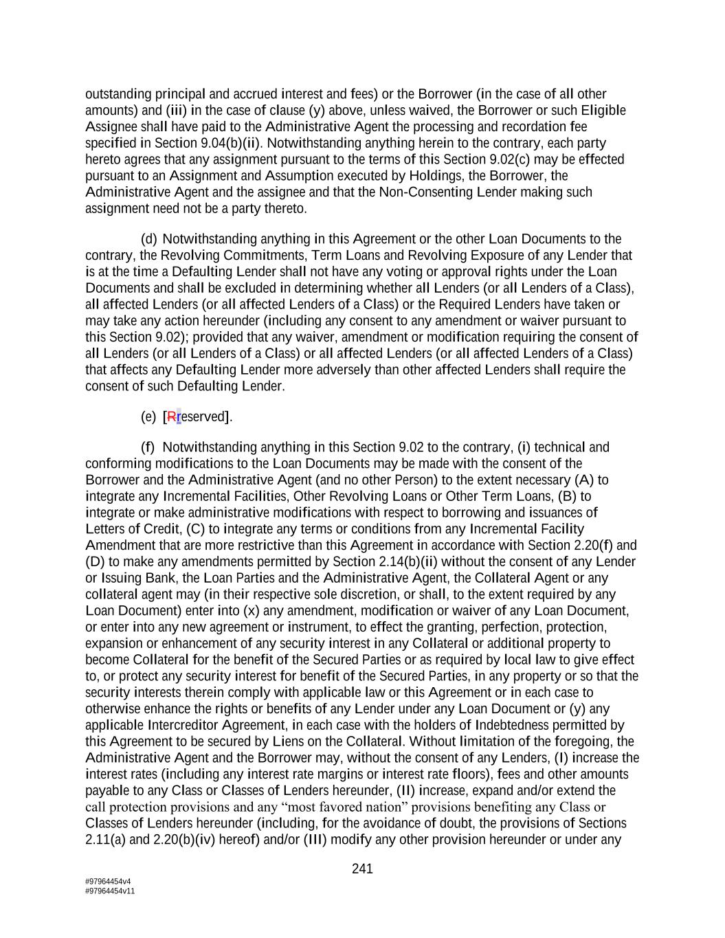 241 #97964454v4 #97964454v11 outstanding principal and accrued interest and fees) or the Borrower (in the case of all other amounts) and (iii) in the case of clause (y) above, unless waived, the Borrower or such Eligible Assignee shall have paid to the Administrative Agent the processing and recordation fee specified in Section 9.04(b)(ii). Notwithstanding anything herein to the contrary, each party hereto agrees that any assignment pursuant to the terms of this Section 9.02(c) may be effected pursuant to an Assignment and Assumption executed by Holdings, the Borrower, the Administrative Agent and the assignee and that the Non-Consenting Lender making such assignment need not be a party thereto. (d) Notwithstanding anything in this Agreement or the other Loan Documents to the contrary, the Revolving Commitments, Term Loans and Revolving Exposure of any Lender that is at the time a Defaulting Lender shall not have any voting or approval rights under the Loan Documents and shall be excluded in determining whether all Lenders (or all Lenders of a Class), all affected Lenders (or all affected Lenders of a Class) or the Required Lenders have taken or may take any action hereunder (including any consent to any amendment or waiver pursuant to this Section 9.02); provided that any waiver, amendment or modification requiring the consent of all Lenders (or all Lenders of a Class) or all affected Lenders (or all affected Lenders of a Class) that affects any Defaulting Lender more adversely than other affected Lenders shall require the consent of such Defaulting Lender. (e) [Rreserved]. (f) Notwithstanding anything in this Section 9.02 to the contrary, (i) technical and conforming modifications to the Loan Documents may be made with the consent of the Borrower and the Administrative Agent (and no other Person) to the extent necessary (A) to integrate any Incremental Facilities, Other Revolving Loans or Other Term Loans, (B) to integrate or make administrative modifications with respect to borrowing and issuances of Letters of Credit, (C) to integrate any terms or conditions from any Incremental Facility Amendment that are more restrictive than this Agreement in accordance with Section 2.20(f) and (D) to make any amendments permitted by Section 2.14(b)(ii) without the consent of any Lender or Issuing Bank, the Loan Parties and the Administrative Agent, the Collateral Agent or any collateral agent may (in their respective sole discretion, or shall, to the extent required by any Loan Document) enter into (x) any amendment, modification or waiver of any Loan Document, or enter into any new agreement or instrument, to effect the granting, perfection, protection, expansion or enhancement of any security interest in any Collateral or additional property to become Collateral for the benefit of the Secured Parties or as required by local law to give effect to, or protect any security interest for benefit of the Secured Parties, in any property or so that the security interests therein comply with applicable law or this Agreement or in each case to otherwise enhance the rights or benefits of any Lender under any Loan Document or (y) any applicable Intercreditor Agreement, in each case with the holders of Indebtedness permitted by this Agreement to be secured by Liens on the Collateral. Without limitation of the foregoing, the Administrative Agent and the Borrower may, without the consent of any Lenders, (I) increase the interest rates (including any interest rate margins or interest rate floors), fees and other amounts payable to any Class or Classes of Lenders hereunder, (II) increase, expand and/or extend the call protection provisions and any “most favored nation” provisions benefiting any Class or Classes of Lenders hereunder (including, for the avoidance of doubt, the provisions of Sections 2.11(a) and 2.20(b)(iv) hereof) and/or (III) modify any other provision hereunder or under any