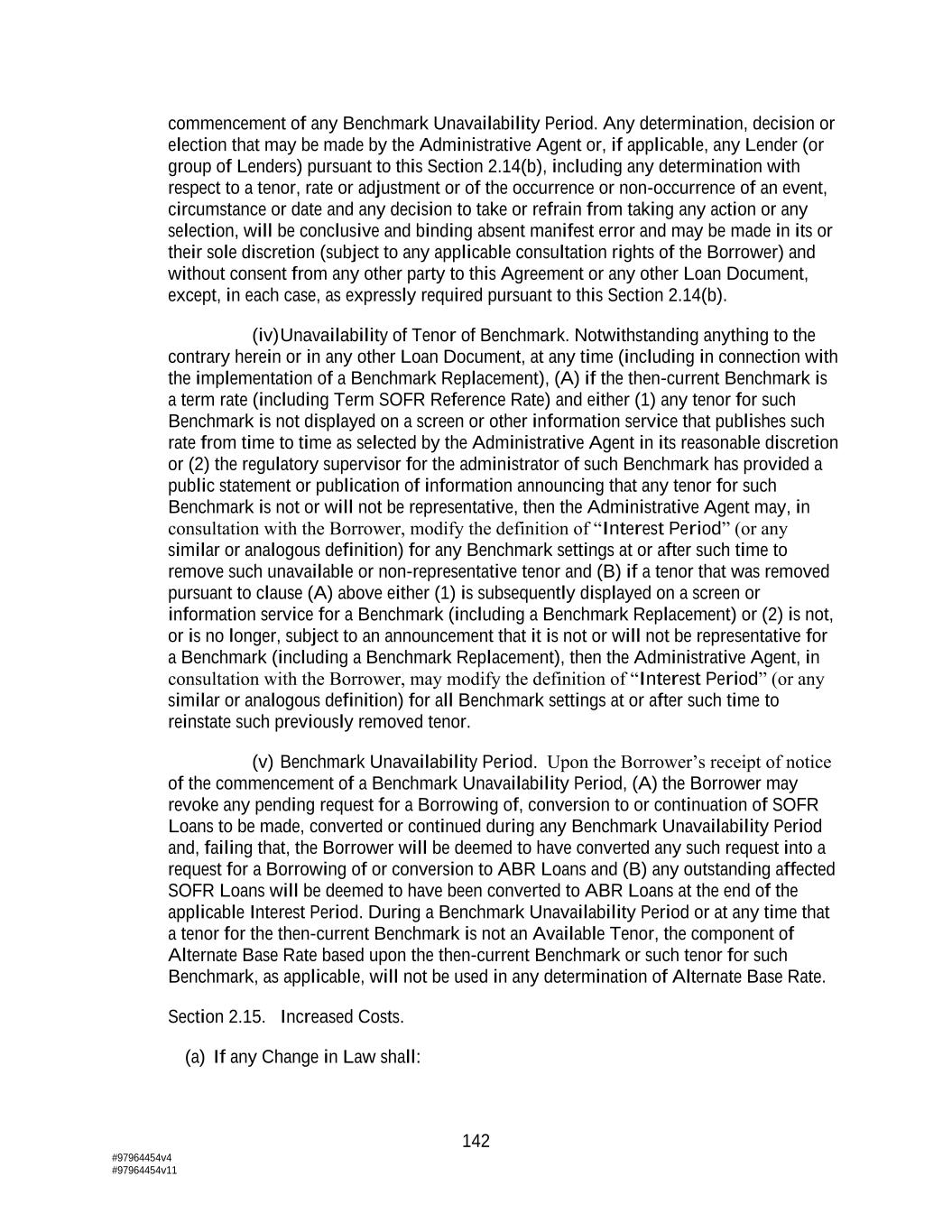 14 #97964454v4 #97964454v11 (or such component thereof) or, if such Benchmark is a term rate, all Available Tenors of such Benchmark (or such component thereof); or (b) in the case of clause (c) of the definition of “Benchmark Transition Event,” the first date on which all Available Tenors of such Benchmark (or the published component used in the calculation thereof) has been or, if such Benchmark is a term rate, all Available Tenors of such Benchmark (or such component thereof) have been determined and announced by the regulatory supervisor for the administrator of such Benchmark (or such component thereof) to be non-representative; provided that such non-representativeness will be determined by reference to the most recent statement or publication referenced in such clause (c) and even if such Benchmark (or such component thereof) or, if such Benchmark is a term rate, any Available Tenor of such Benchmark (or such component thereof) continues to be provided on such date. For the avoidance of doubt, if such Benchmark is a term rate, the “Benchmark Replacement Date” will be deemed to have occurred in the case of clause (a) or (b) with respect to any Benchmark upon the occurrence of the applicable event or events set forth therein with respect to all then-current Available Tenors of such Benchmark (or the published component used in the calculation thereof). “Benchmark Transition Event” means the occurrence of one or more of the following events with respect to the then-current Benchmark: (a) a public statement or publication of information by or on behalf of the administrator of such Benchmark (or the published component used in the calculation thereof) announcing that such administrator has ceased or will cease to provide such Benchmark (or such component thereof) or, if such Benchmark is a term rate, all Available Tenors of such Benchmark (or such component thereof), permanently or indefinitely; provided that, at the time of such statement or publication, there is no successor administrator that will continue to provide such Benchmark (or such component thereof) or, if such Benchmark is a term rate, any Available Tenor of such Benchmark (or such component thereof); (b) a public statement or publication of information by the regulatory supervisor for the administrator of such Benchmark (or the published component used in the calculation thereof), the Federal Reserve Board, the Federal Reserve Bank of New York, an insolvency official with jurisdiction over the administrator for such Benchmark (or such component), a resolution authority with jurisdiction over the administrator for such Benchmark (or such component) or a court or an entity with similar insolvency or resolution authority over the administrator for such Benchmark (or such component), which states that the administrator of such Benchmark (or such component) has ceased or will cease to provide such Benchmark (or such component thereof) or, if such Benchmark is a term rate, all Available Tenors of such Benchmark (or such component thereof) permanently or indefinitely; provided that, at the time of such statement or publication, there is no successor administrator that will continue to provide such Benchmark (or such component thereof) or, if such Benchmark is a term rate, any Available Tenor of such Benchmark (or such component thereof); or (c) a public statement or publication of information by the regulatory supervisor for the administrator of such Benchmark (or the published component used in the calculation