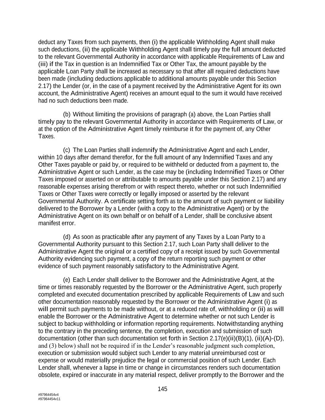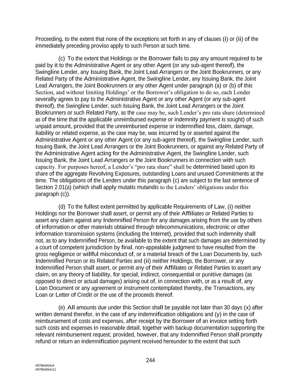 244 #97964454v4 #97964454v11 Proceeding, to the extent that none of the exceptions set forth in any of clauses (i) or (ii) of the immediately preceding proviso apply to such Person at such time. (c) To the extent that Holdings or the Borrower fails to pay any amount required to be paid by it to the Administrative Agent or any other Agent (or any sub-agent thereof), the Swingline Lender, any Issuing Bank, the Joint Lead Arrangers or the Joint Bookrunners, or any Related Party of the Administrative Agent, the Swingline Lender, any Issuing Bank, the Joint Lead Arrangers, the Joint Bookrunners or any other Agent under paragraph (a) or (b) of this Section, and without limiting Holdings’ or the Borrower’s obligation to do so, each Lender severally agrees to pay to the Administrative Agent or any other Agent (or any sub-agent thereof), the Swingline Lender, such Issuing Bank, the Joint Lead Arrangers or the Joint Bookrunners or such Related Party, as the case may be, such Lender’s pro rata share (determined as of the time that the applicable unreimbursed expense or indemnity payment is sought) of such unpaid amount, provided that the unreimbursed expense or indemnified loss, claim, damage, liability or related expense, as the case may be, was incurred by or asserted against the Administrative Agent or any other Agent (or any sub-agent thereof), the Swingline Lender, such Issuing Bank, the Joint Lead Arrangers or the Joint Bookrunners, or against any Related Party of the Administrative Agent acting for the Administrative Agent, the Swingline Lender, such Issuing Bank, the Joint Lead Arrangers or the Joint Bookrunners in connection with such capacity. For purposes hereof, a Lender’s “pro rata share” shall be determined based upon its share of the aggregate Revolving Exposures, outstanding Loans and unused Commitments at the time. The obligations of the Lenders under this paragraph (c) are subject to the last sentence of Section 2.01(a) (which shall apply mutatis mutandis to the Lenders’ obligations under this paragraph (c)). (d) To the fullest extent permitted by applicable Requirements of Law, (i) neither Holdings nor the Borrower shall assert, or permit any of their Affiliates or Related Parties to assert any claim against any Indemnified Person for any damages arising from the use by others of information or other materials obtained through telecommunications, electronic or other information transmission systems (including the Internet), provided that such indemnity shall not, as to any Indemnified Person, be available to the extent that such damages are determined by a court of competent jurisdiction by final, non-appealable judgment to have resulted from the gross negligence or willful misconduct of, or a material breach of the Loan Documents by, such Indemnified Person or its Related Parties and (ii) neither Holdings, the Borrower, or any Indemnified Person shall assert, or permit any of their Affiliates or Related Parties to assert any claim, on any theory of liability, for special, indirect, consequential or punitive damages (as opposed to direct or actual damages) arising out of, in connection with, or as a result of, any Loan Document or any agreement or instrument contemplated thereby, the Transactions, any Loan or Letter of Credit or the use of the proceeds thereof. (e) All amounts due under this Section shall be payable not later than 30 days (x) after written demand therefor, in the case of any indemnification obligations and (y) in the case of reimbursement of costs and expenses, after receipt by the Borrower of an invoice setting forth such costs and expenses in reasonable detail, together with backup documentation supporting the relevant reimbursement request; provided, however, that any Indemnified Person shall promptly refund or return an indemnification payment received hereunder to the extent that such