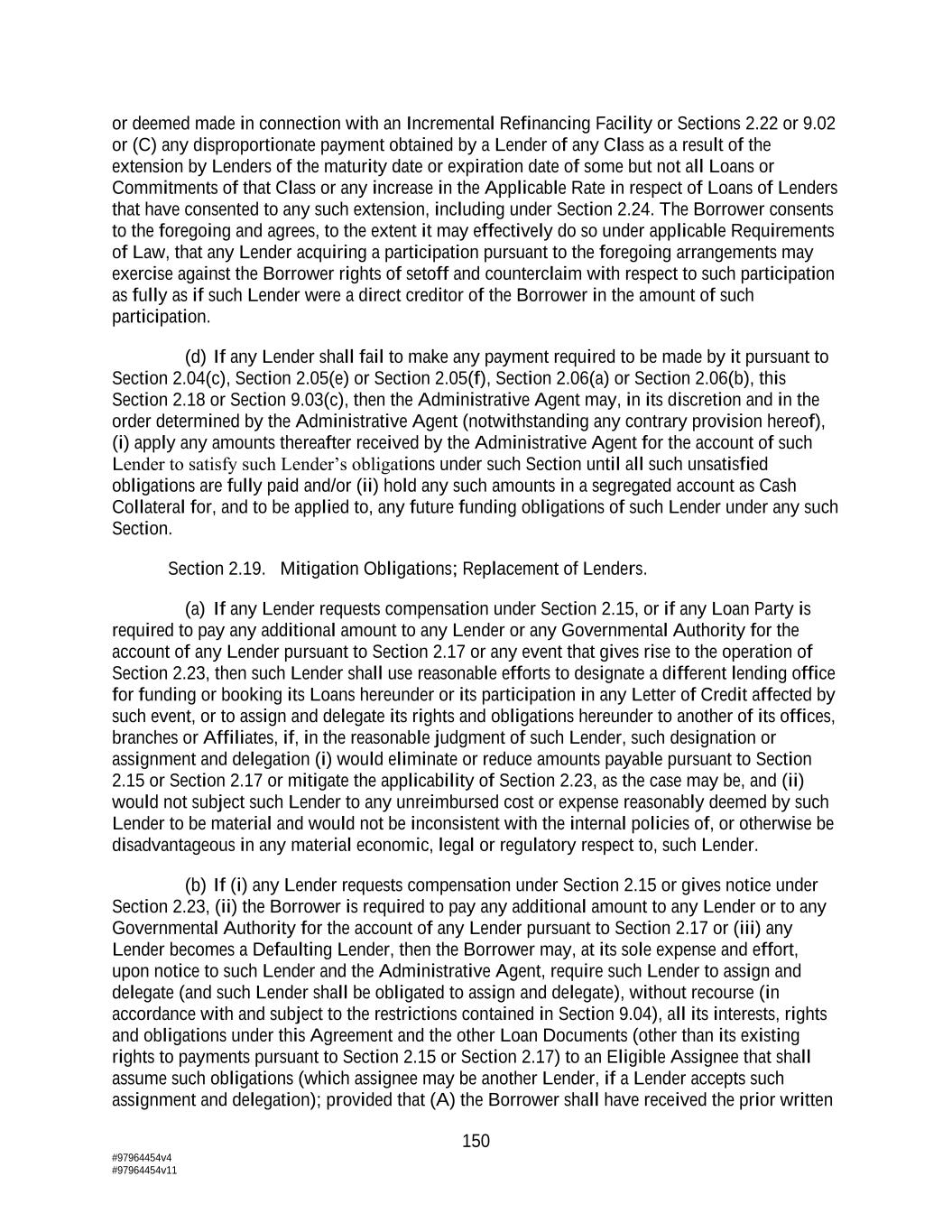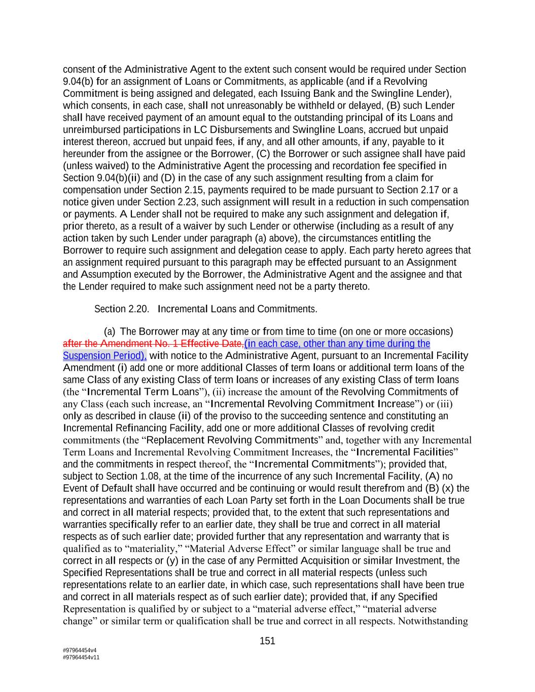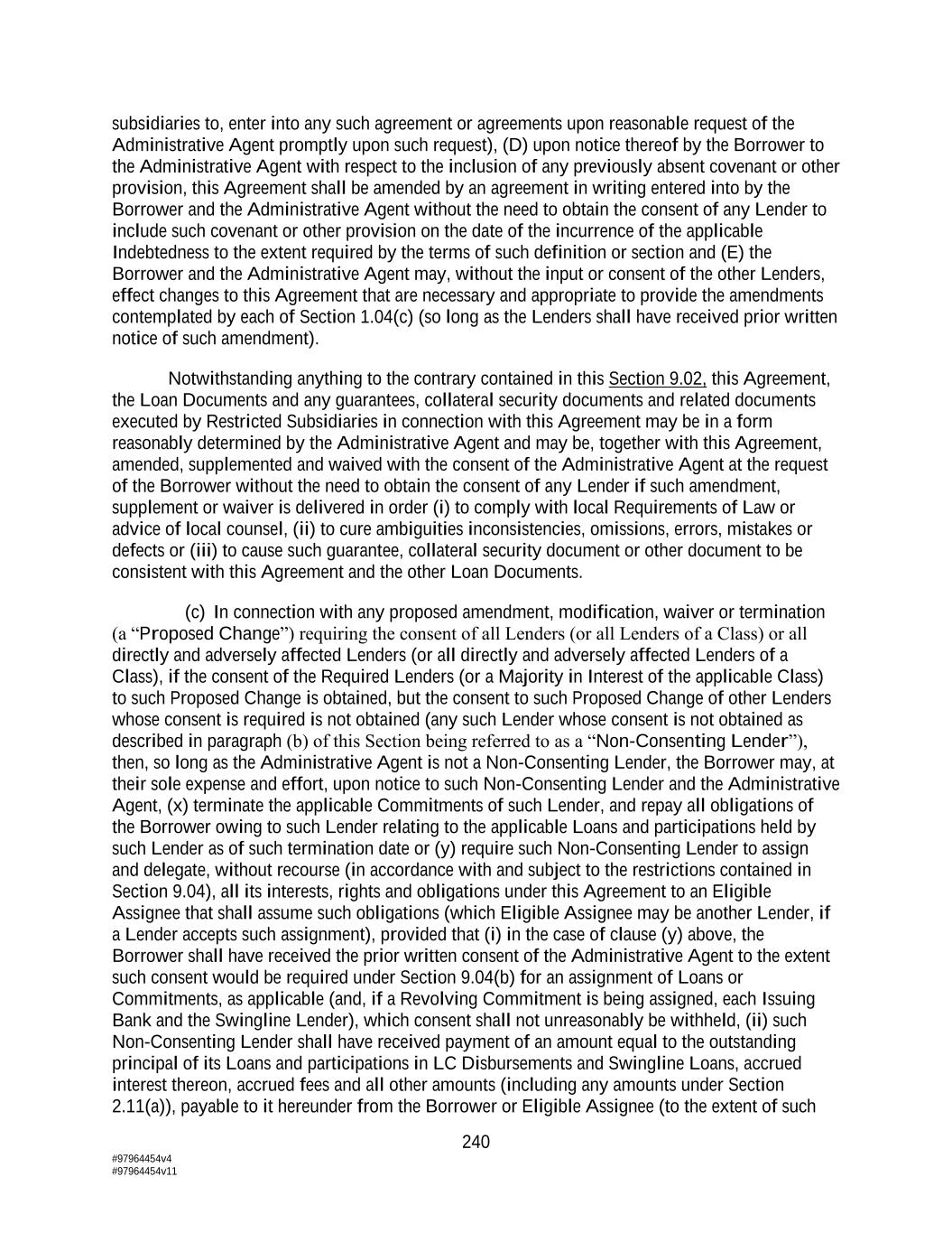 240 #97964454v4 #97964454v11 subsidiaries to, enter into any such agreement or agreements upon reasonable request of the Administrative Agent promptly upon such request), (D) upon notice thereof by the Borrower to the Administrative Agent with respect to the inclusion of any previously absent covenant or other provision, this Agreement shall be amended by an agreement in writing entered into by the Borrower and the Administrative Agent without the need to obtain the consent of any Lender to include such covenant or other provision on the date of the incurrence of the applicable Indebtedness to the extent required by the terms of such definition or section and (E) the Borrower and the Administrative Agent may, without the input or consent of the other Lenders, effect changes to this Agreement that are necessary and appropriate to provide the amendments contemplated by each of Section 1.04(c) (so long as the Lenders shall have received prior written notice of such amendment). Notwithstanding anything to the contrary contained in this Section 9.02, this Agreement, the Loan Documents and any guarantees, collateral security documents and related documents executed by Restricted Subsidiaries in connection with this Agreement may be in a form reasonably determined by the Administrative Agent and may be, together with this Agreement, amended, supplemented and waived with the consent of the Administrative Agent at the request of the Borrower without the need to obtain the consent of any Lender if such amendment, supplement or waiver is delivered in order (i) to comply with local Requirements of Law or advice of local counsel, (ii) to cure ambiguities inconsistencies, omissions, errors, mistakes or defects or (iii) to cause such guarantee, collateral security document or other document to be consistent with this Agreement and the other Loan Documents. (c) In connection with any proposed amendment, modification, waiver or termination (a “Proposed Change”) requiring the consent of all Lenders (or all Lenders of a Class) or all directly and adversely affected Lenders (or all directly and adversely affected Lenders of a Class), if the consent of the Required Lenders (or a Majority in Interest of the applicable Class) to such Proposed Change is obtained, but the consent to such Proposed Change of other Lenders whose consent is required is not obtained (any such Lender whose consent is not obtained as described in paragraph (b) of this Section being referred to as a “Non-Consenting Lender”), then, so long as the Administrative Agent is not a Non-Consenting Lender, the Borrower may, at their sole expense and effort, upon notice to such Non-Consenting Lender and the Administrative Agent, (x) terminate the applicable Commitments of such Lender, and repay all obligations of the Borrower owing to such Lender relating to the applicable Loans and participations held by such Lender as of such termination date or (y) require such Non-Consenting Lender to assign and delegate, without recourse (in accordance with and subject to the restrictions contained in Section 9.04), all its interests, rights and obligations under this Agreement to an Eligible Assignee that shall assume such obligations (which Eligible Assignee may be another Lender, if a Lender accepts such assignment), provided that (i) in the case of clause (y) above, the Borrower shall have received the prior written consent of the Administrative Agent to the extent such consent would be required under Section 9.04(b) for an assignment of Loans or Commitments, as applicable (and, if a Revolving Commitment is being assigned, each Issuing Bank and the Swingline Lender), which consent shall not unreasonably be withheld, (ii) such Non-Consenting Lender shall have received payment of an amount equal to the outstanding principal of its Loans and participations in LC Disbursements and Swingline Loans, accrued interest thereon, accrued fees and all other amounts (including any amounts under Section 2.11(a)), payable to it hereunder from the Borrower or Eligible Assignee (to the extent of such
