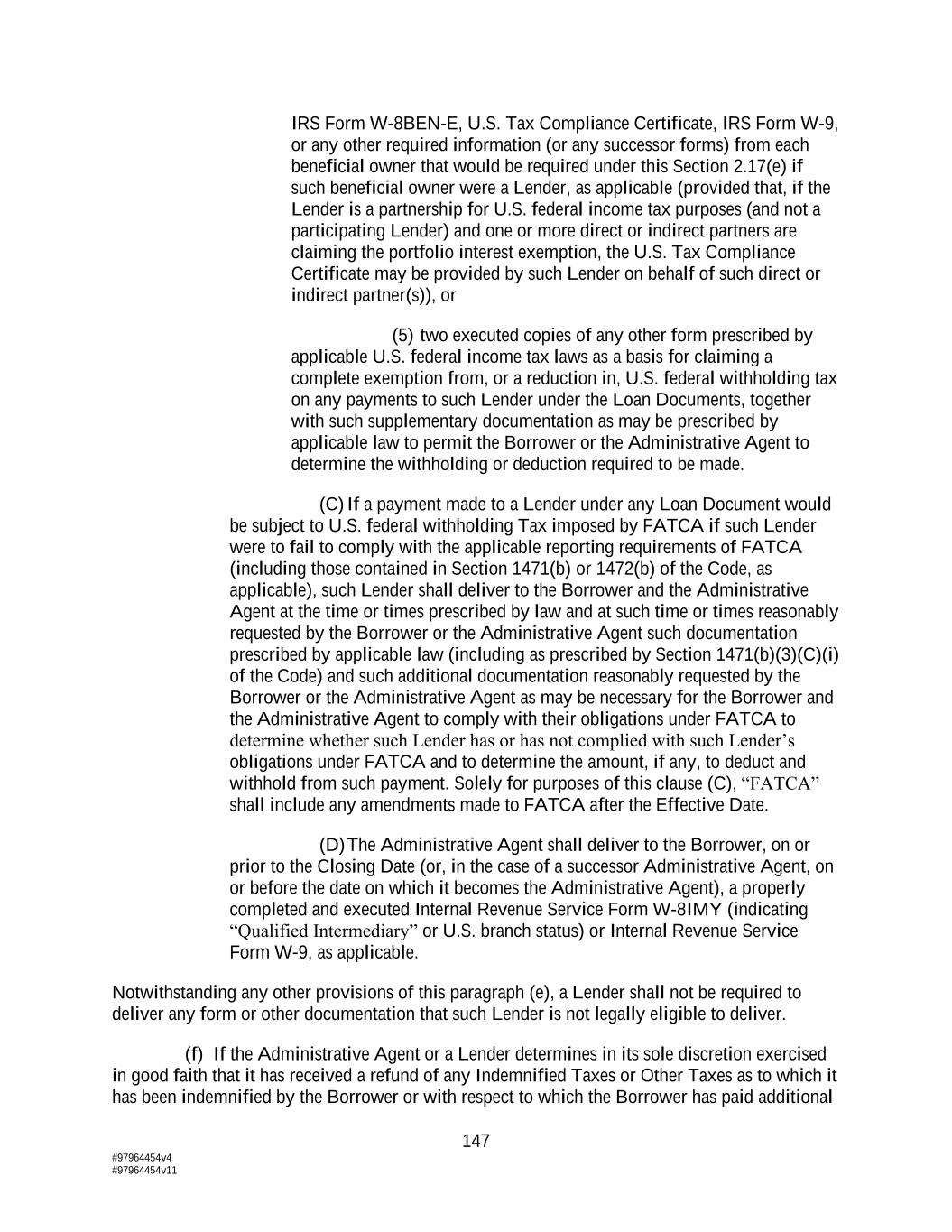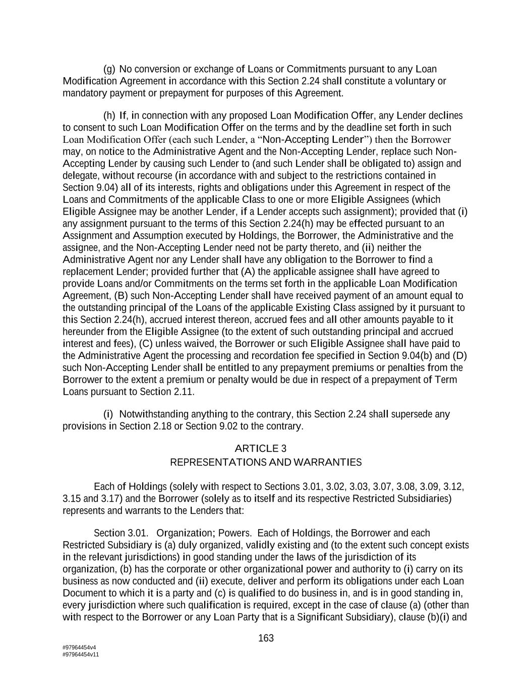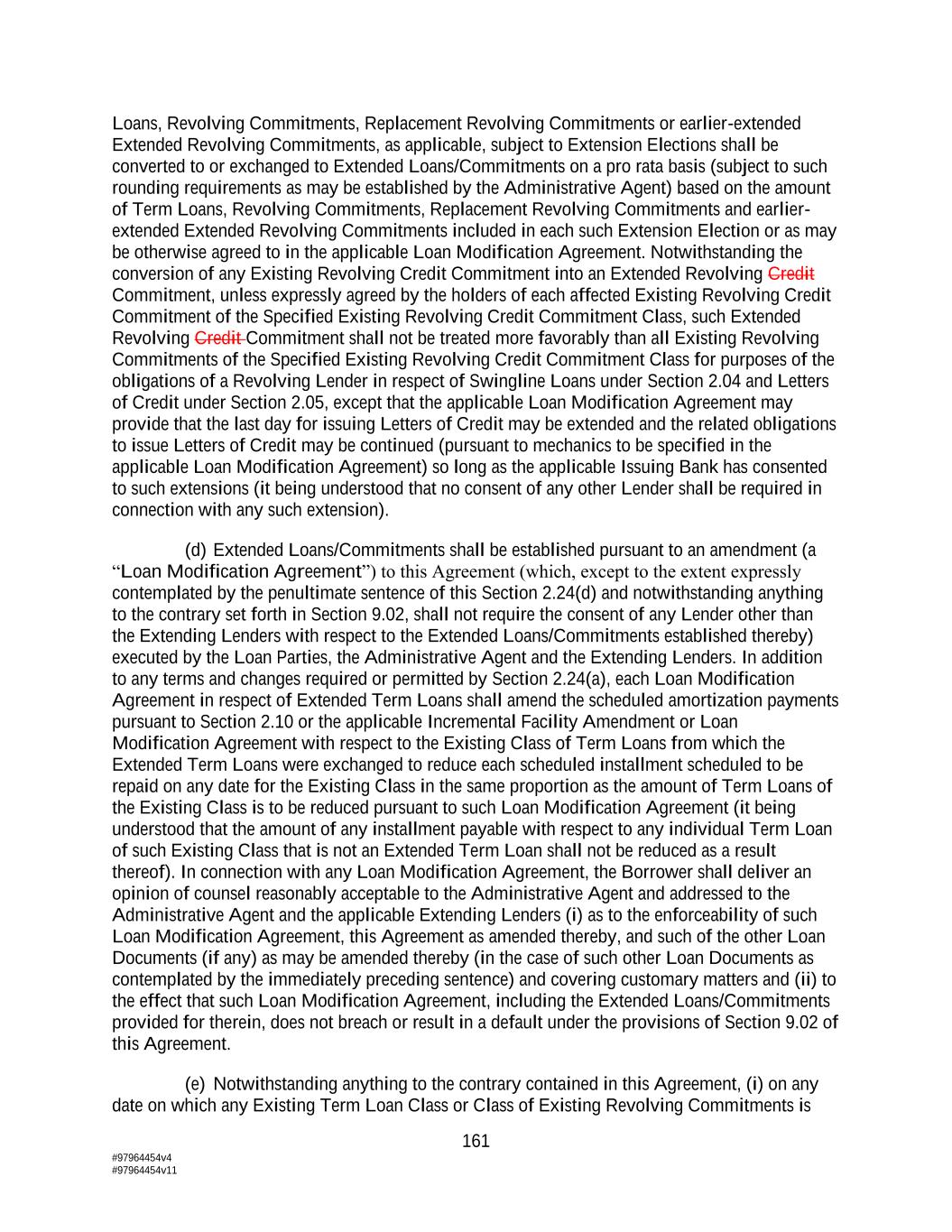 240 #97964454v4 #97964454v11 subsidiaries to, enter into any such agreement or agreements upon reasonable request of the Administrative Agent promptly upon such request), (D) upon notice thereof by the Borrower to the Administrative Agent with respect to the inclusion of any previously absent covenant or other provision, this Agreement shall be amended by an agreement in writing entered into by the Borrower and the Administrative Agent without the need to obtain the consent of any Lender to include such covenant or other provision on the date of the incurrence of the applicable Indebtedness to the extent required by the terms of such definition or section and (E) the Borrower and the Administrative Agent may, without the input or consent of the other Lenders, effect changes to this Agreement that are necessary and appropriate to provide the amendments contemplated by each of Section 1.04(c) (so long as the Lenders shall have received prior written notice of such amendment). Notwithstanding anything to the contrary contained in this Section 9.02, this Agreement, the Loan Documents and any guarantees, collateral security documents and related documents executed by Restricted Subsidiaries in connection with this Agreement may be in a form reasonably determined by the Administrative Agent and may be, together with this Agreement, amended, supplemented and waived with the consent of the Administrative Agent at the request of the Borrower without the need to obtain the consent of any Lender if such amendment, supplement or waiver is delivered in order (i) to comply with local Requirements of Law or advice of local counsel, (ii) to cure ambiguities inconsistencies, omissions, errors, mistakes or defects or (iii) to cause such guarantee, collateral security document or other document to be consistent with this Agreement and the other Loan Documents. (c) In connection with any proposed amendment, modification, waiver or termination (a “Proposed Change”) requiring the consent of all Lenders (or all Lenders of a Class) or all directly and adversely affected Lenders (or all directly and adversely affected Lenders of a Class), if the consent of the Required Lenders (or a Majority in Interest of the applicable Class) to such Proposed Change is obtained, but the consent to such Proposed Change of other Lenders whose consent is required is not obtained (any such Lender whose consent is not obtained as described in paragraph (b) of this Section being referred to as a “Non-Consenting Lender”), then, so long as the Administrative Agent is not a Non-Consenting Lender, the Borrower may, at their sole expense and effort, upon notice to such Non-Consenting Lender and the Administrative Agent, (x) terminate the applicable Commitments of such Lender, and repay all obligations of the Borrower owing to such Lender relating to the applicable Loans and participations held by such Lender as of such termination date or (y) require such Non-Consenting Lender to assign and delegate, without recourse (in accordance with and subject to the restrictions contained in Section 9.04), all its interests, rights and obligations under this Agreement to an Eligible Assignee that shall assume such obligations (which Eligible Assignee may be another Lender, if a Lender accepts such assignment), provided that (i) in the case of clause (y) above, the Borrower shall have received the prior written consent of the Administrative Agent to the extent such consent would be required under Section 9.04(b) for an assignment of Loans or Commitments, as applicable (and, if a Revolving Commitment is being assigned, each Issuing Bank and the Swingline Lender), which consent shall not unreasonably be withheld, (ii) such Non-Consenting Lender shall have received payment of an amount equal to the outstanding principal of its Loans and participations in LC Disbursements and Swingline Loans, accrued interest thereon, accrued fees and all other amounts (including any amounts under Section 2.11(a)), payable to it hereunder from the Borrower or Eligible Assignee (to the extent of such