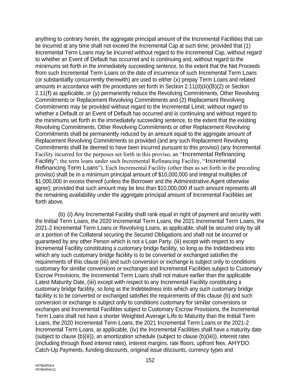 187 #97964454v4 #97964454v11 Business Days after receiving such offer from the Borrower (or the Administrative Agent or any arranger of such Indebtedness on behalf of the Borrower), on the terms specified by the Borrower, the Borrower may then offer such opportunity to other Persons (which may include existing Lenders). (xx) Indebtedness supported by a letter of credit issued in a principal amount not to exceed the face amount of such letter of credit; (xxi) Permitted Unsecured Refinancing Debt and any Permitted Refinancing thereof constituting Indebtedness of the Borrower or any other Loan Party; (xxii) Permitted Equal Priority Refinancing Debt and Permitted Junior Priority Refinancing Debt, and any Permitted Refinancing thereof constituting Indebtedness of the Borrower or any other Loan Party; (xxiii) (A) Indebtedness (the Indebtedness incurred pursuant to this Section 6.01(a)(xxiii), “Incremental Equivalent Debt”) of the Borrower or any other Loan Party consisting of (x) secured, subordinated or unsecured bonds, notes or debentures (which bonds, notes or debentures, if secured, may be secured by Liens on the Collateral having (or intended to have) a priority ranking junior to the Liens on the Collateral securing the Secured Obligations or (y) secured or unsecured loans (or commitments to provide loans or other extensions of credit) (which loans or commitments, if secured, may be secured by Liens on the Collateral having (or intended to have) a priority ranking junior to the Liens on the Collateral securing the Secured Obligations); provided that (1) the aggregate principal amount of all such Indebtedness incurred pursuant to this clause shall not exceed at the time of incurrence thereof and after giving pro forma effect to such incurrence and the use of proceeds thereof, the Incremental Cap at such time, (2) the Required Additional Debt Terms shall have been satisfied, (3) subject to Section 1.08, (A) no Event of Default shall have occurred and be continuing or would result therefrom, and (B) any Permitted Refinancing thereof, (4) the opportunity to commit to provide all or a portion of any Indebtedness incurred pursuant to this Section 6.01(a)(xxiii) shall be offered by the Borrower first to the existing Lenders on a pro rata basis and, to the extent that such existing Lenders have not agreed to provide such Indebtedness within five Business Days after receiving such offer from the Borrower (or the Administrative Agent or any arranger of such Indebtedness on behalf of the Borrower), on the terms specified by the Borrower, the Borrower may then offer such opportunity to other Persons (which may include existing Lenders).