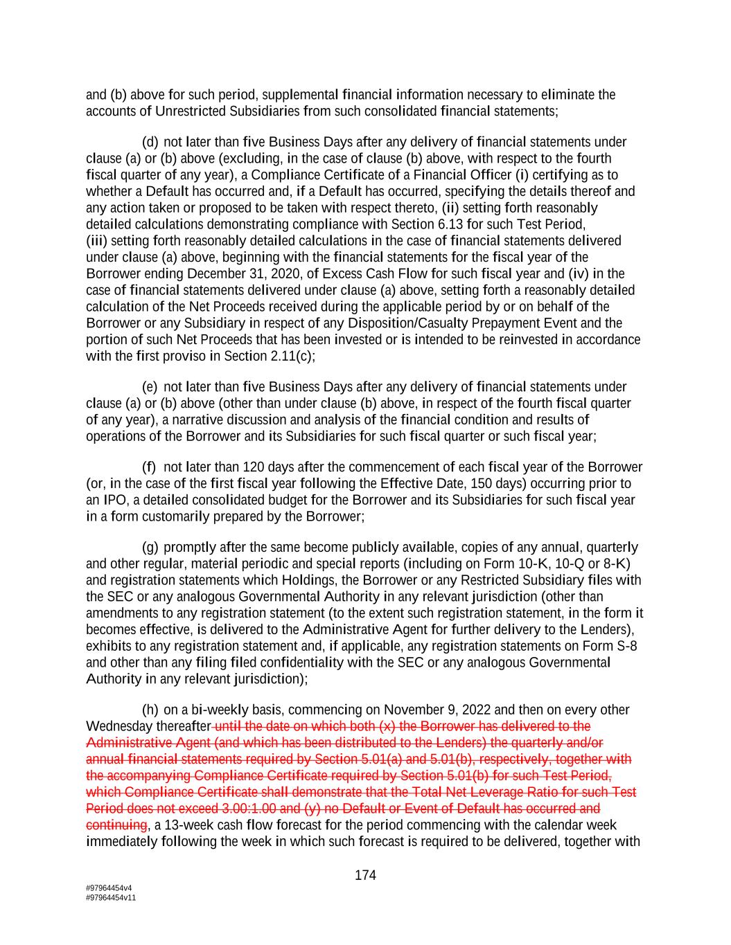 174 #97964454v4 #97964454v11 and (b) above for such period, supplemental financial information necessary to eliminate the accounts of Unrestricted Subsidiaries from such consolidated financial statements; (d) not later than five Business Days after any delivery of financial statements under clause (a) or (b) above (excluding, in the case of clause (b) above, with respect to the fourth fiscal quarter of any year), a Compliance Certificate of a Financial Officer (i) certifying as to whether a Default has occurred and, if a Default has occurred, specifying the details thereof and any action taken or proposed to be taken with respect thereto, (ii) setting forth reasonably detailed calculations demonstrating compliance with Section 6.13 for such Test Period, (iii) setting forth reasonably detailed calculations in the case of financial statements delivered under clause (a) above, beginning with the financial statements for the fiscal year of the Borrower ending December 31, 2020, of Excess Cash Flow for such fiscal year and (iv) in the case of financial statements delivered under clause (a) above, setting forth a reasonably detailed calculation of the Net Proceeds received during the applicable period by or on behalf of the Borrower or any Subsidiary in respect of any Disposition/Casualty Prepayment Event and the portion of such Net Proceeds that has been invested or is intended to be reinvested in accordance with the first proviso in Section 2.11(c); (e) not later than five Business Days after any delivery of financial statements under clause (a) or (b) above (other than under clause (b) above, in respect of the fourth fiscal quarter of any year), a narrative discussion and analysis of the financial condition and results of operations of the Borrower and its Subsidiaries for such fiscal quarter or such fiscal year; (f) not later than 120 days after the commencement of each fiscal year of the Borrower (or, in the case of the first fiscal year following the Effective Date, 150 days) occurring prior to an IPO, a detailed consolidated budget for the Borrower and its Subsidiaries for such fiscal year in a form customarily prepared by the Borrower; (g) promptly after the same become publicly available, copies of any annual, quarterly and other regular, material periodic and special reports (including on Form 10-K, 10-Q or 8-K) and registration statements which Holdings, the Borrower or any Restricted Subsidiary files with the SEC or any analogous Governmental Authority in any relevant jurisdiction (other than amendments to any registration statement (to the extent such registration statement, in the form it becomes effective, is delivered to the Administrative Agent for further delivery to the Lenders), exhibits to any registration statement and, if applicable, any registration statements on Form S-8 and other than any filing filed confidentiality with the SEC or any analogous Governmental Authority in any relevant jurisdiction); (h) on a bi-weekly basis, commencing on November 9, 2022 and then on every other Wednesday thereafter until the date on which both (x) the Borrower has delivered to the Administrative Agent (and which has been distributed to the Lenders) the quarterly and/or annual financial statements required by Section 5.01(a) and 5.01(b), respectively, together with the accompanying Compliance Certificate required by Section 5.01(b) for such Test Period, which Compliance Certificate shall demonstrate that the Total Net Leverage Ratio for such Test Period does not exceed 3.00:1.00 and (y) no Default or Event of Default has occurred and continuing, a 13-week cash flow forecast for the period commencing with the calendar week immediately following the week in which such forecast is required to be delivered, together with