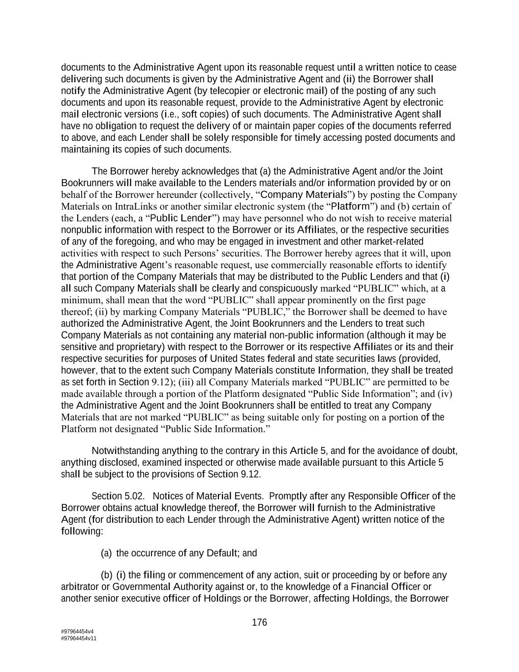 176 #97964454v4 #97964454v11 documents to the Administrative Agent upon its reasonable request until a written notice to cease delivering such documents is given by the Administrative Agent and (ii) the Borrower shall notify the Administrative Agent (by telecopier or electronic mail) of the posting of any such documents and upon its reasonable request, provide to the Administrative Agent by electronic mail electronic versions (i.e., soft copies) of such documents. The Administrative Agent shall have no obligation to request the delivery of or maintain paper copies of the documents referred to above, and each Lender shall be solely responsible for timely accessing posted documents and maintaining its copies of such documents. The Borrower hereby acknowledges that (a) the Administrative Agent and/or the Joint Bookrunners will make available to the Lenders materials and/or information provided by or on behalf of the Borrower hereunder (collectively, “Company Materials”) by posting the Company Materials on IntraLinks or another similar electronic system (the “Platform”) and (b) certain of the Lenders (each, a “Public Lender”) may have personnel who do not wish to receive material nonpublic information with respect to the Borrower or its Affiliates, or the respective securities of any of the foregoing, and who may be engaged in investment and other market-related activities with respect to such Persons’ securities. The Borrower hereby agrees that it will, upon the Administrative Agent’s reasonable request, use commercially reasonable efforts to identify that portion of the Company Materials that may be distributed to the Public Lenders and that (i) all such Company Materials shall be clearly and conspicuously marked “PUBLIC” which, at a minimum, shall mean that the word “PUBLIC” shall appear prominently on the first page thereof; (ii) by marking Company Materials “PUBLIC,” the Borrower shall be deemed to have authorized the Administrative Agent, the Joint Bookrunners and the Lenders to treat such Company Materials as not containing any material non-public information (although it may be sensitive and proprietary) with respect to the Borrower or its respective Affiliates or its and their respective securities for purposes of United States federal and state securities laws (provided, however, that to the extent such Company Materials constitute Information, they shall be treated as set forth in Section 9.12); (iii) all Company Materials marked “PUBLIC” are permitted to be made available through a portion of the Platform designated “Public Side Information”; and (iv) the Administrative Agent and the Joint Bookrunners shall be entitled to treat any Company Materials that are not marked “PUBLIC” as being suitable only for posting on a portion of the Platform not designated “Public Side Information.” Notwithstanding anything to the contrary in this Article 5, and for the avoidance of doubt, anything disclosed, examined inspected or otherwise made available pursuant to this Article 5 shall be subject to the provisions of Section 9.12. Section 5.02. Notices of Material Events. Promptly after any Responsible Officer of the Borrower obtains actual knowledge thereof, the Borrower will furnish to the Administrative Agent (for distribution to each Lender through the Administrative Agent) written notice of the following: (a) the occurrence of any Default; and (b) (i) the filing or commencement of any action, suit or proceeding by or before any arbitrator or Governmental Authority against or, to the knowledge of a Financial Officer or another senior executive officer of Holdings or the Borrower, affecting Holdings, the Borrower